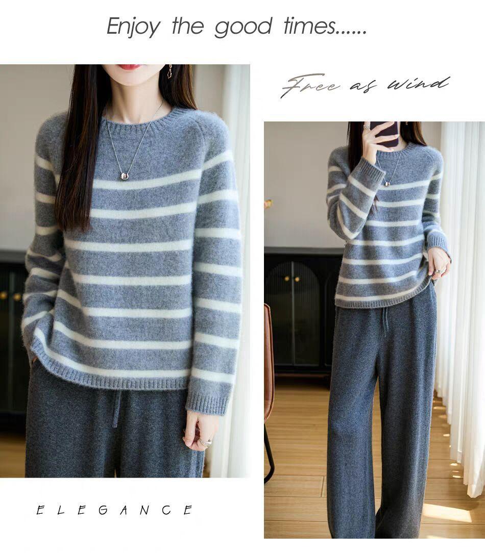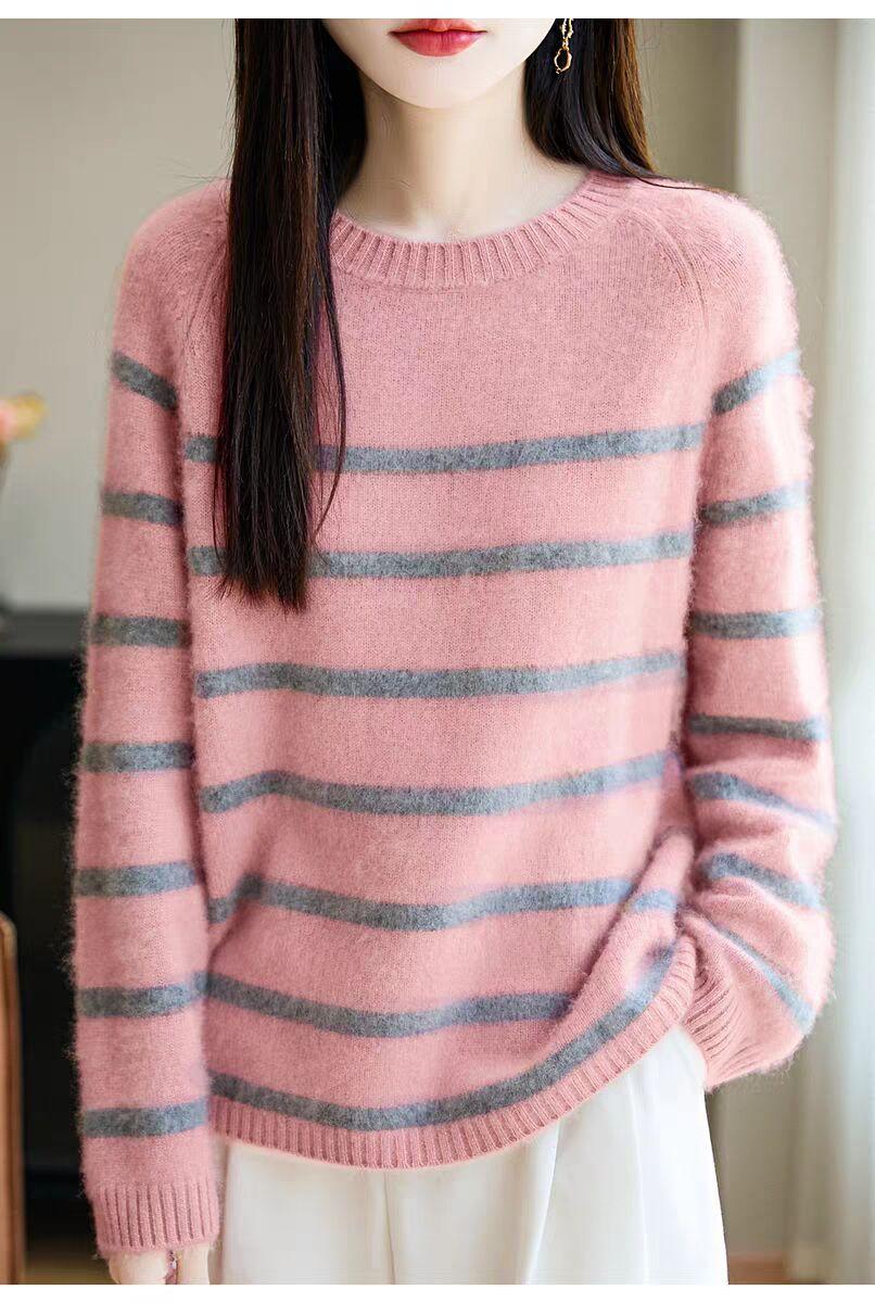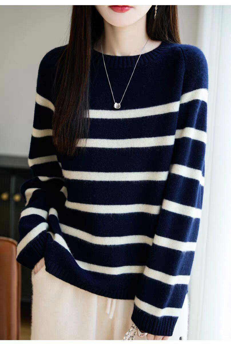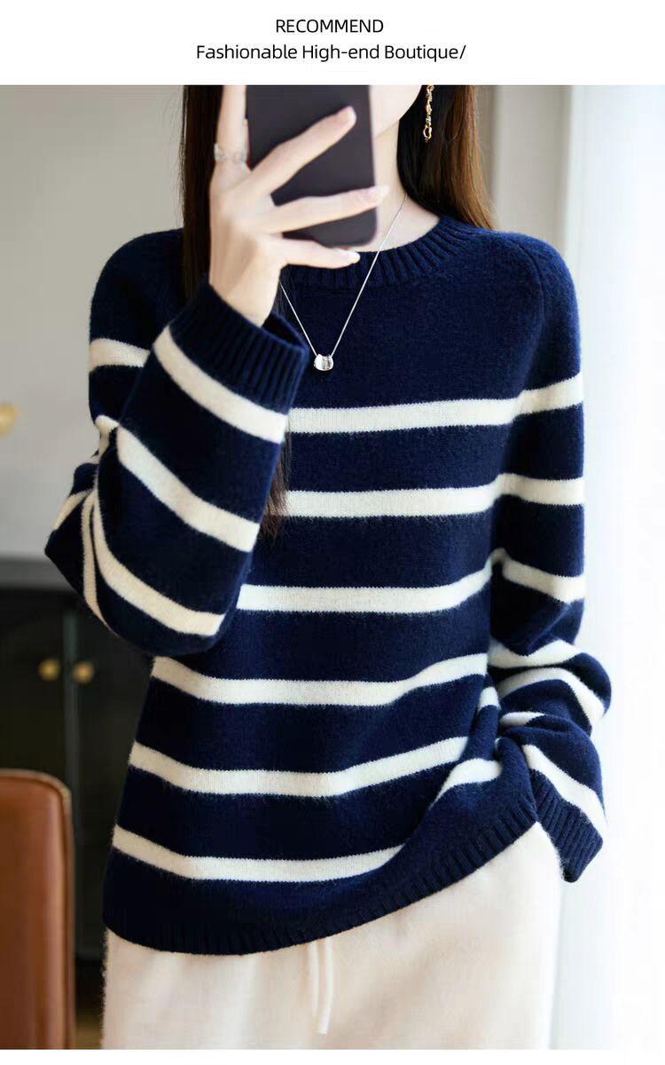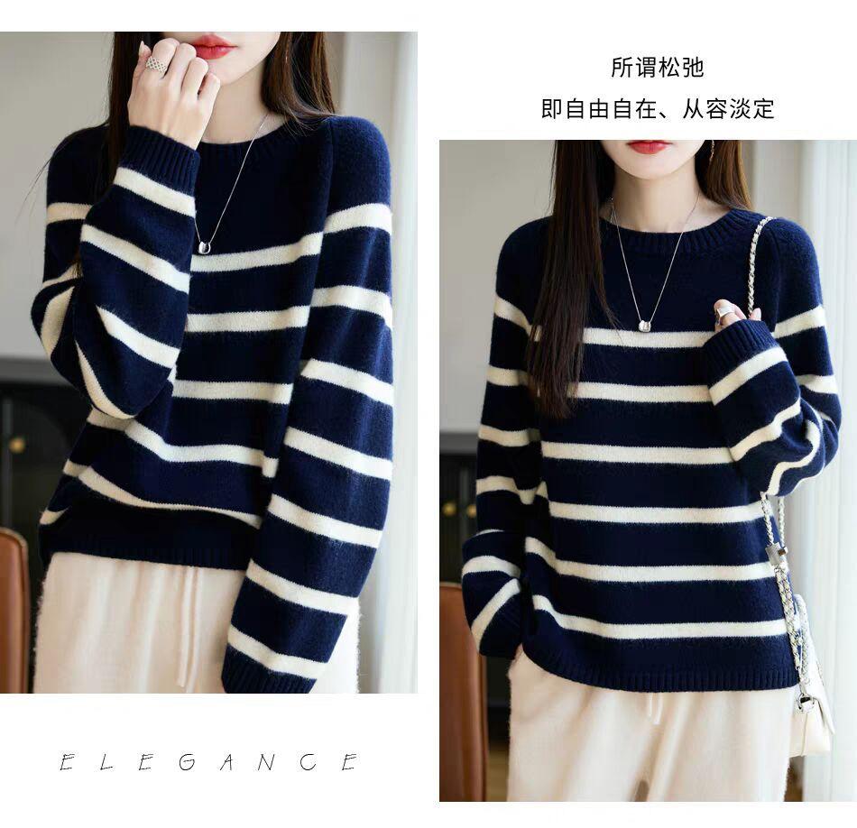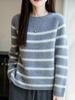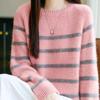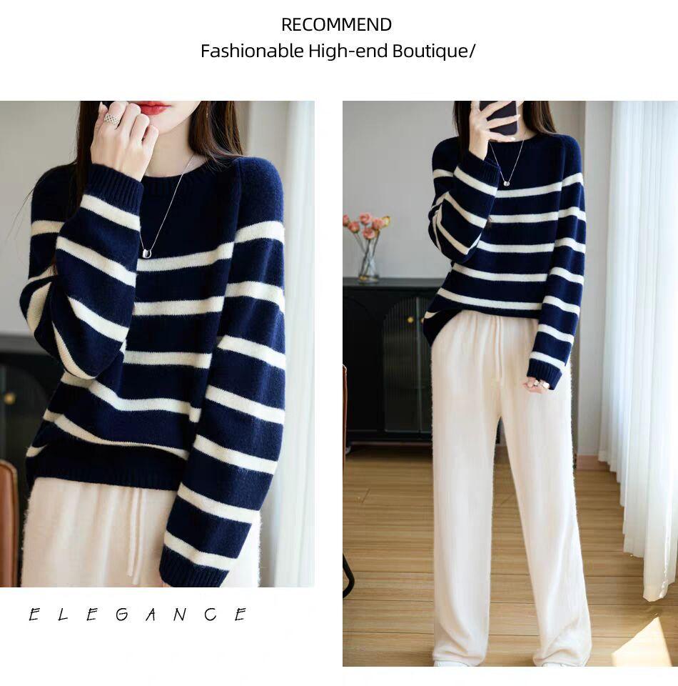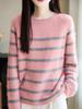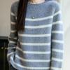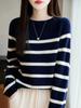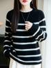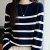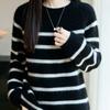 Suéter Tricotado Feminino Outono/Inverno 2025 Novo Moderno e Estiloso Gola Redonda Listrado Colorblock Versátil Manga Longa