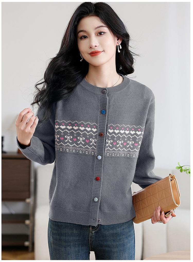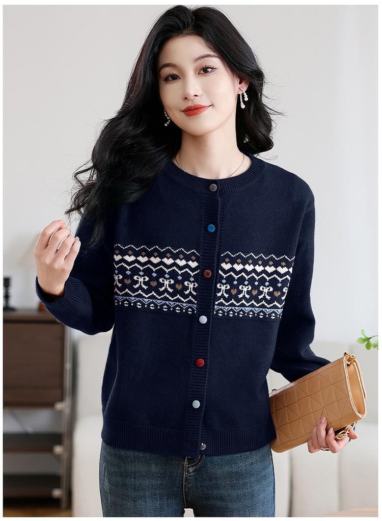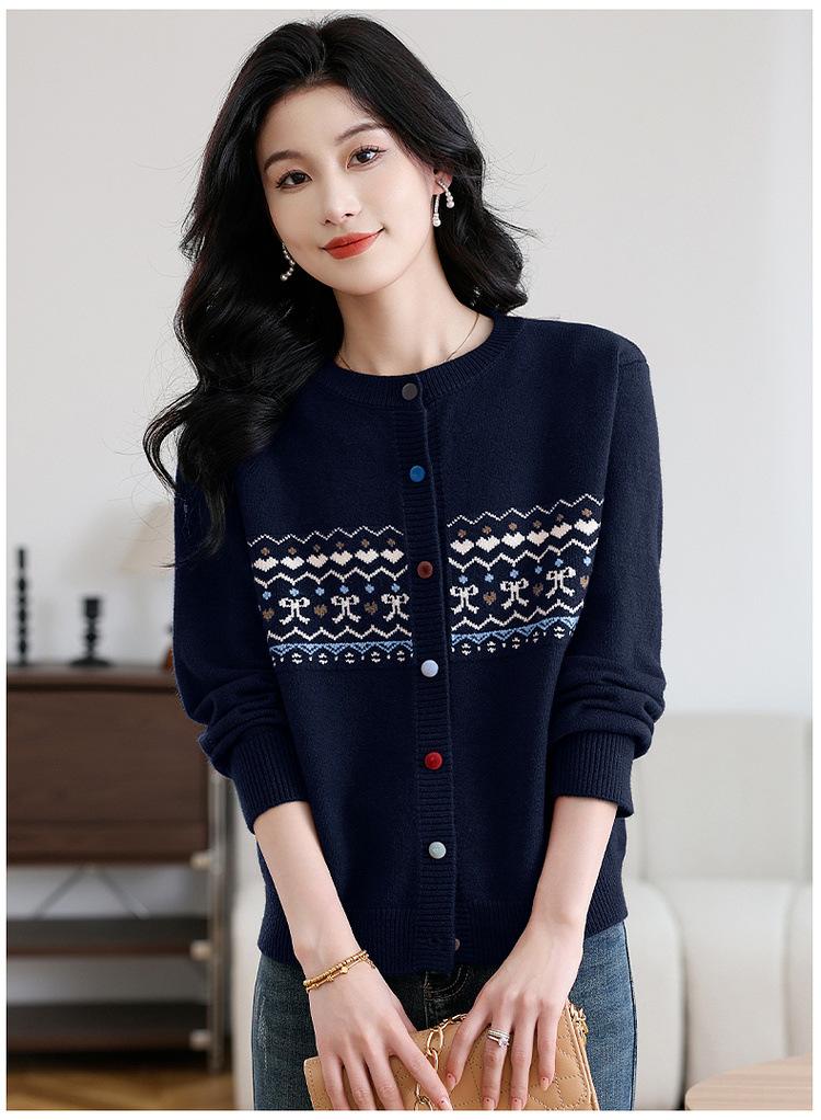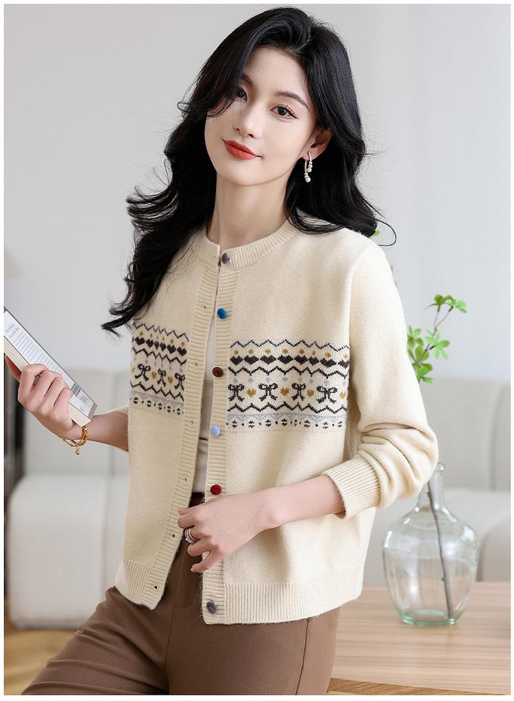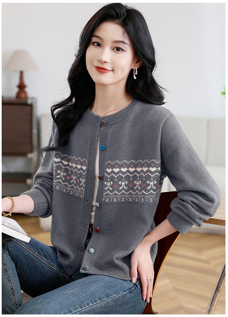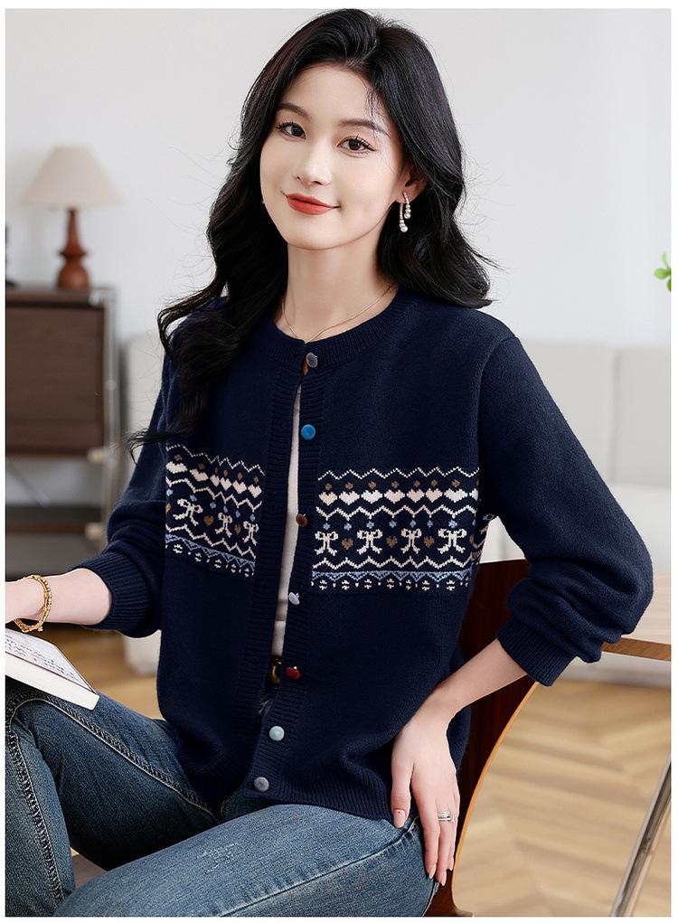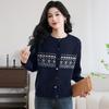 Novo Suéter Solto Casual Macio Feminino Outono/Inverno 2025 Cardigã Feminino Tricot Jacquard Bloco de Cores Retrô