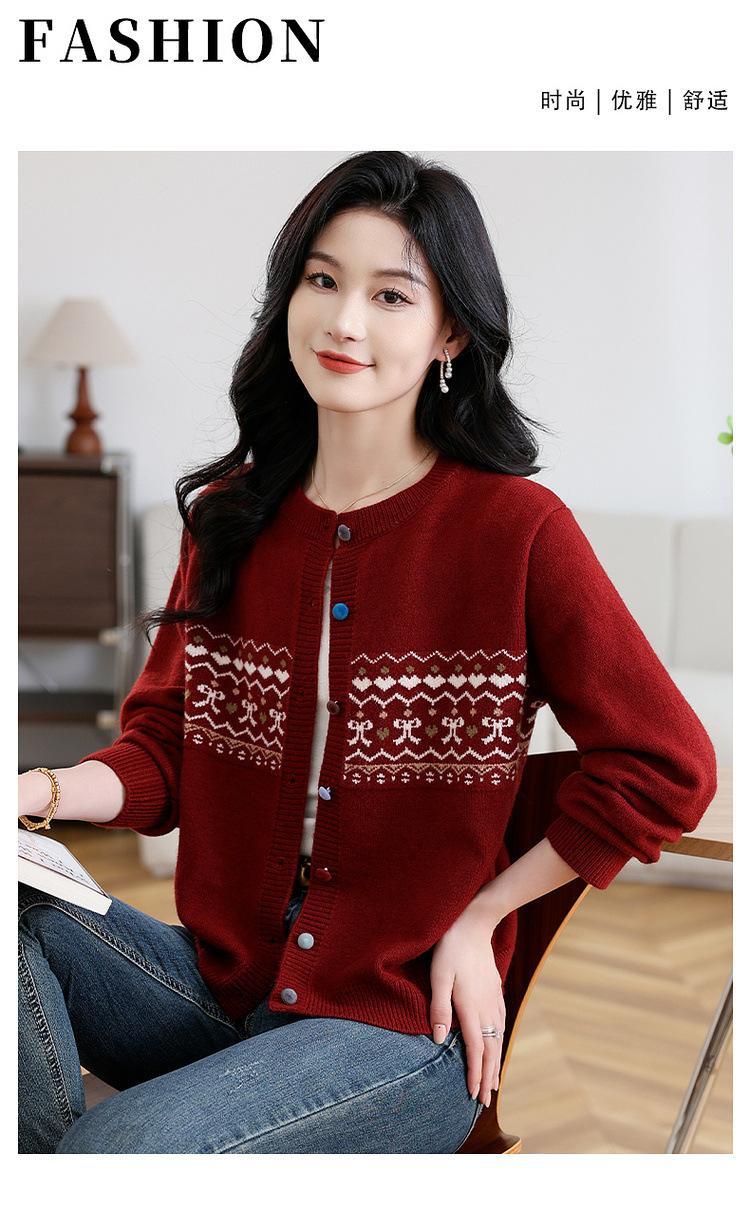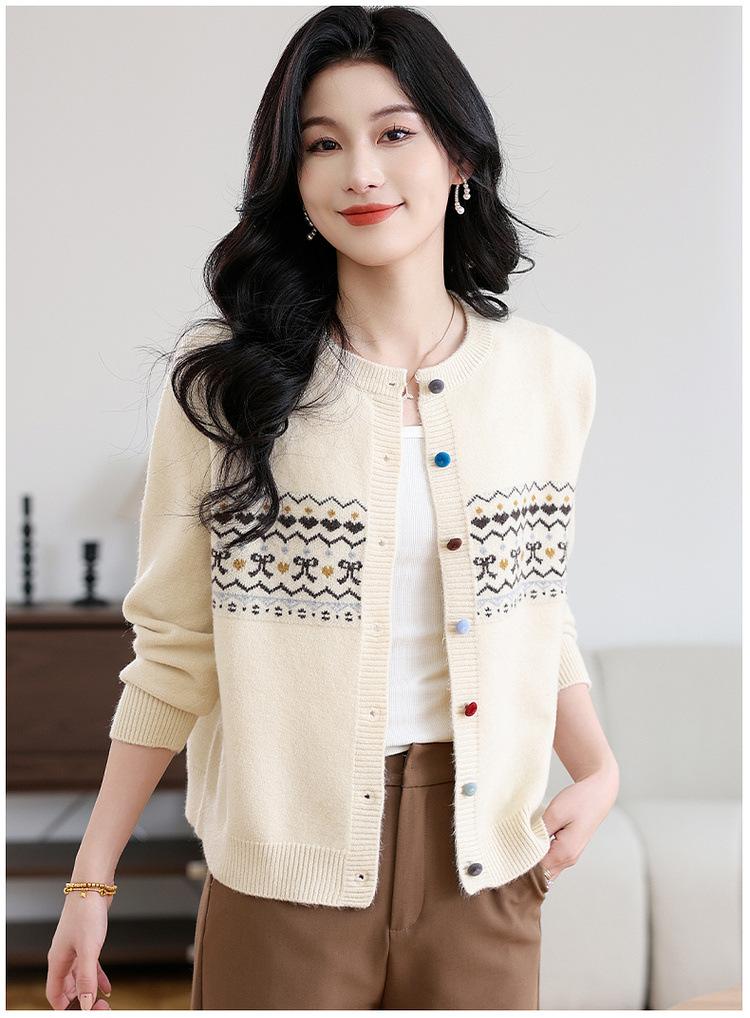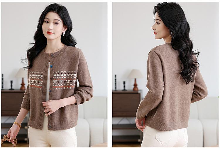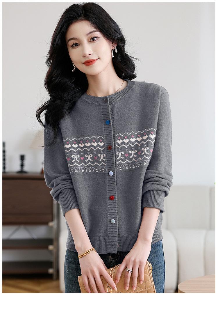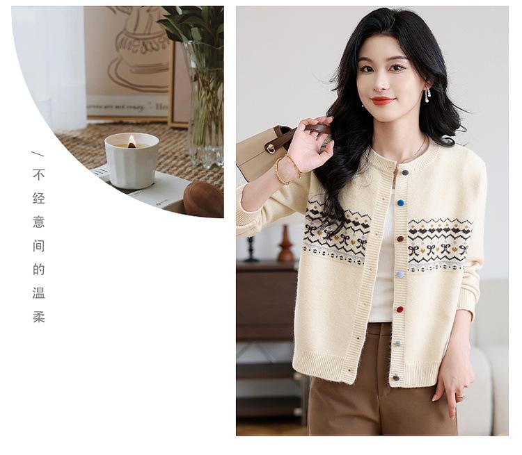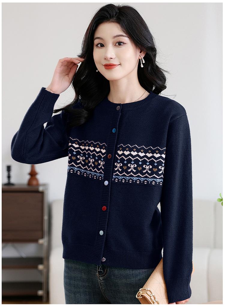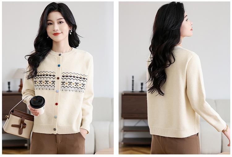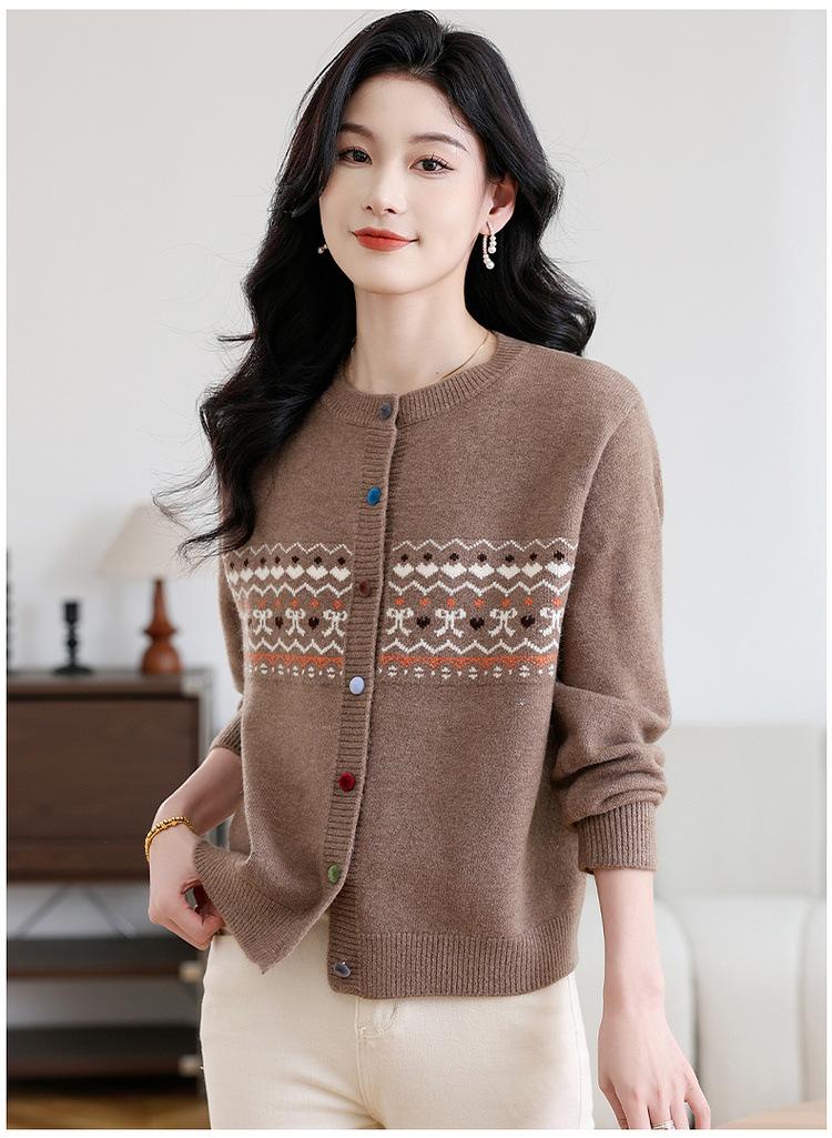 Novo Suéter Solto Casual Macio Feminino Outono/Inverno 2025 Cardigã Feminino Tricot Jacquard Bloco de Cores Retrô