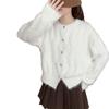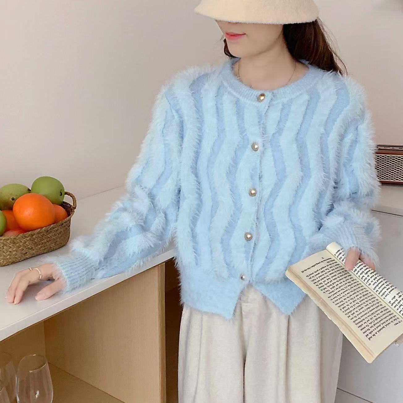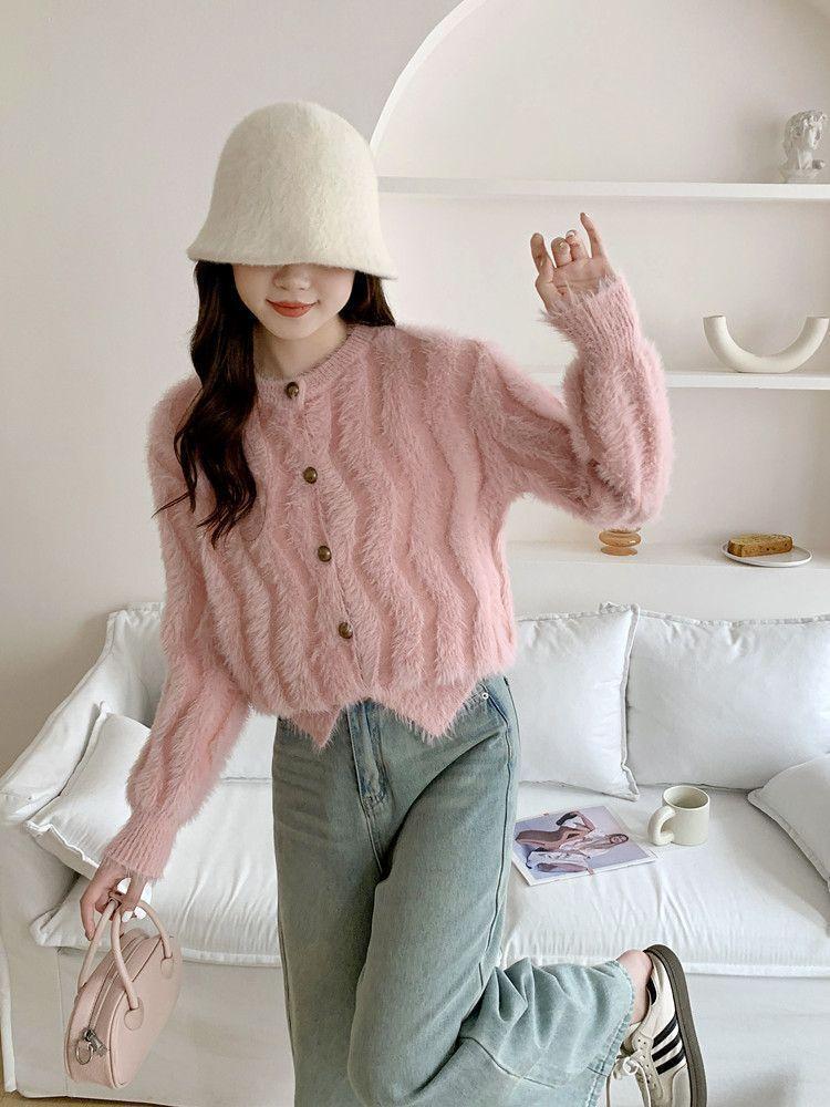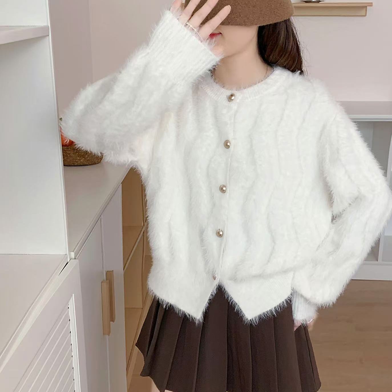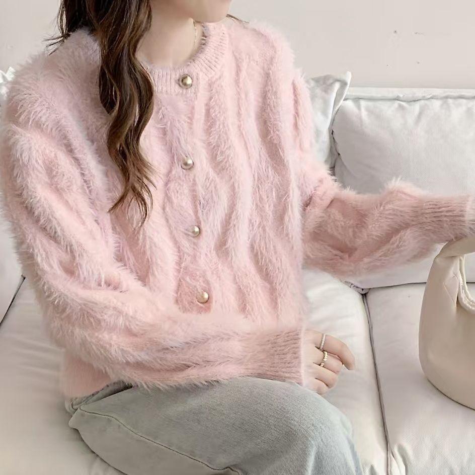 Casaco Suéter de Veludo Vison Imitação Macio e Encerado para Mulheres 2025 Outono e Inverno Novo Cardigã Tricotado Doce Francês Solto High-End