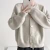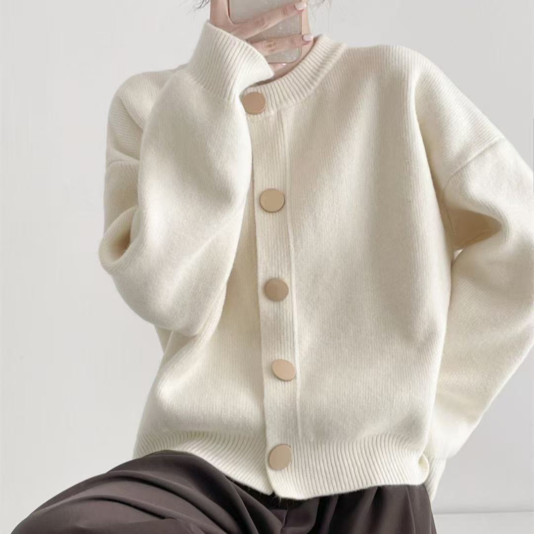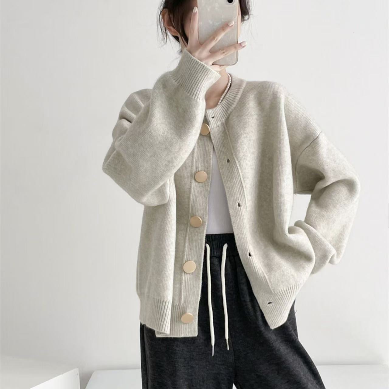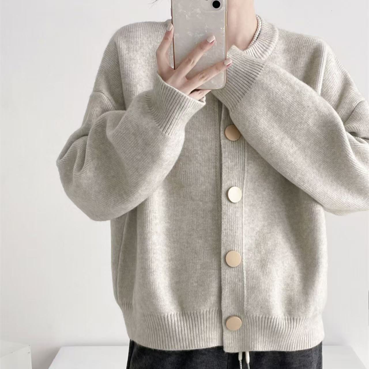 Senso de design casaco de tricô cardigã trespassado cor sólida primavera e outono estilo preguiçoso novo solto gola redonda primavera e outono top