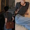 Suéter Feminino de Manga Longa Bordado Listrado Color Block Huang Zheng Outono/Inverno 2025 Solto Gola Redonda Pulôver Top de Tricô 530080