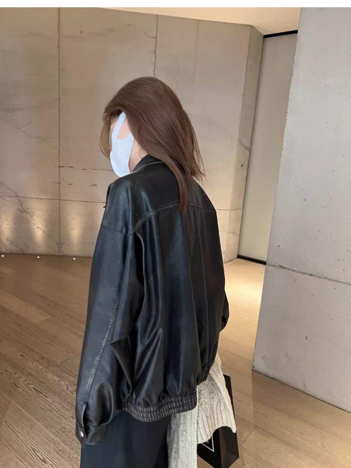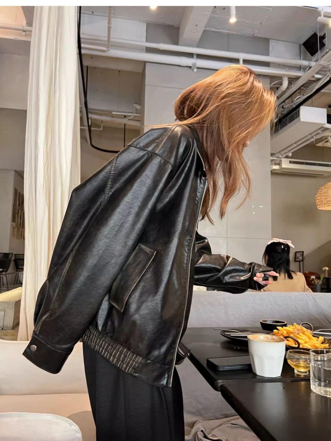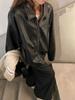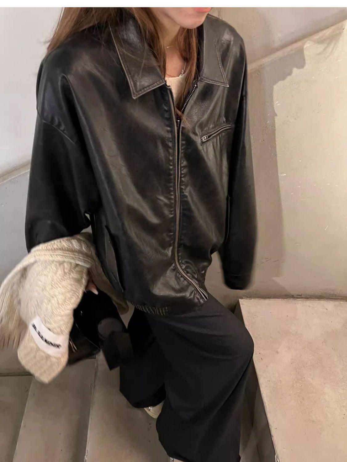 Jaqueta de couro preta minimalista retrô de manga comprida para mulheres, novo estilo de outono 2025, estilo motociclista, roupa exterior americana de PU