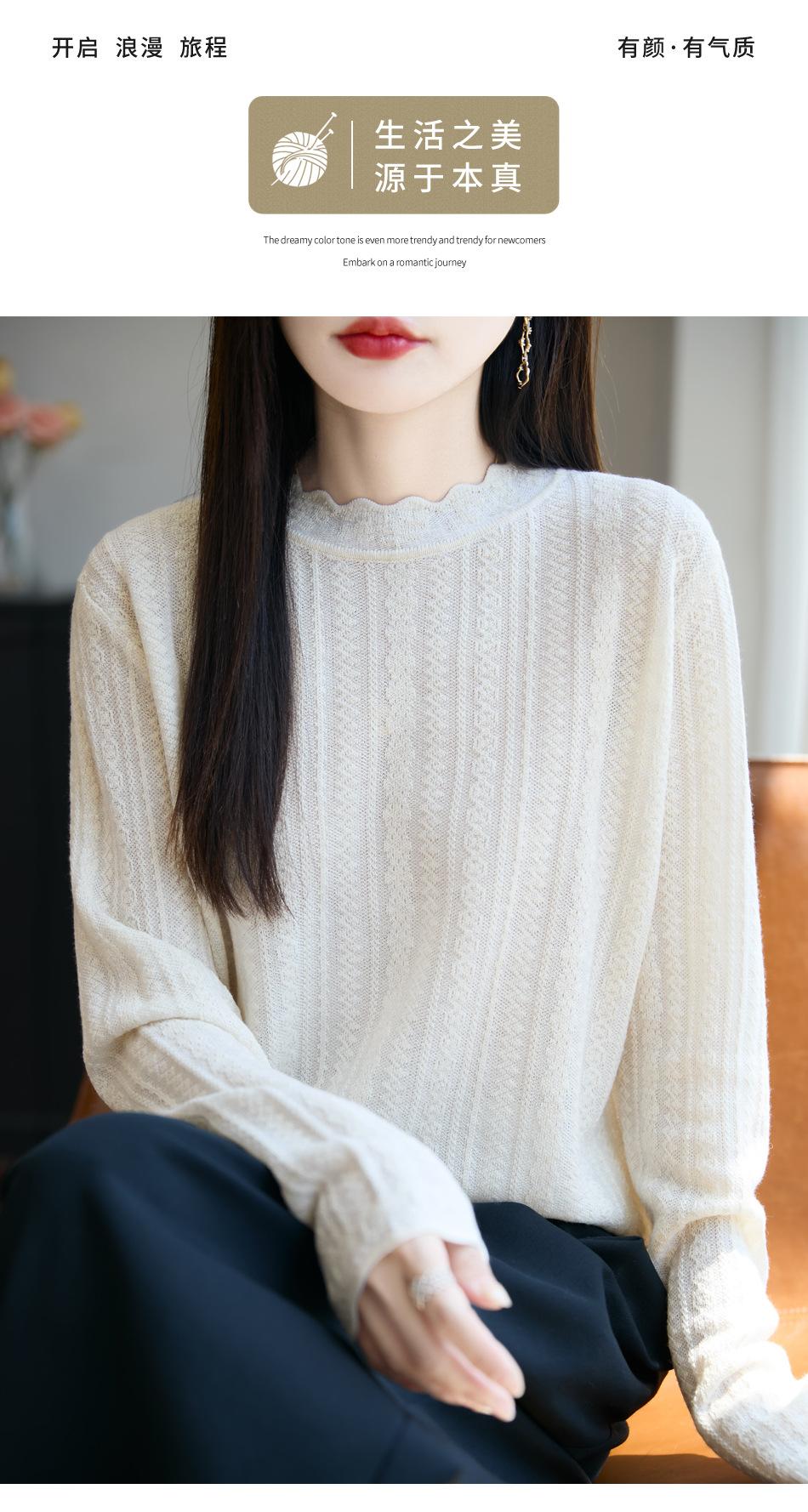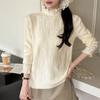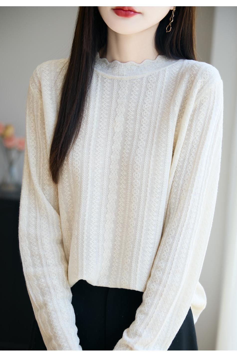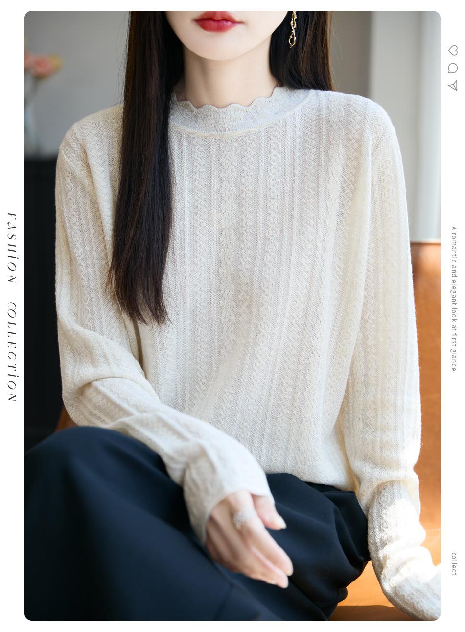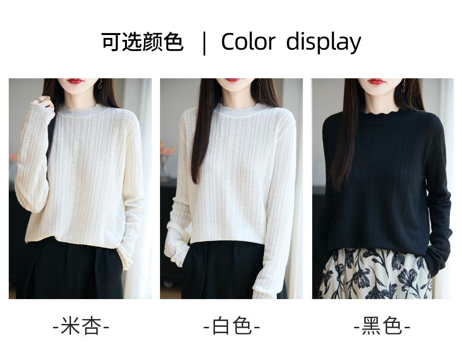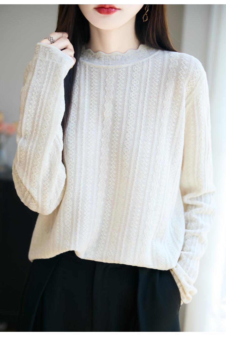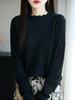 Suéter Feminino de Lã Fina com Renda e Gola de Organza, Design de Borda Ondulada, Estilo Delicado, Tricotado, Outono Inverno, Roupa Interior