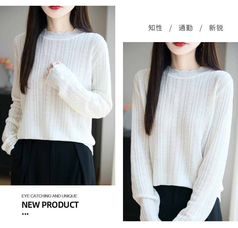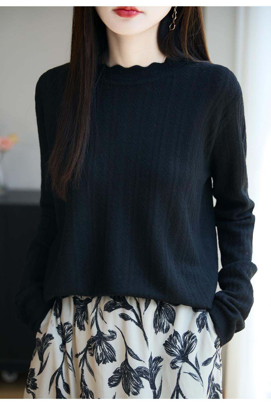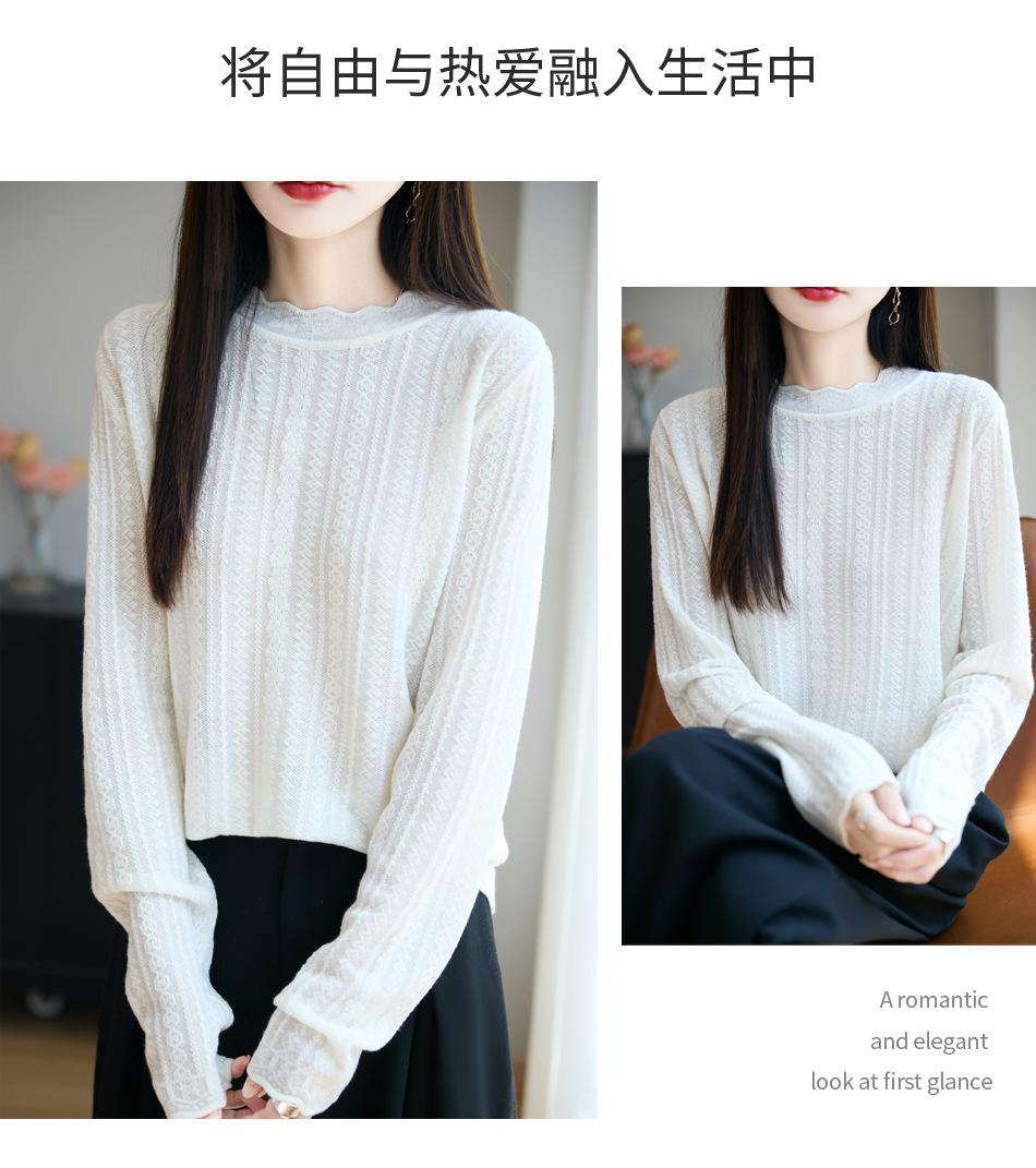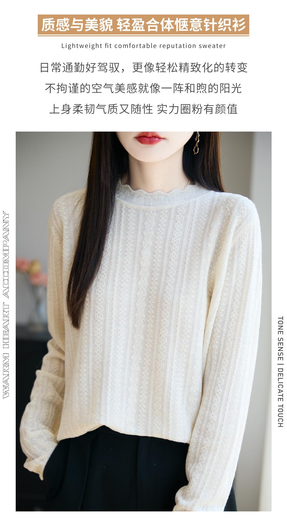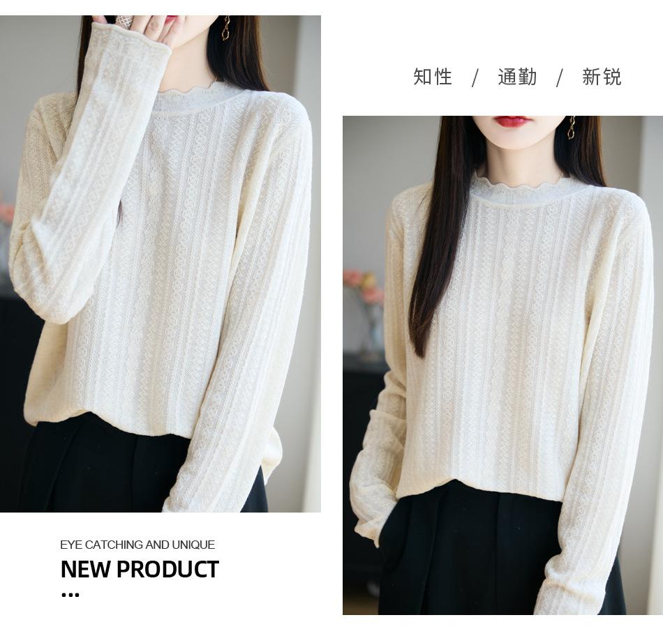 Suéter Feminino de Lã Fina com Renda e Gola de Organza, Design de Borda Ondulada, Estilo Delicado, Tricotado, Outono Inverno, Roupa Interior