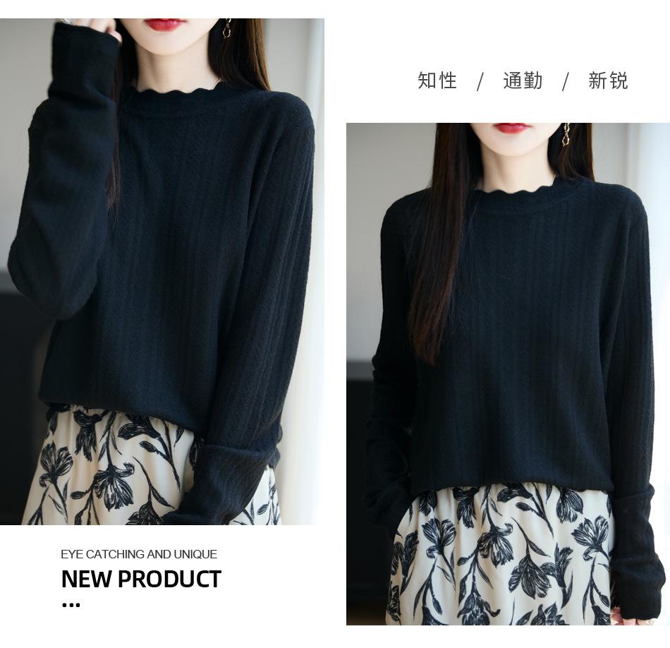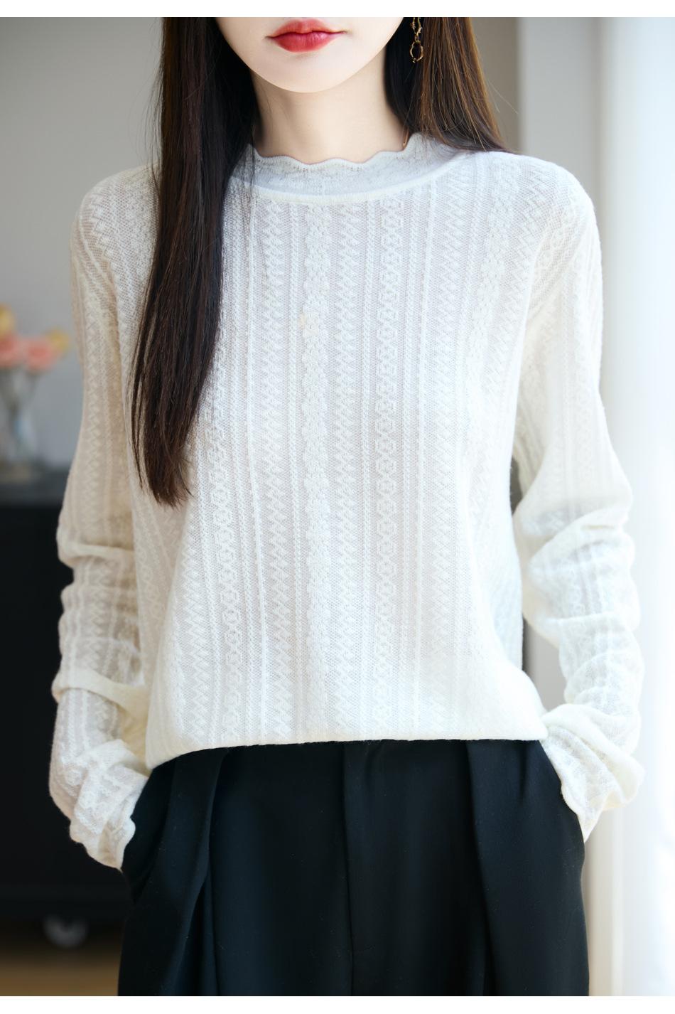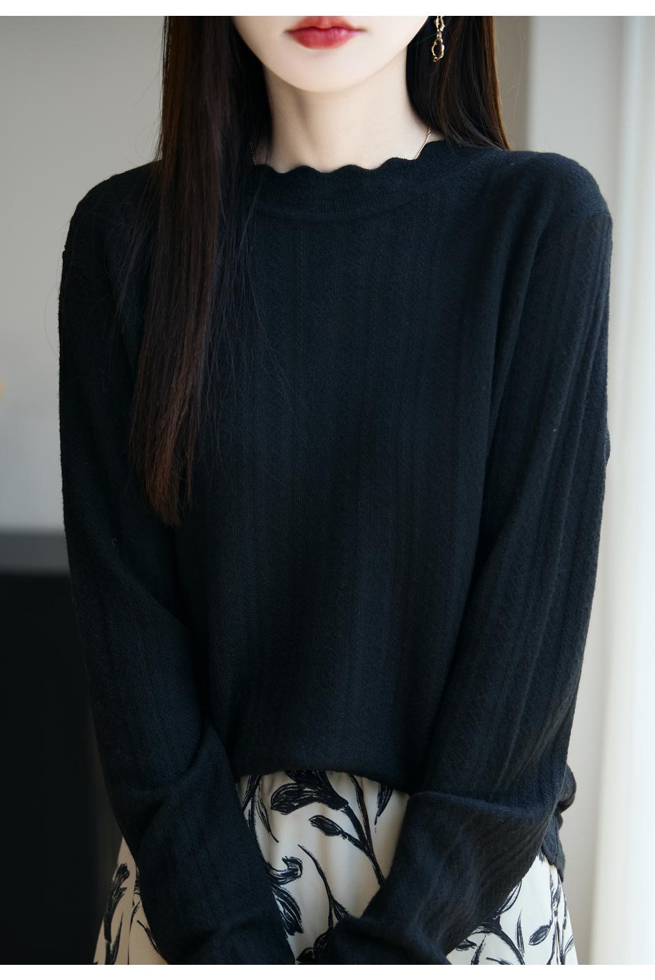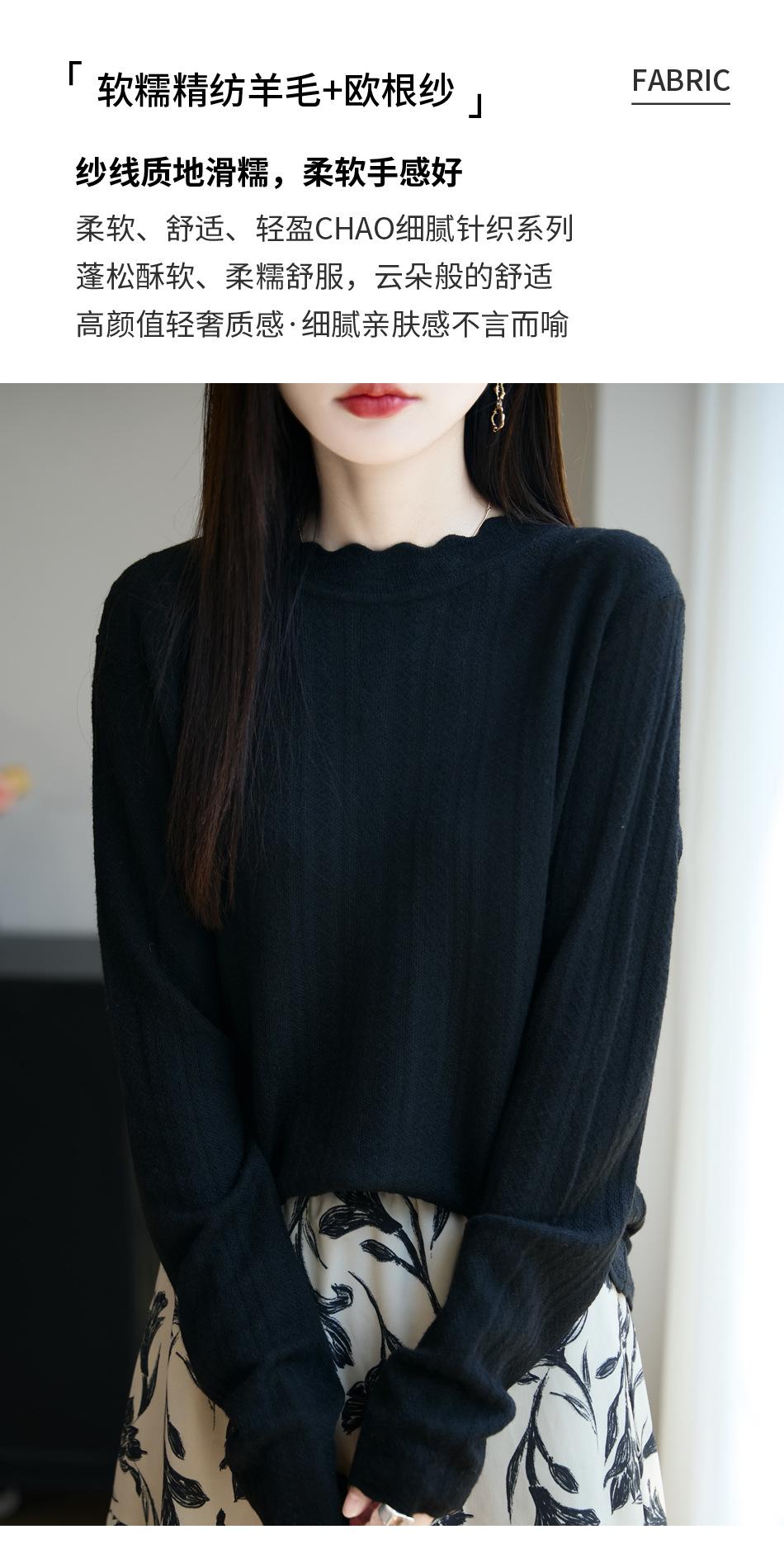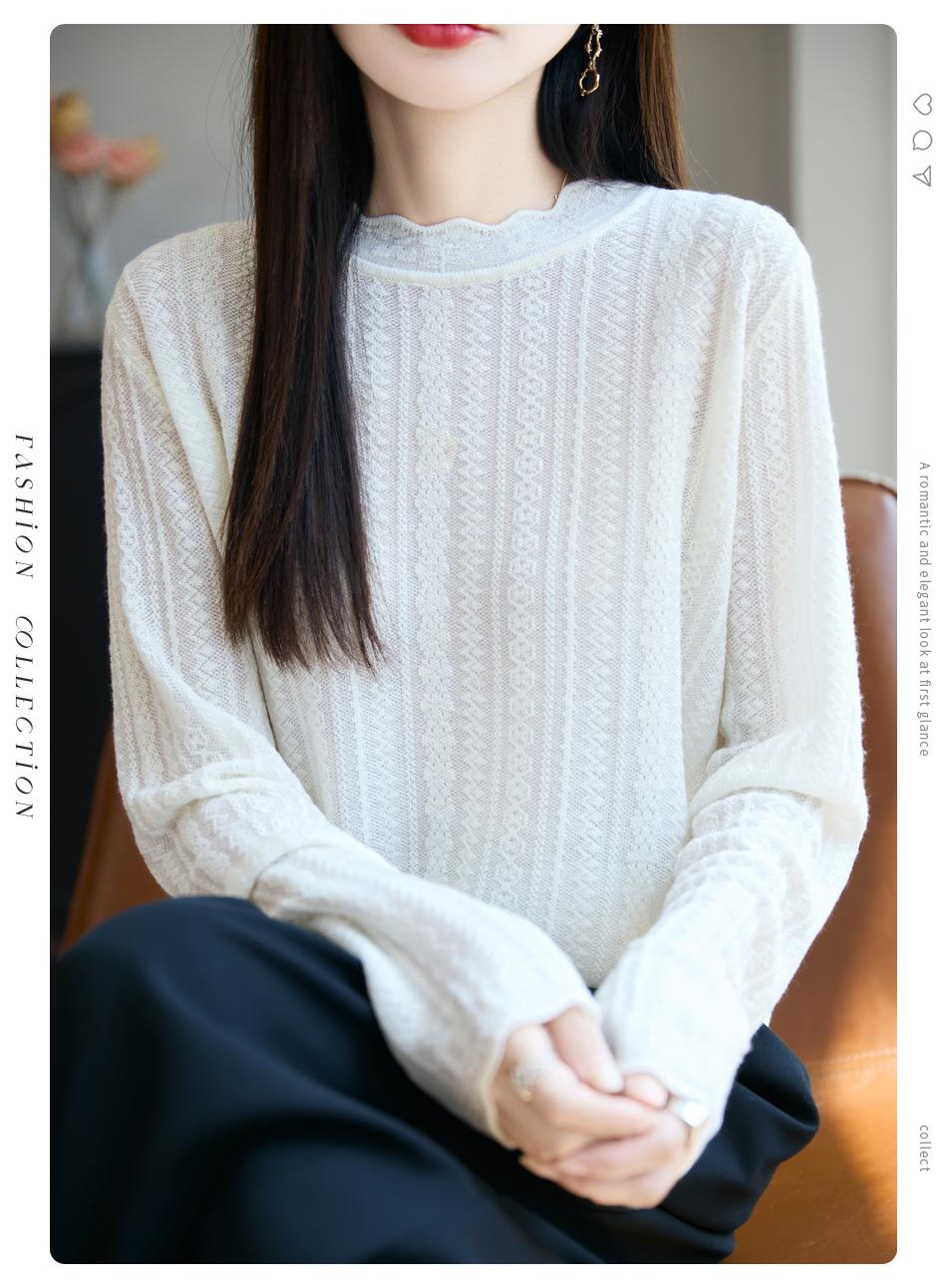 Suéter Feminino de Lã Fina com Renda e Gola de Organza, Design de Borda Ondulada, Estilo Delicado, Tricotado, Outono Inverno, Roupa Interior