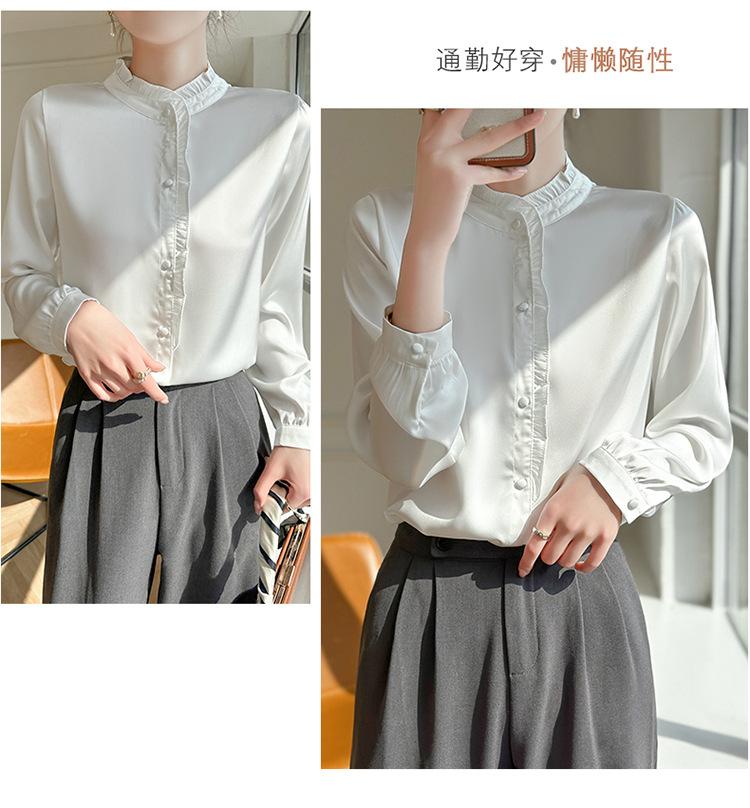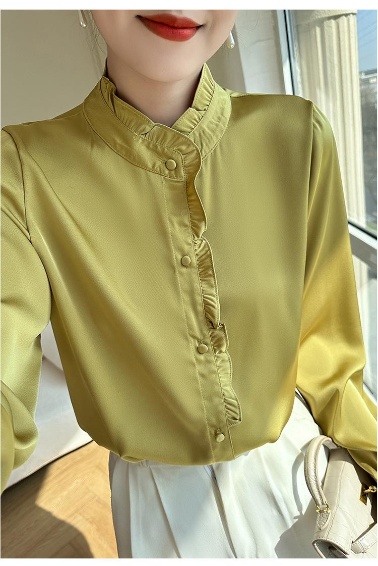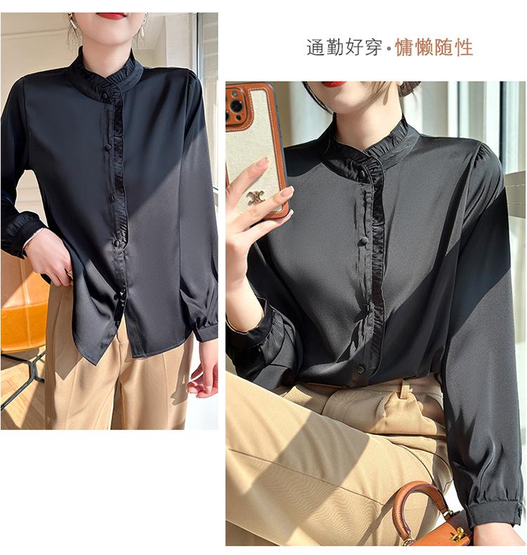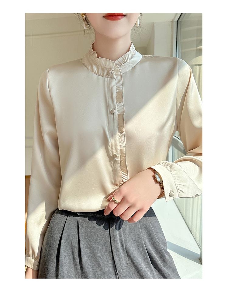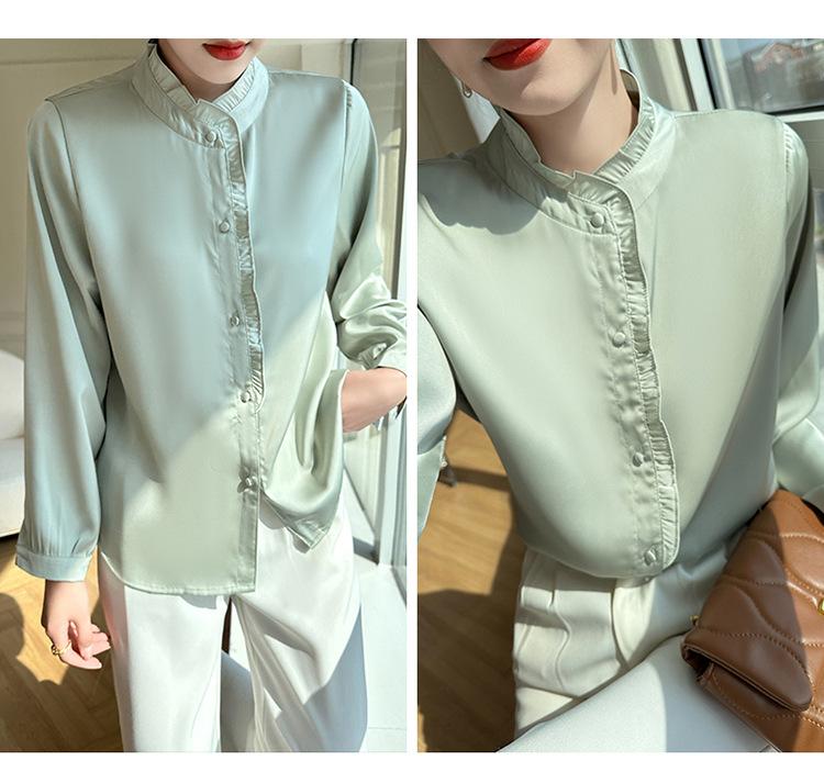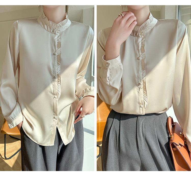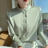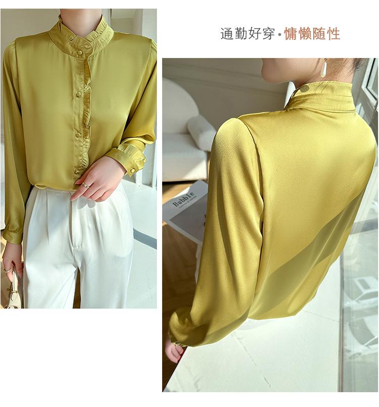 Camisa Nova de Cetim Francês com Babados e Gola Alta para Mulheres, Cor Sólida, Blusa com Design Solto