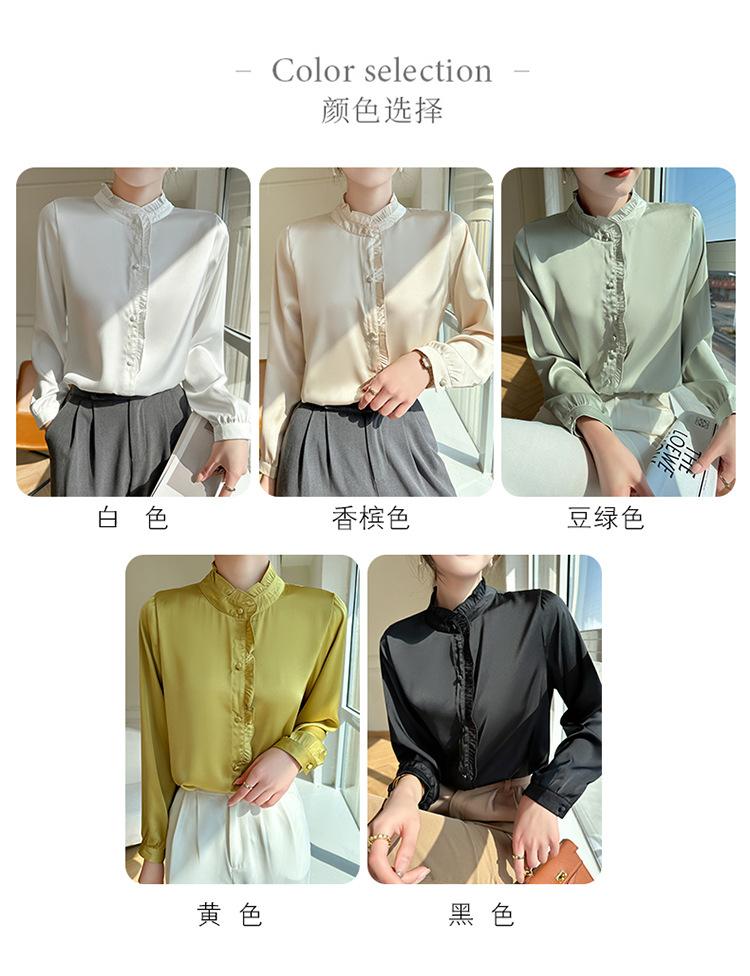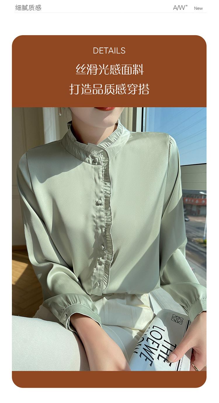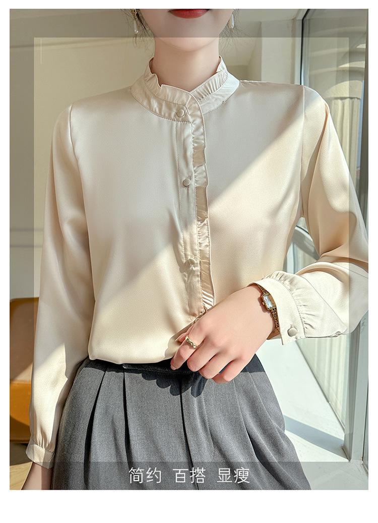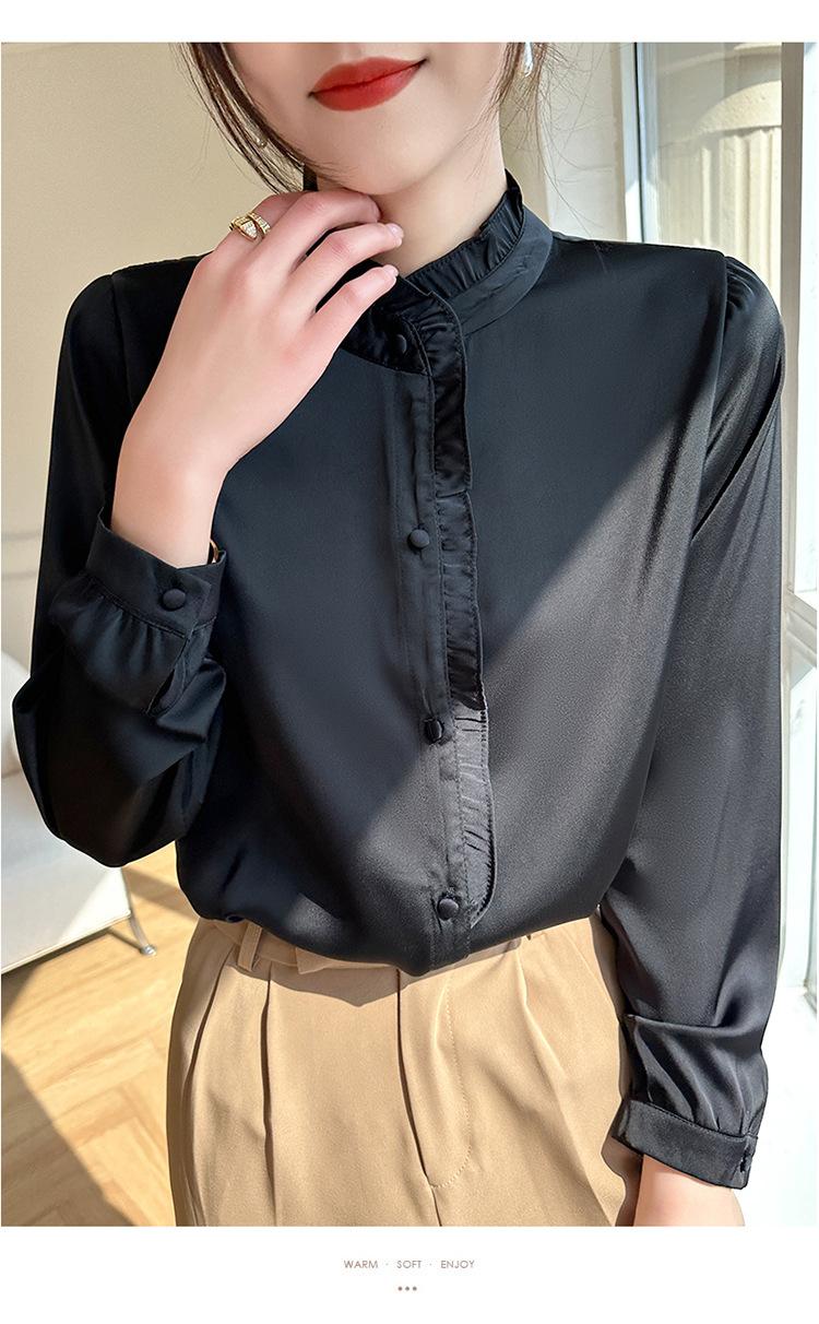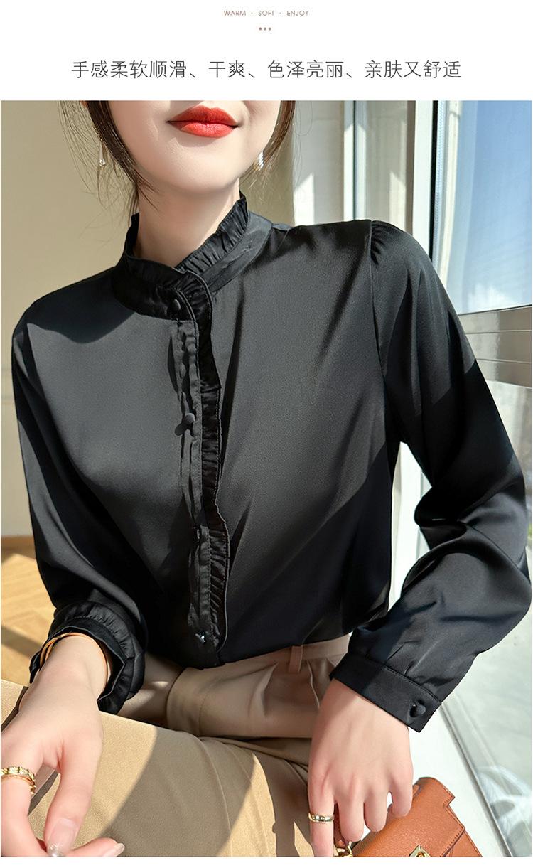 Camisa Nova de Cetim Francês com Babados e Gola Alta para Mulheres, Cor Sólida, Blusa com Design Solto