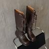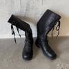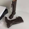 Botas femininas de couro genuíno de outono e inverno, estilo cavaleiro, sola grossa antiderrapante de borracha, cadarço, salto médio, tamanho grande, novas botas altas