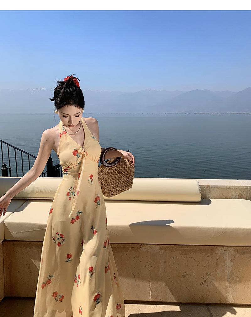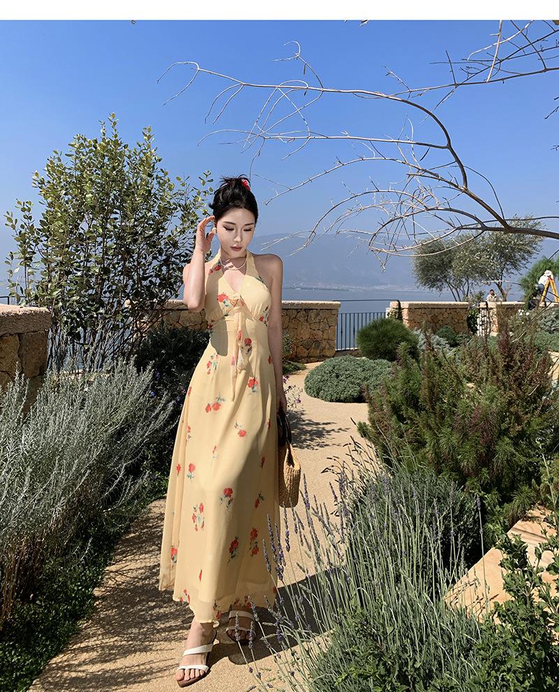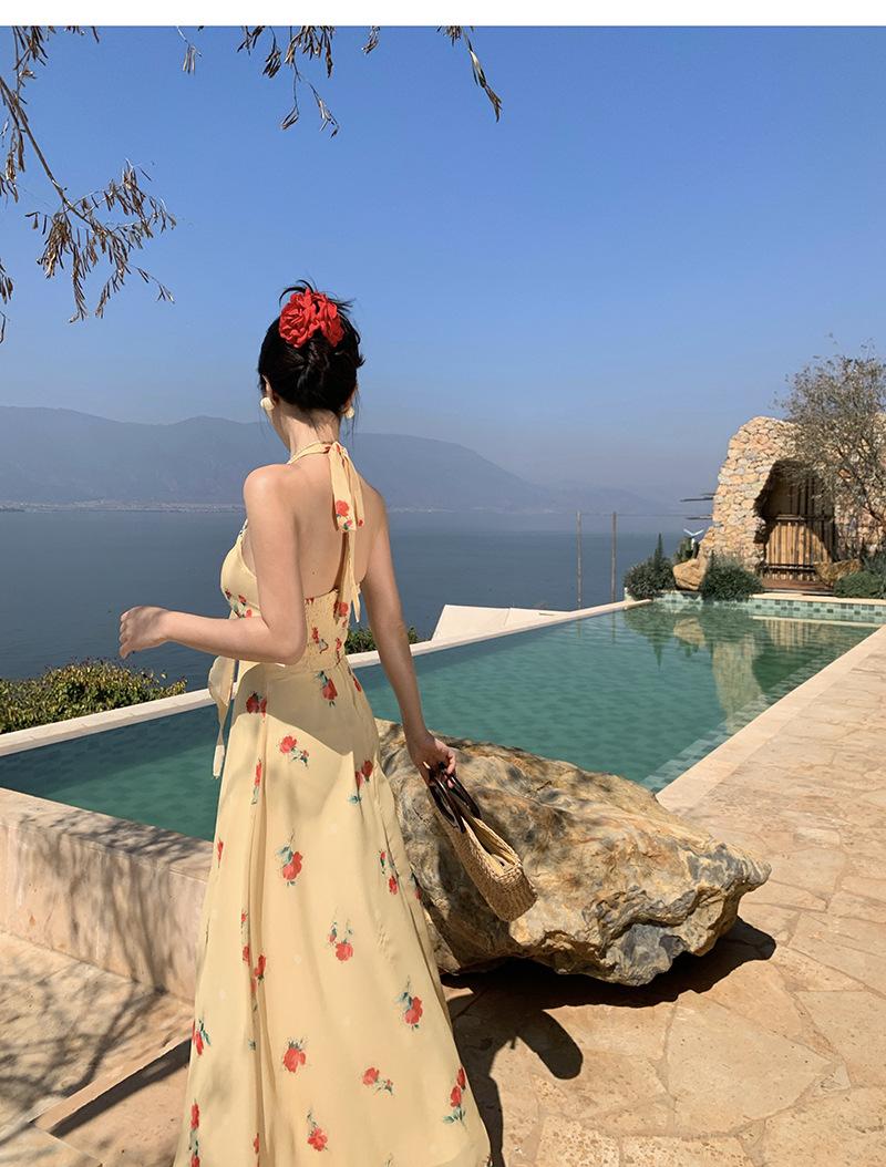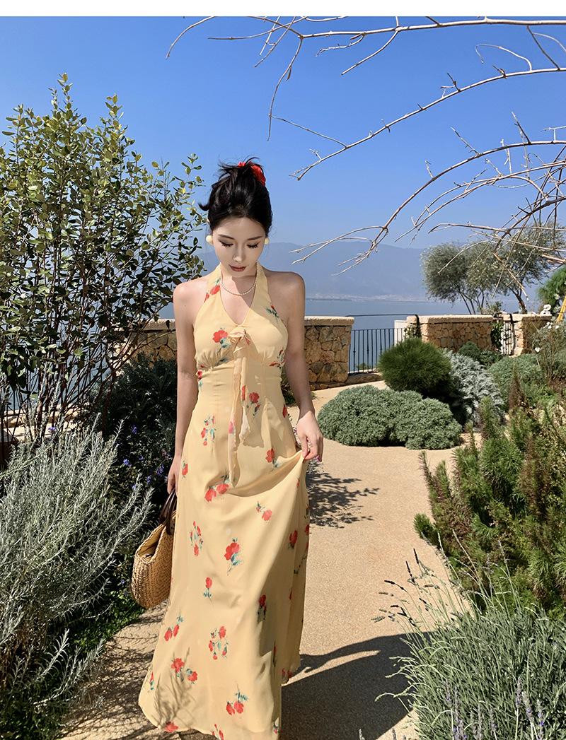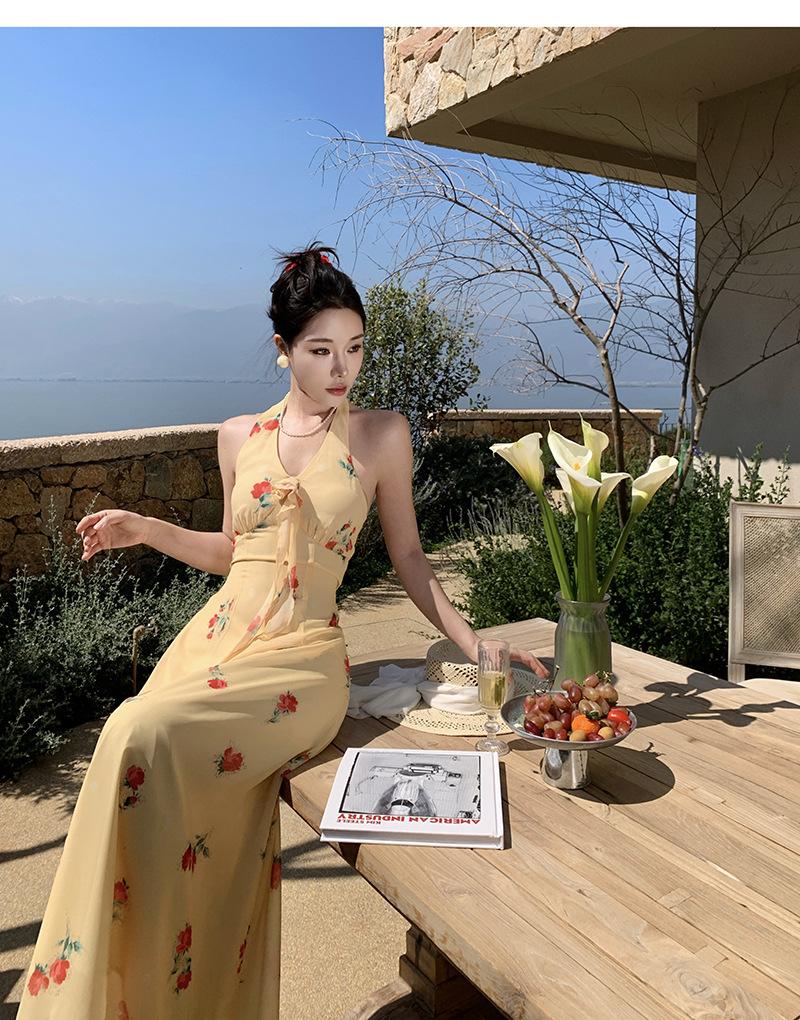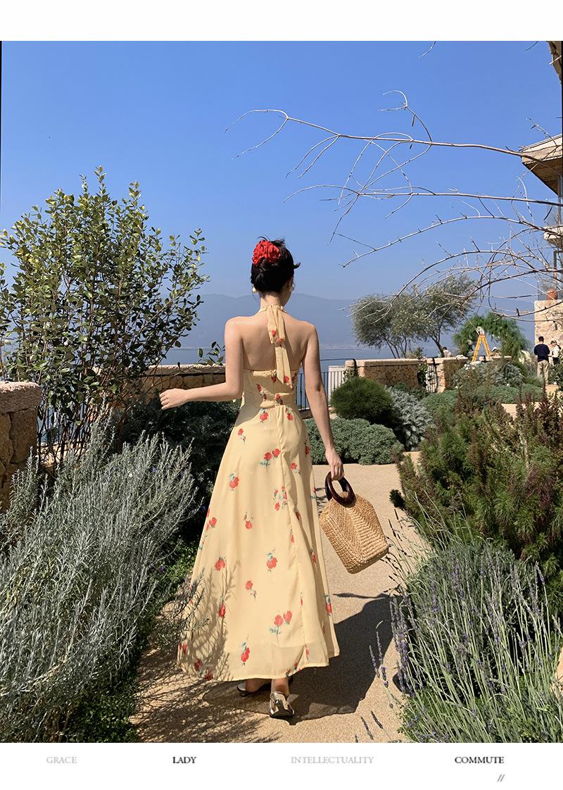 Vestido de Feriado Estampado com Decote Halter sem Costas na Cintura