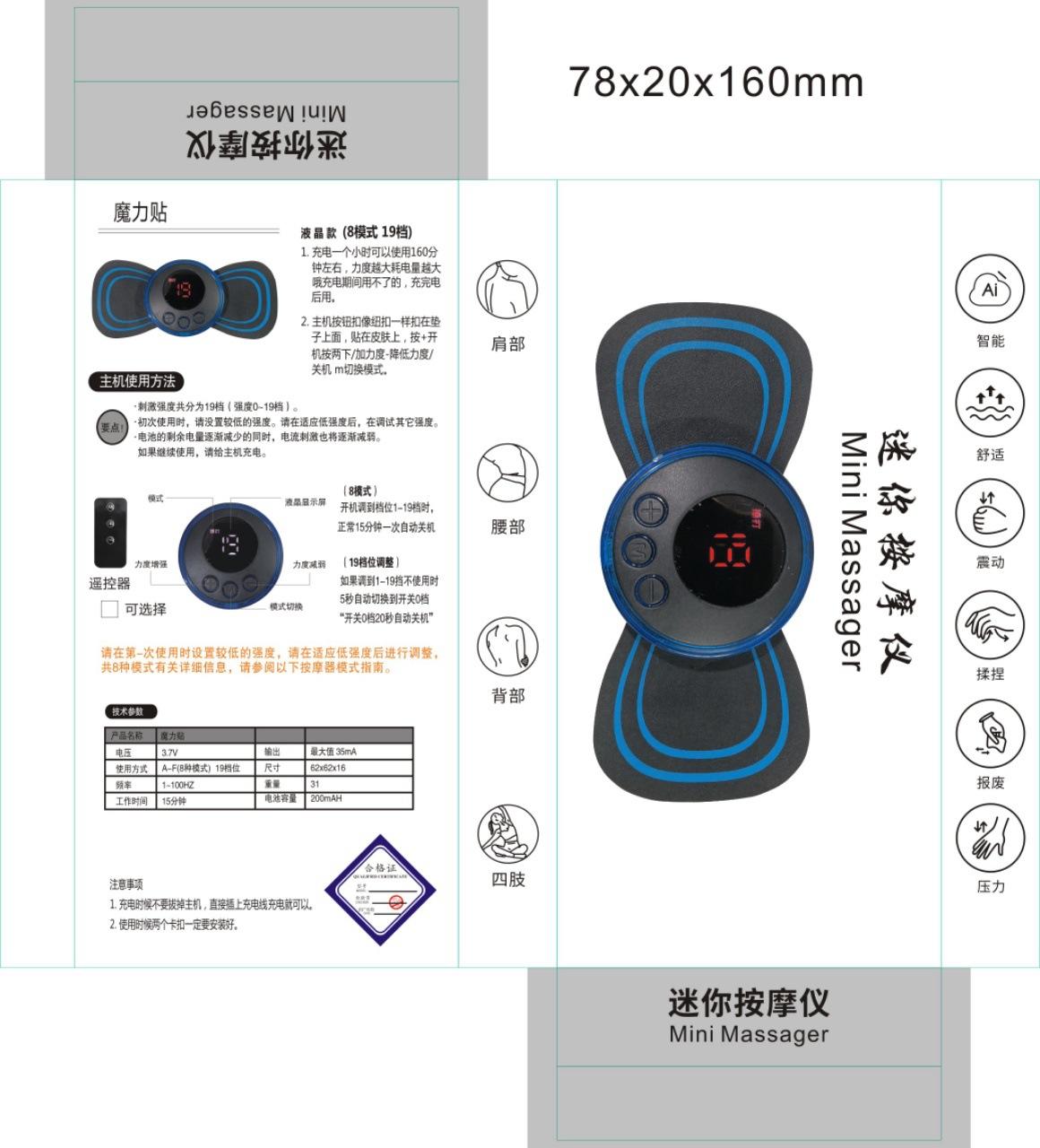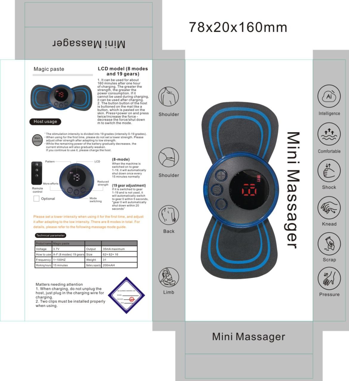 Tamanho da unidade principal: 60*40*150mm Peso da unidade principal: aprox. 19g Material da unidade principal: resina ABS+couro PU Temperatura de operação: 10-35°C Modos (intensidade): 8 tipos (19 níveis) Tensão/corrente de operação: 3.3v/50mA (pico) Tempo de operação: 15 minutos/sessão Capacidade da bateria: 150mAh
