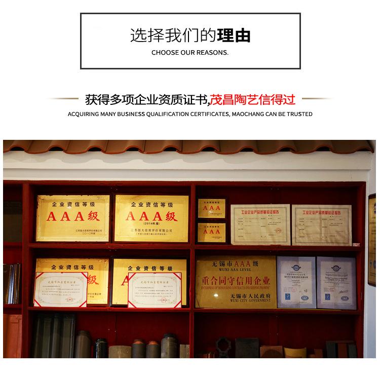 A Fábrica de Cerâmica Maochang de Yixing está localizada em Yixing, conhecida como a antiga capital da cerâmica junto ao Lago Taihu, o mar de bambu e o mundo das cavernas, com transporte conveniente. É uma empresa na indústria de telhas esmaltadas de Yixing. Produz e pesquisa principalmente várias cerâmicas arquitetônicas, com equipamentos e tecnologia avançados. Os principais produtos incluem: telhas planas europeias, telhas espanholas, telhas S, telhas romanas, telhas escama de peixe, telhas ardósia tailandesas, telhas losango, telhas de encaixe, telhas de canal, telhas esmaltadas de Yixing, tijolos aparentes para parede externa, tijolos culturais decorativos, tijolos artesanais texturizados, tijolos de terracota, tijolos artesanais em faixa, tijolos a vácuo, tijolos sinterizados, tijolos para gramado, tijolos quadrados, tijolos azuis, etc. Possui um sistema de gestão de qualidade completo e científico. Com excelente textura, formas elegantes, especificações completas e esmaltes ricos, possui fortes características nacionais e é amplamente utilizado em hotéis, vilas, áreas residenciais, templos, pavilhões, torres e várias construções clássicas de jardim, tornando-o um material de construção ideal atualmente. A integridade, força e qualidade do produto da Fábrica de Cerâmica Maochang de Yixing foram reconhecidas pela indústria. Amigos de todas as esferas da vida são bem-vindos para visitar, orientar e discutir negócios. Nosso crescimento precisa de sua participação, orientação e apoio! Aderimos ao princípio de "usuário em primeiro lugar, inovação de produto," e todos os funcionários fornecem produtos de todo o coração à maioria dos usuários.