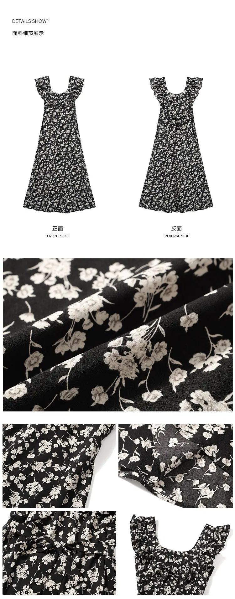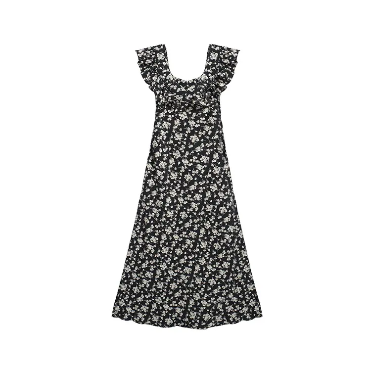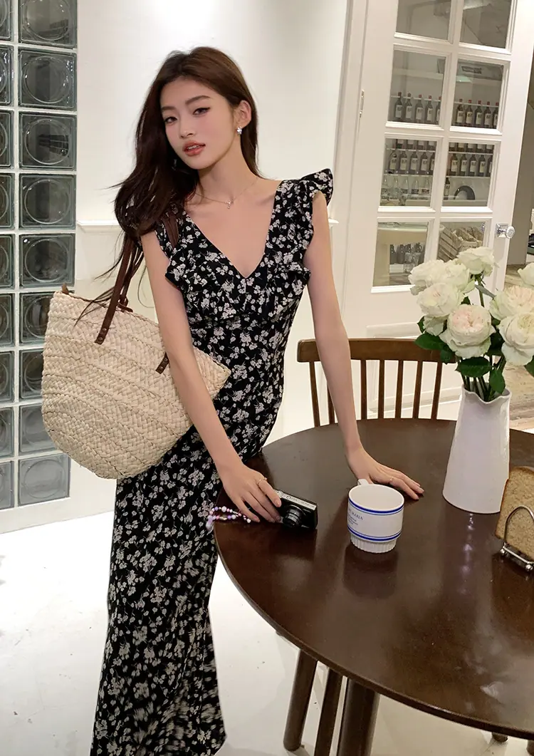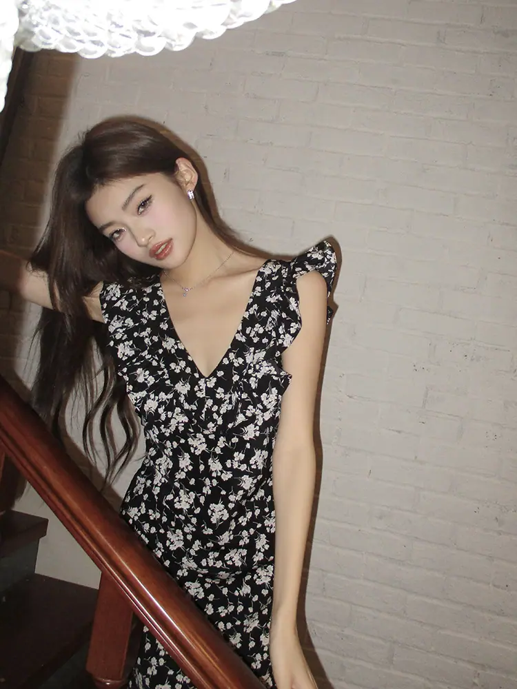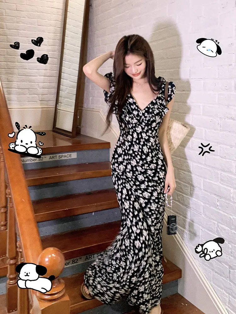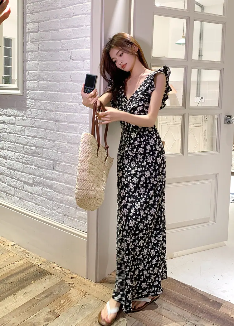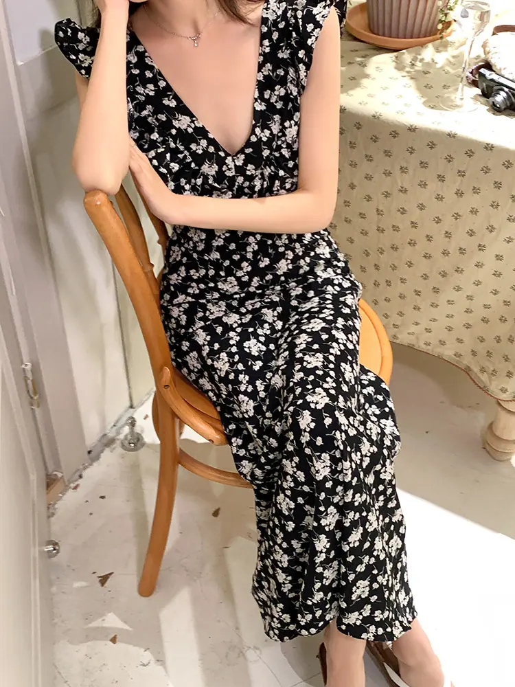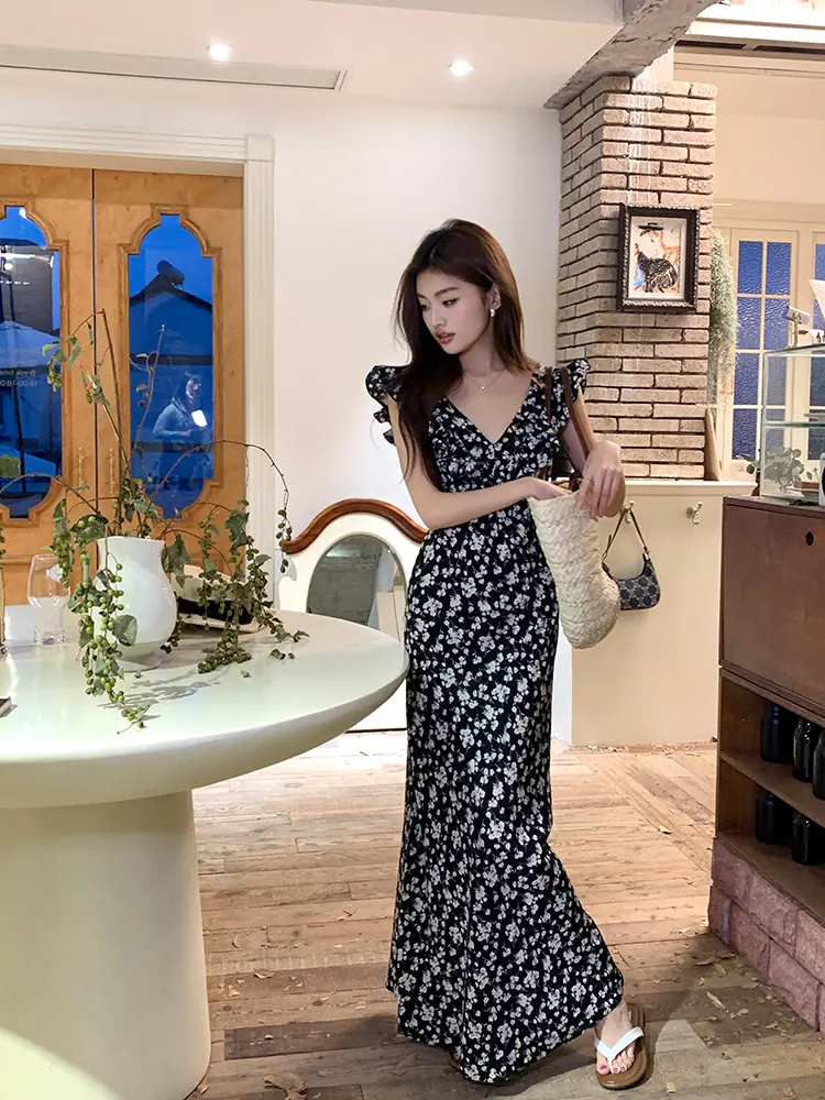 Vestido de Verão 2024 Retrô Francês Decote V Babados Mangas Voadoras Vestido Floral Feminino Cintura Amarrada Saia Longa