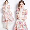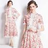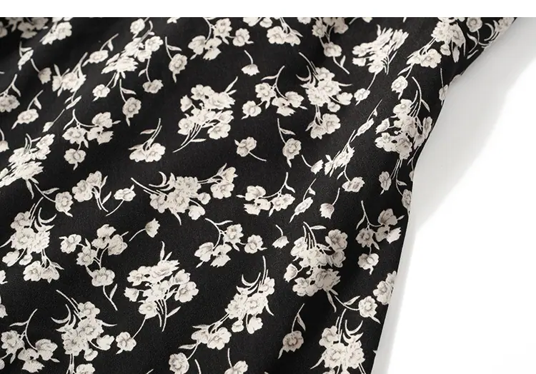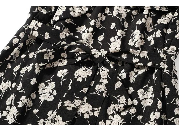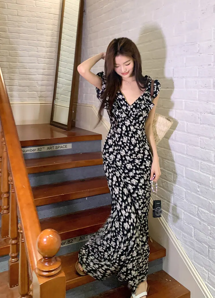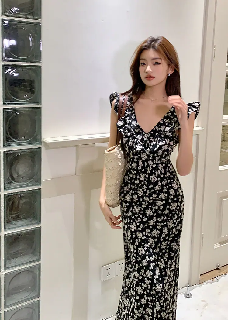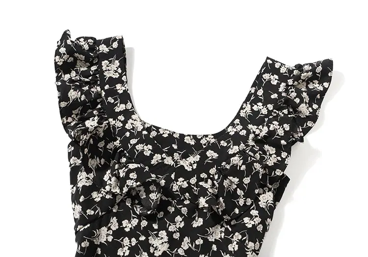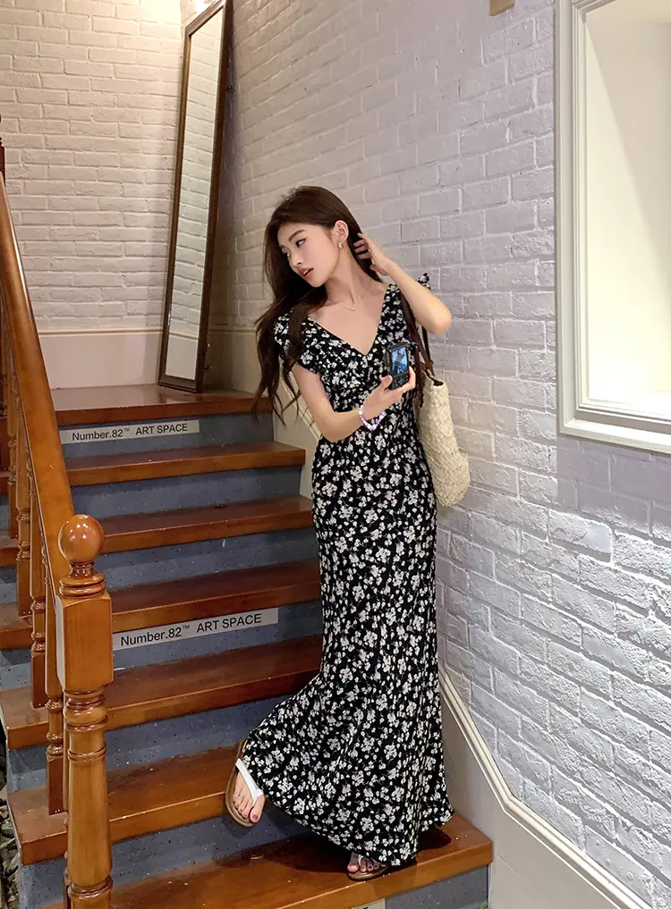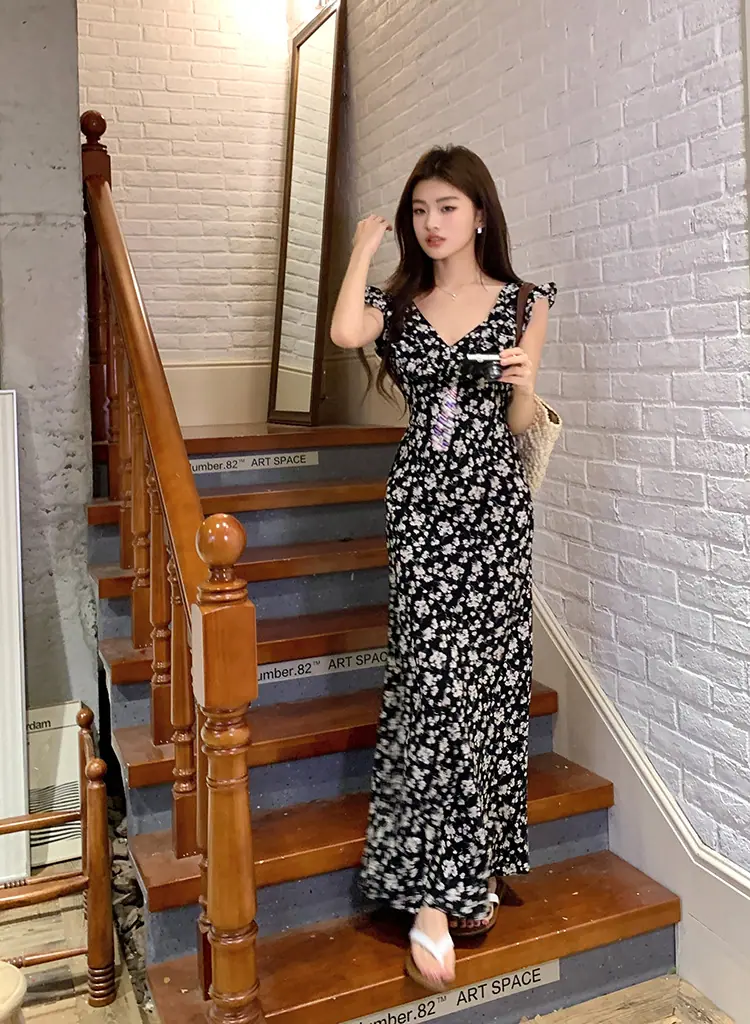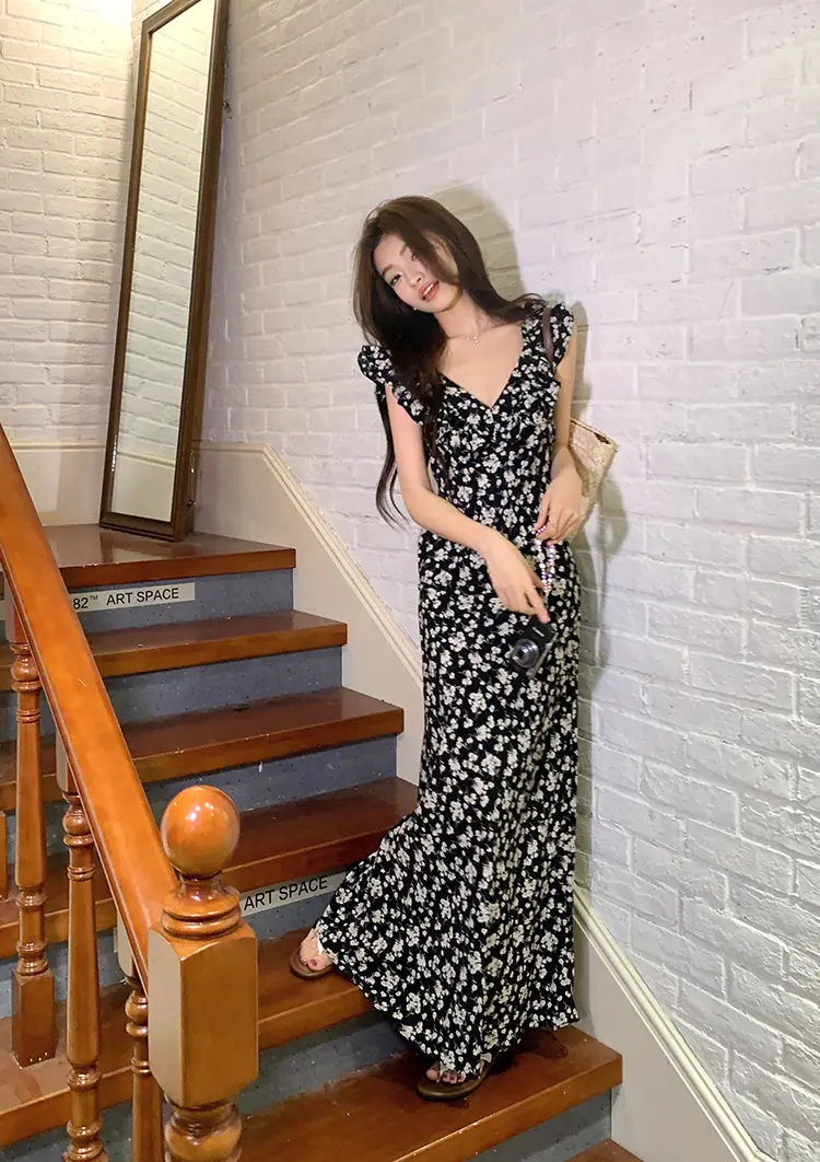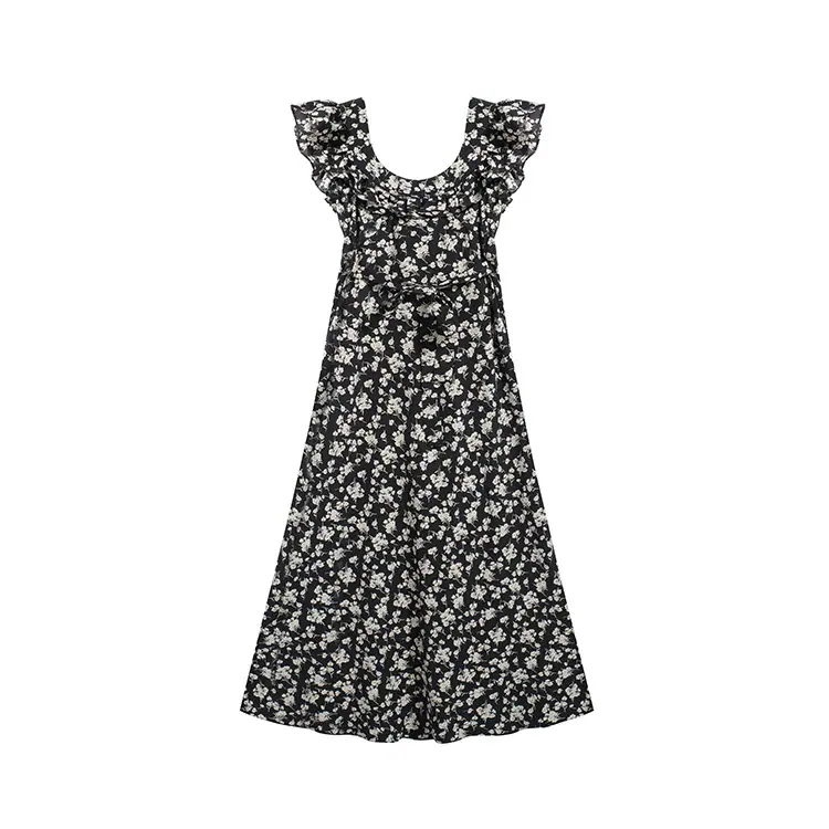 Vestido de Verão 2024 Retrô Francês Decote V Babados Mangas Voadoras Vestido Floral Feminino Cintura Amarrada Saia Longa