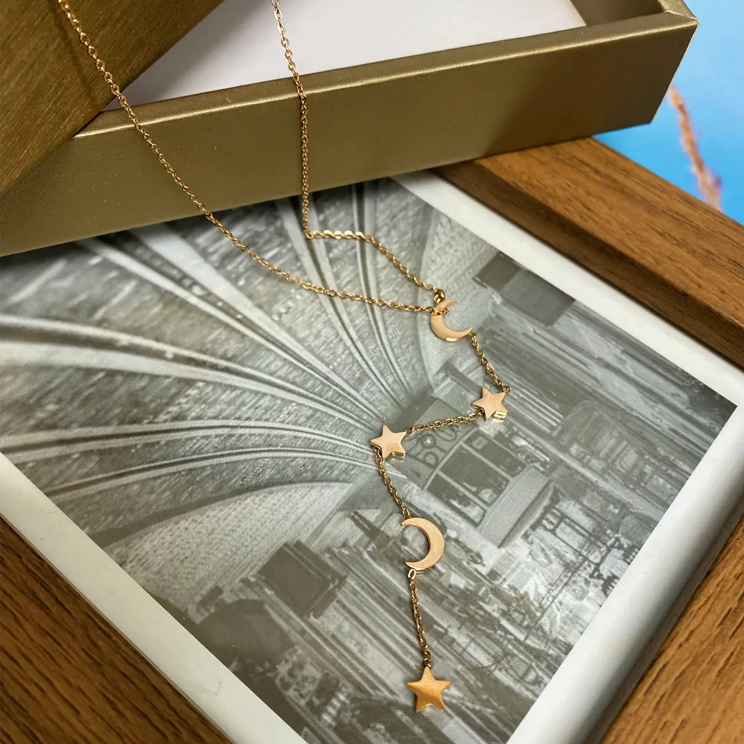 Colar de Aço Titânio Formato Lua Dupla + Estilo Estrela, Nicho Simples e Versátil Estilo Mais Vendido
