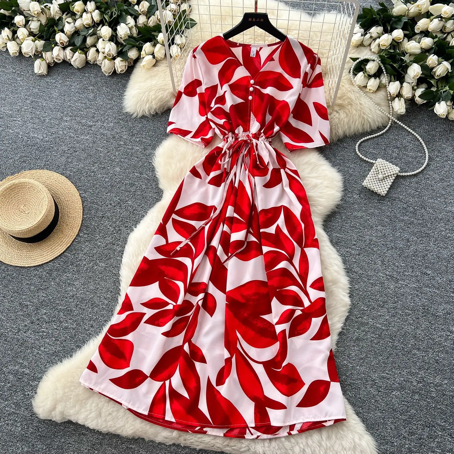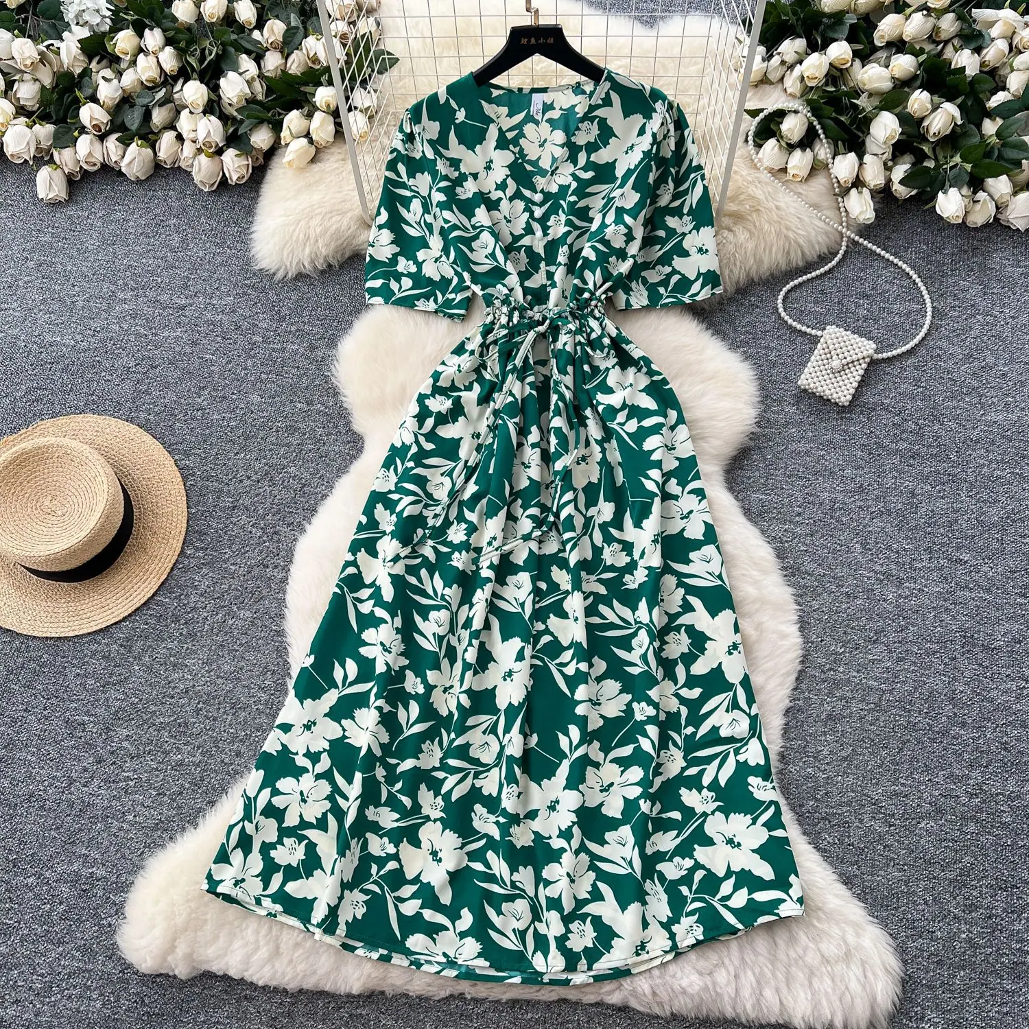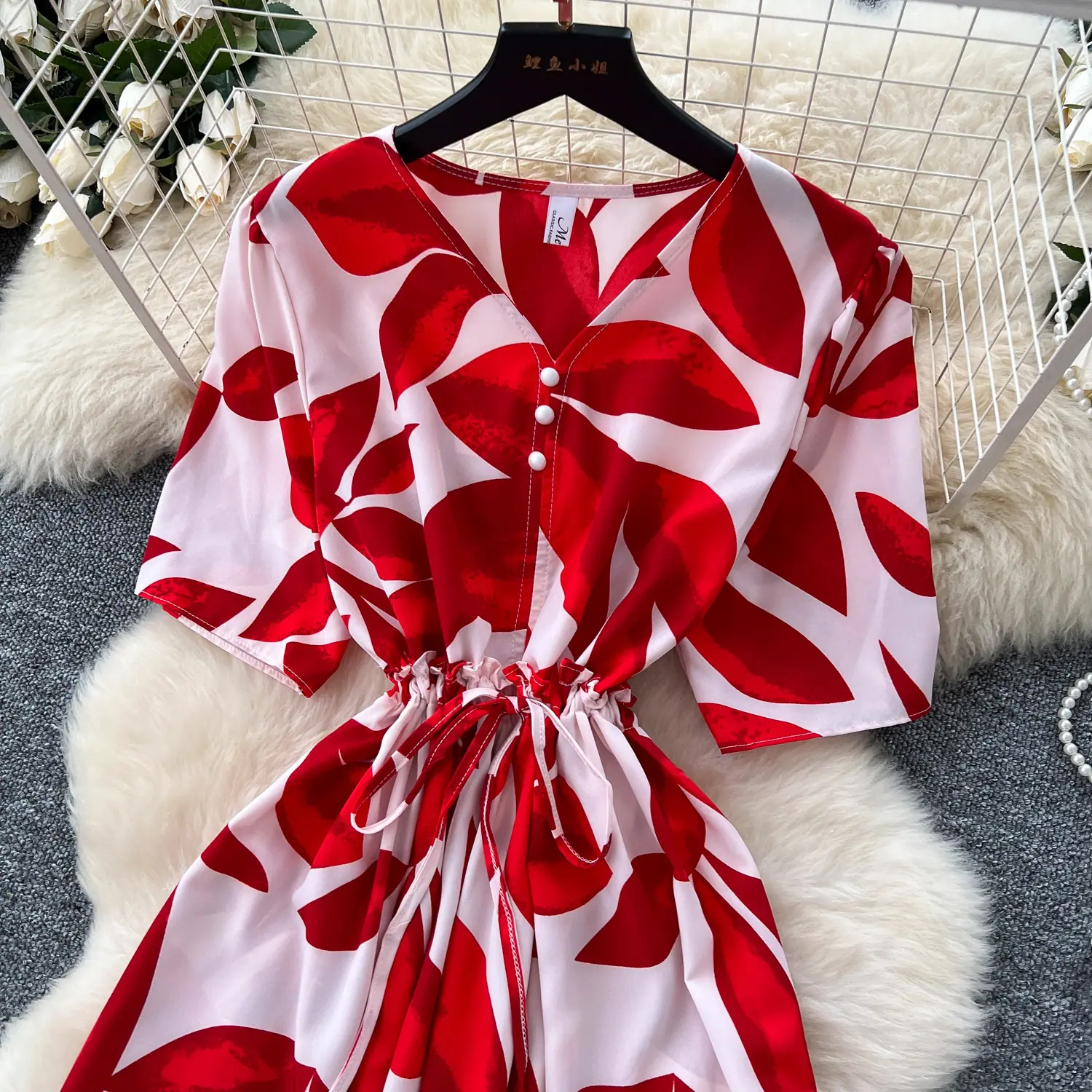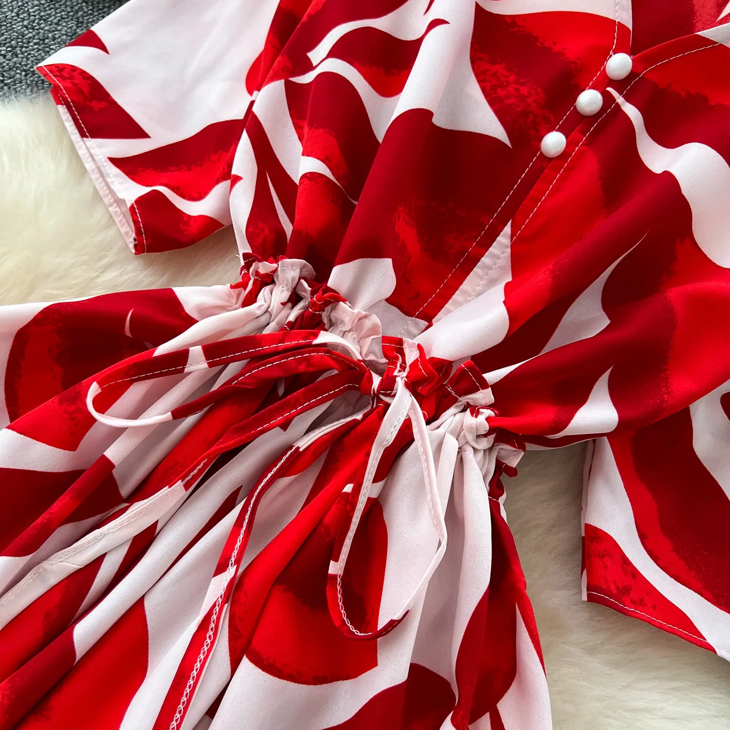 Vestido Francês Retrô Decote V Cintura com Cordão Manga Curta Estampado para Mulheres no Verão Aparência Emagrecedora Vestido Retrô Comprimento no Joelho