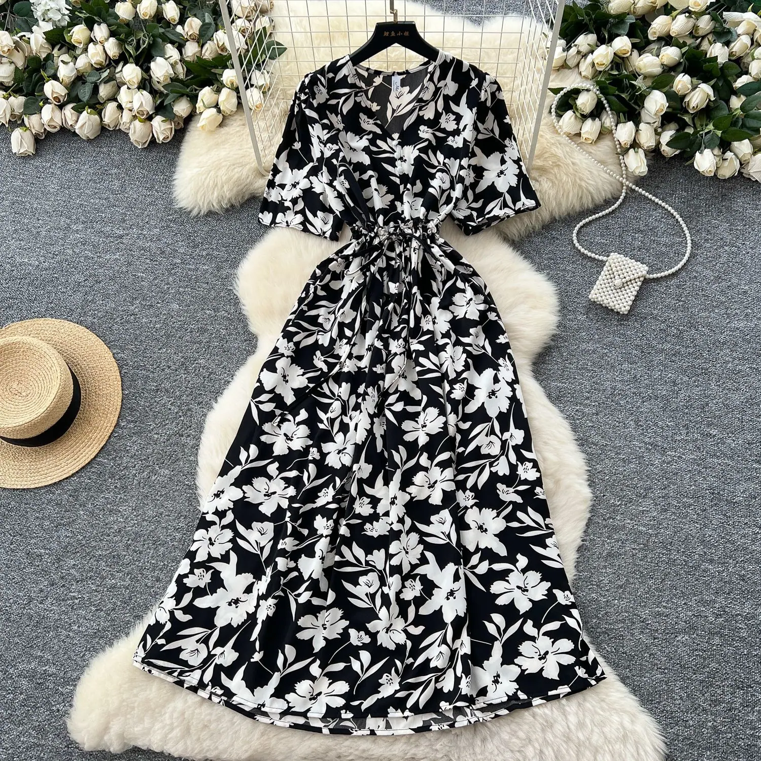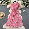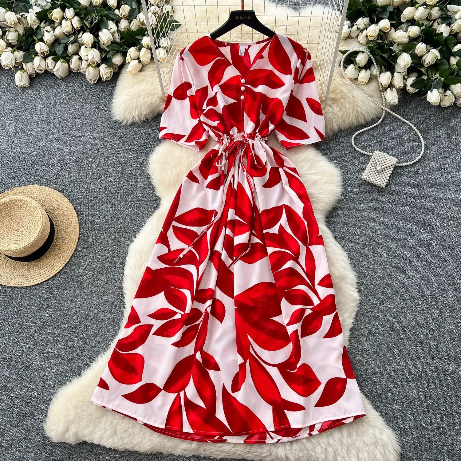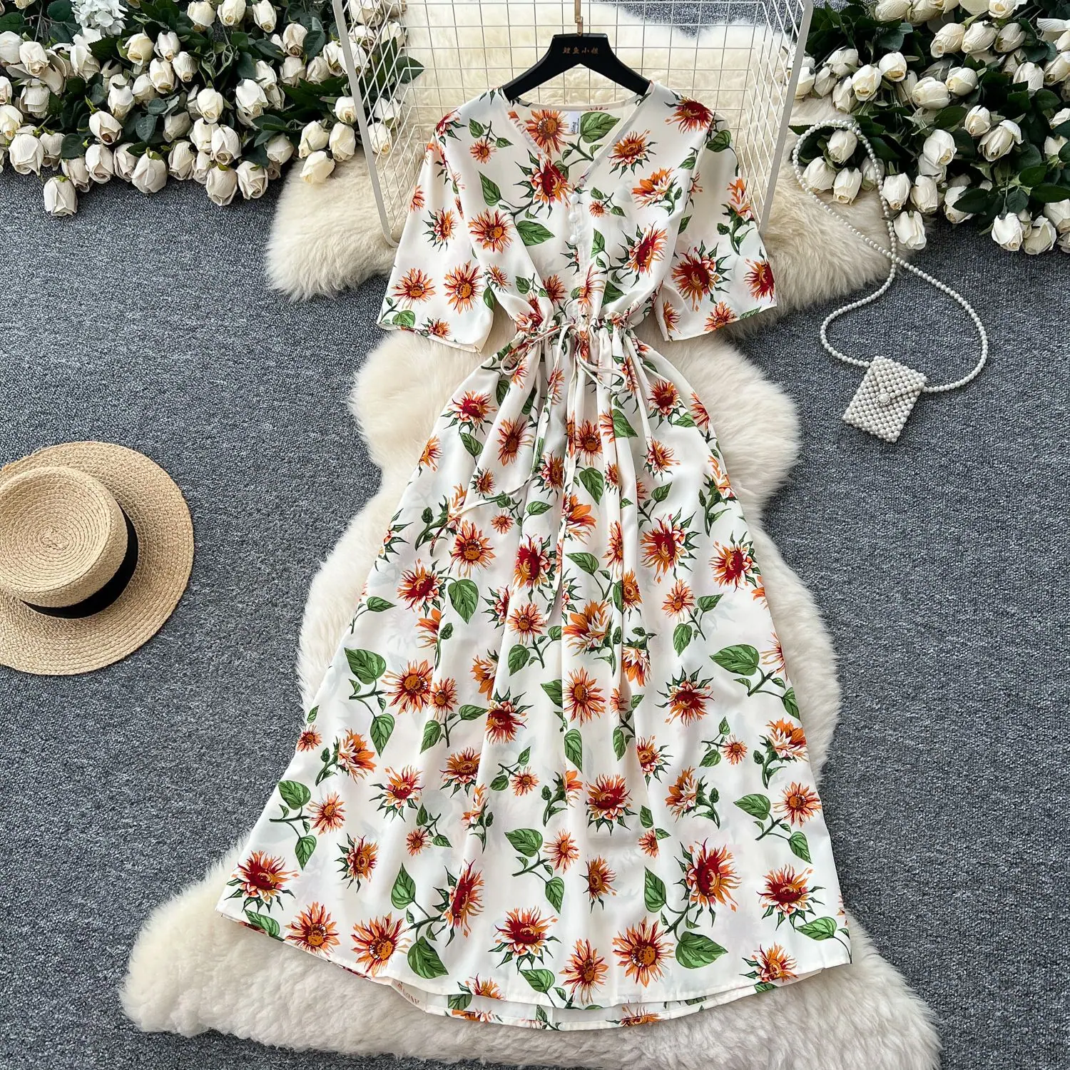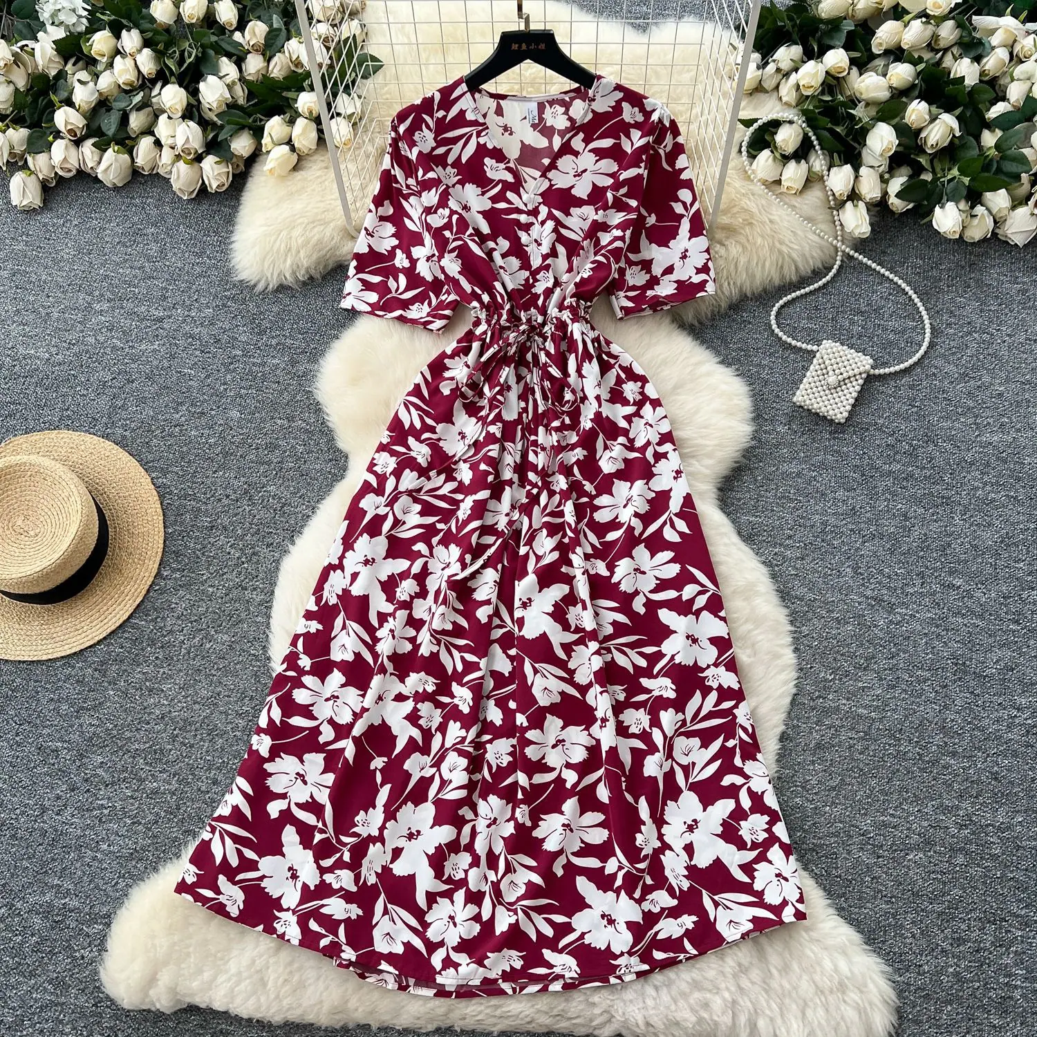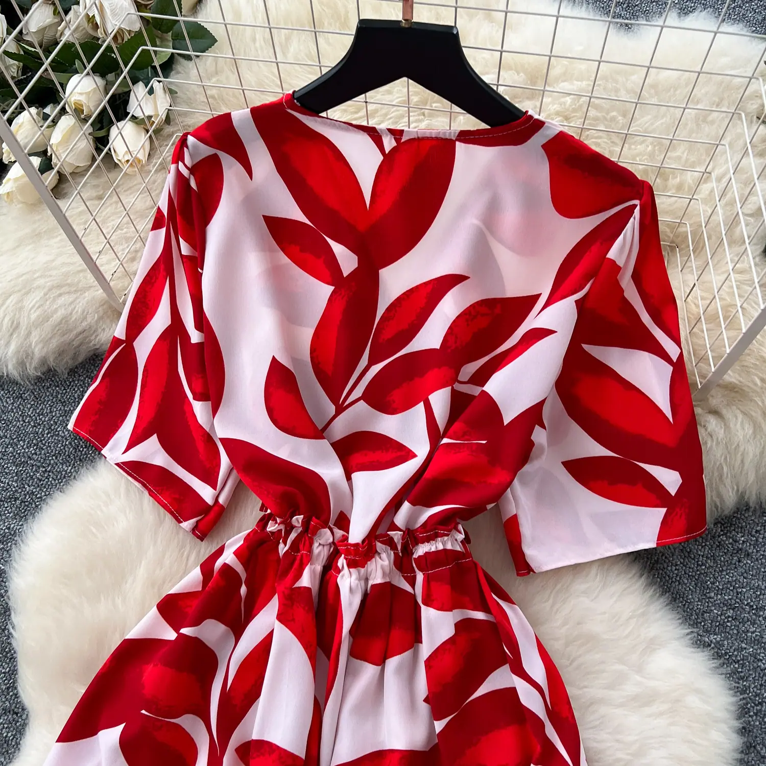 Vestido Francês Retrô Decote V Cintura com Cordão Manga Curta Estampado para Mulheres no Verão Aparência Emagrecedora Vestido Retrô Comprimento no Joelho