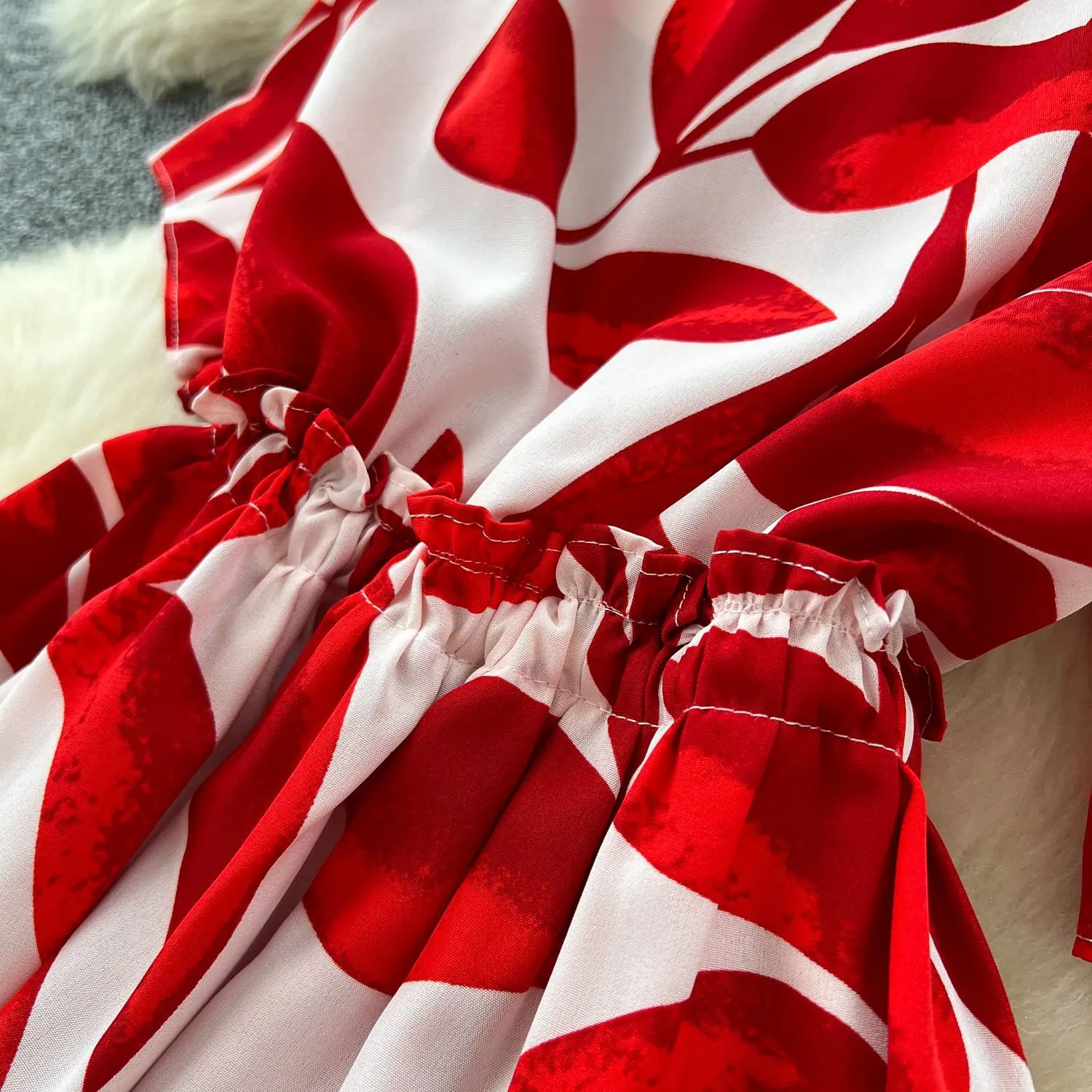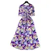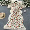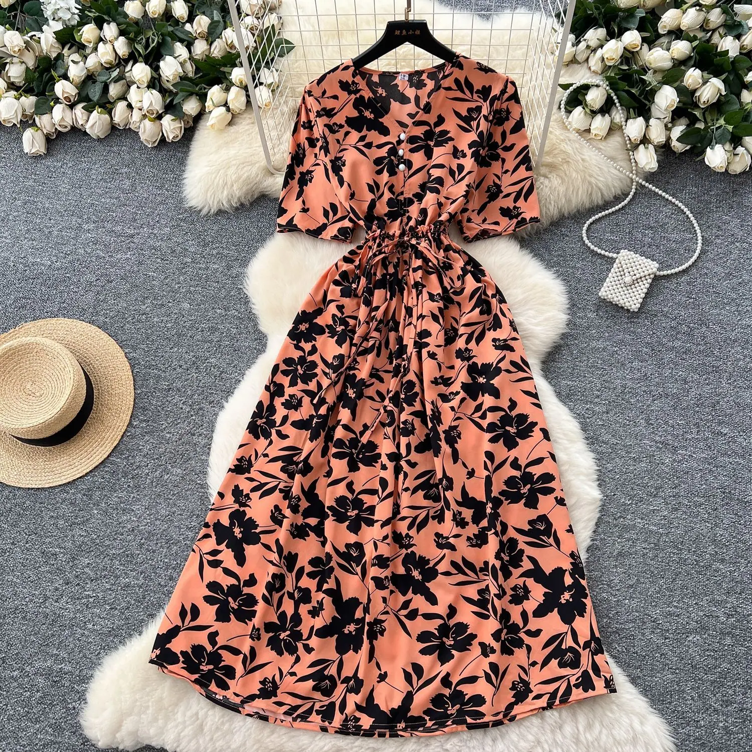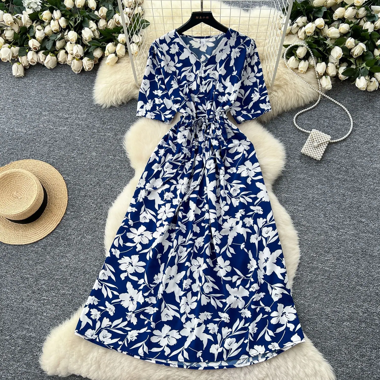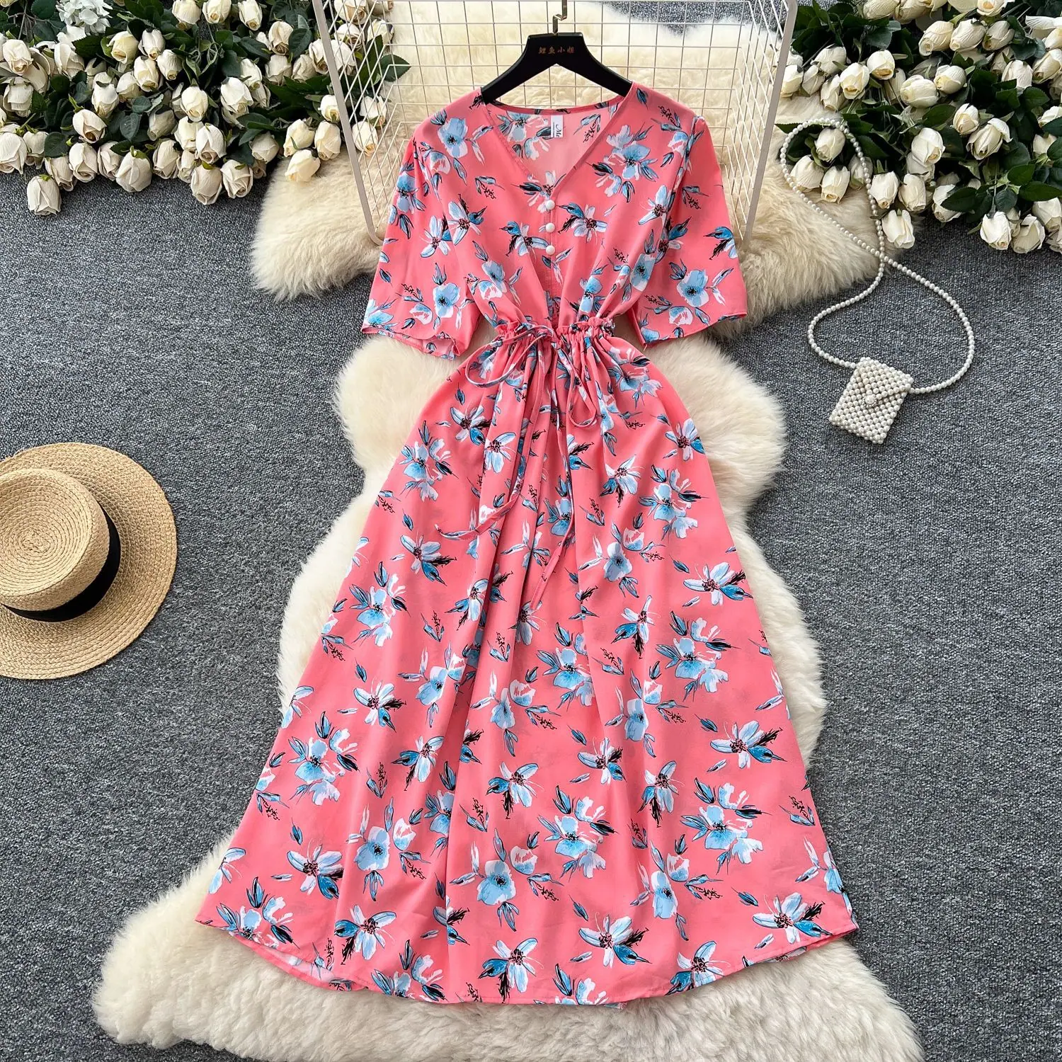 Vestido Francês Retrô Decote V Cintura com Cordão Manga Curta Estampado para Mulheres no Verão Aparência Emagrecedora Vestido Retrô Comprimento no Joelho
