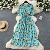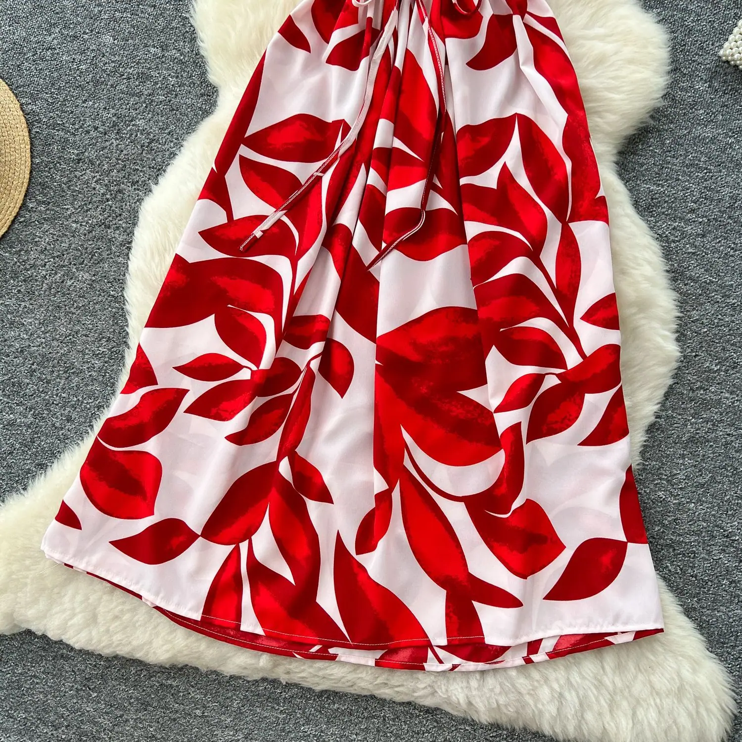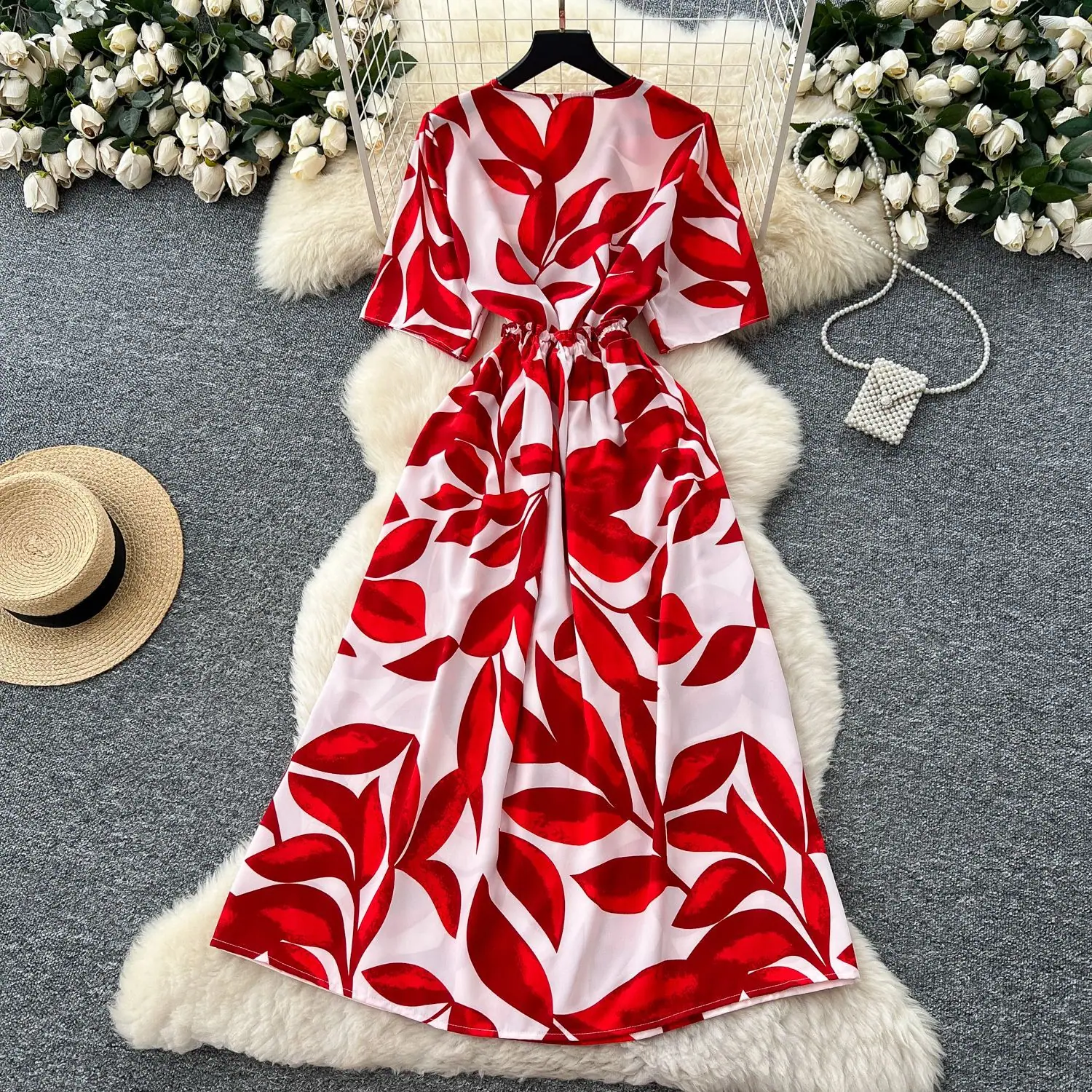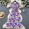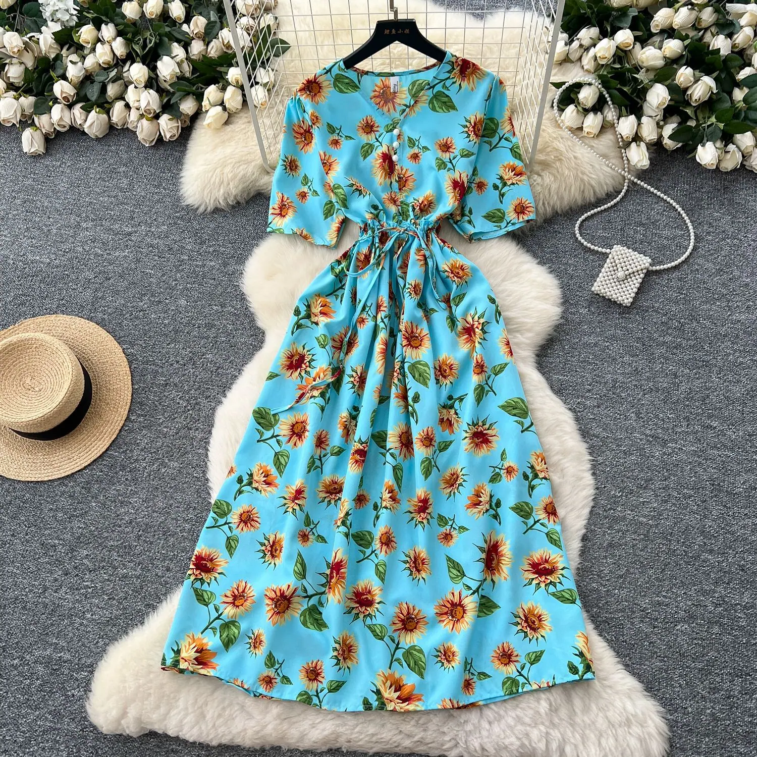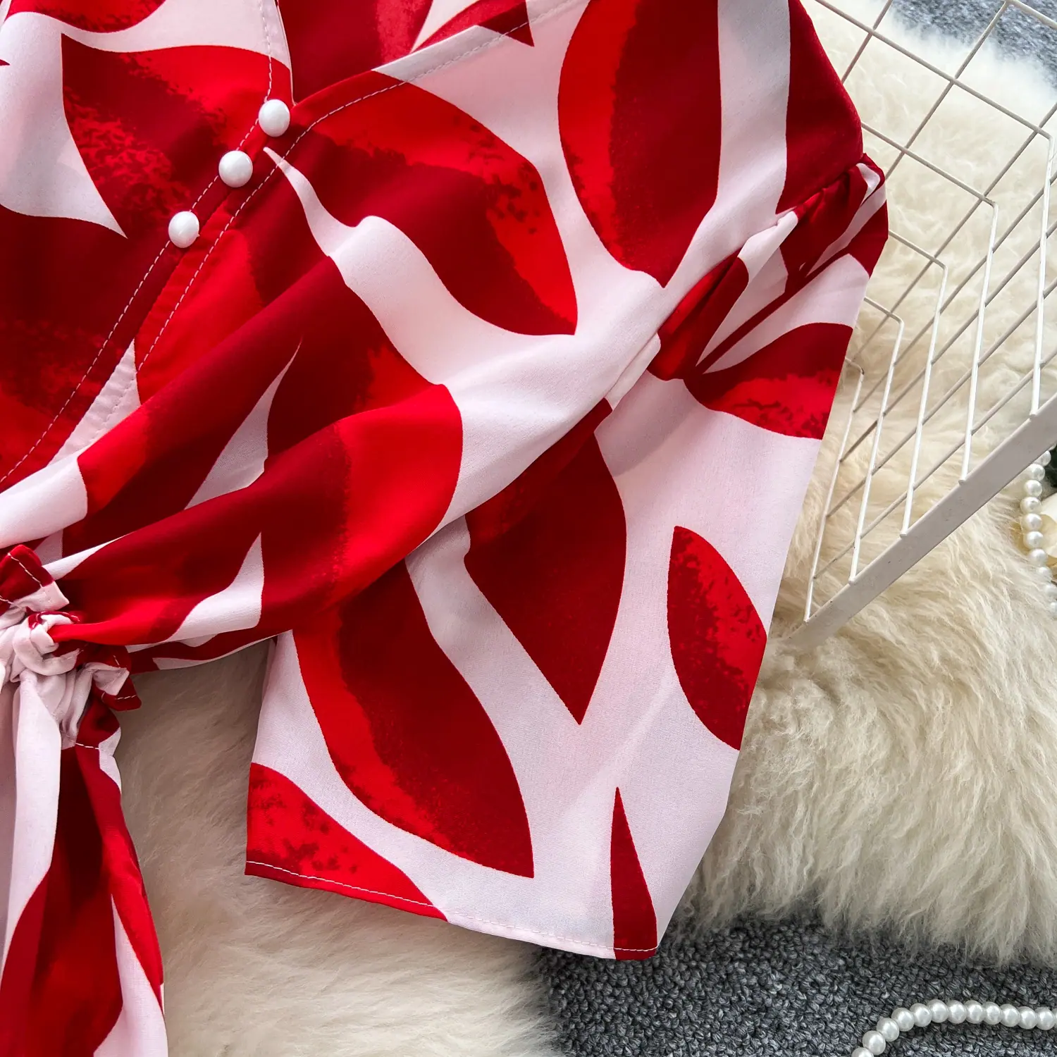 Vestido Francês Retrô Decote V Cintura com Cordão Manga Curta Estampado para Mulheres no Verão Aparência Emagrecedora Vestido Retrô Comprimento no Joelho
