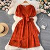 Compre Vestido Doce e Natural para Mulheres com Design Único, Decote V Irregular, Cintura com Amarração, Saia Evasê Emagrecedora, Mangas Curtas Modernas no atacado no Joom.pro
