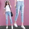 Jeans Rasgados Femininos Primavera e Verão 2024 Calças Nove Pontos Soltas Slim Harem Cós Elástico BF Calças 9 Pontos Tendência