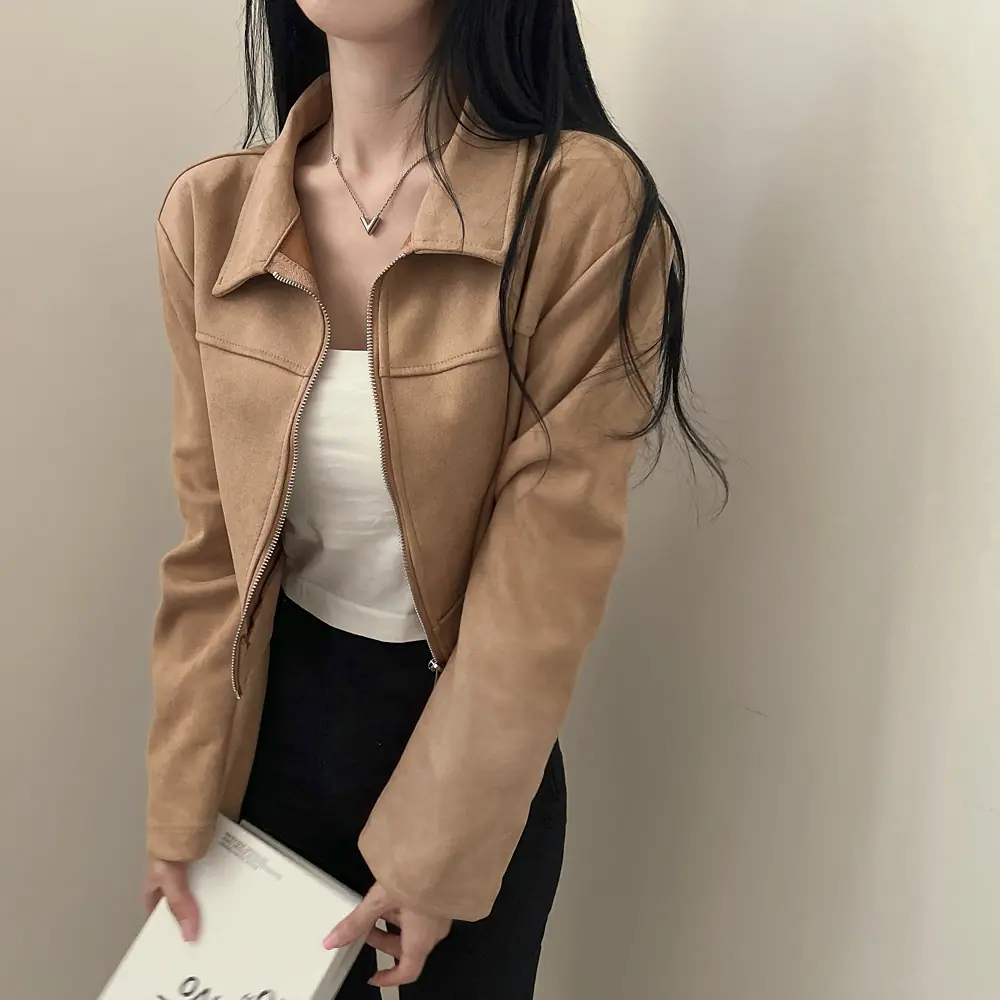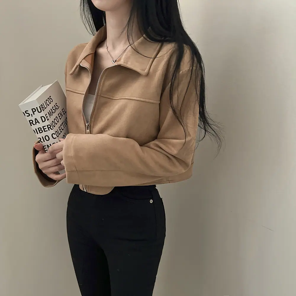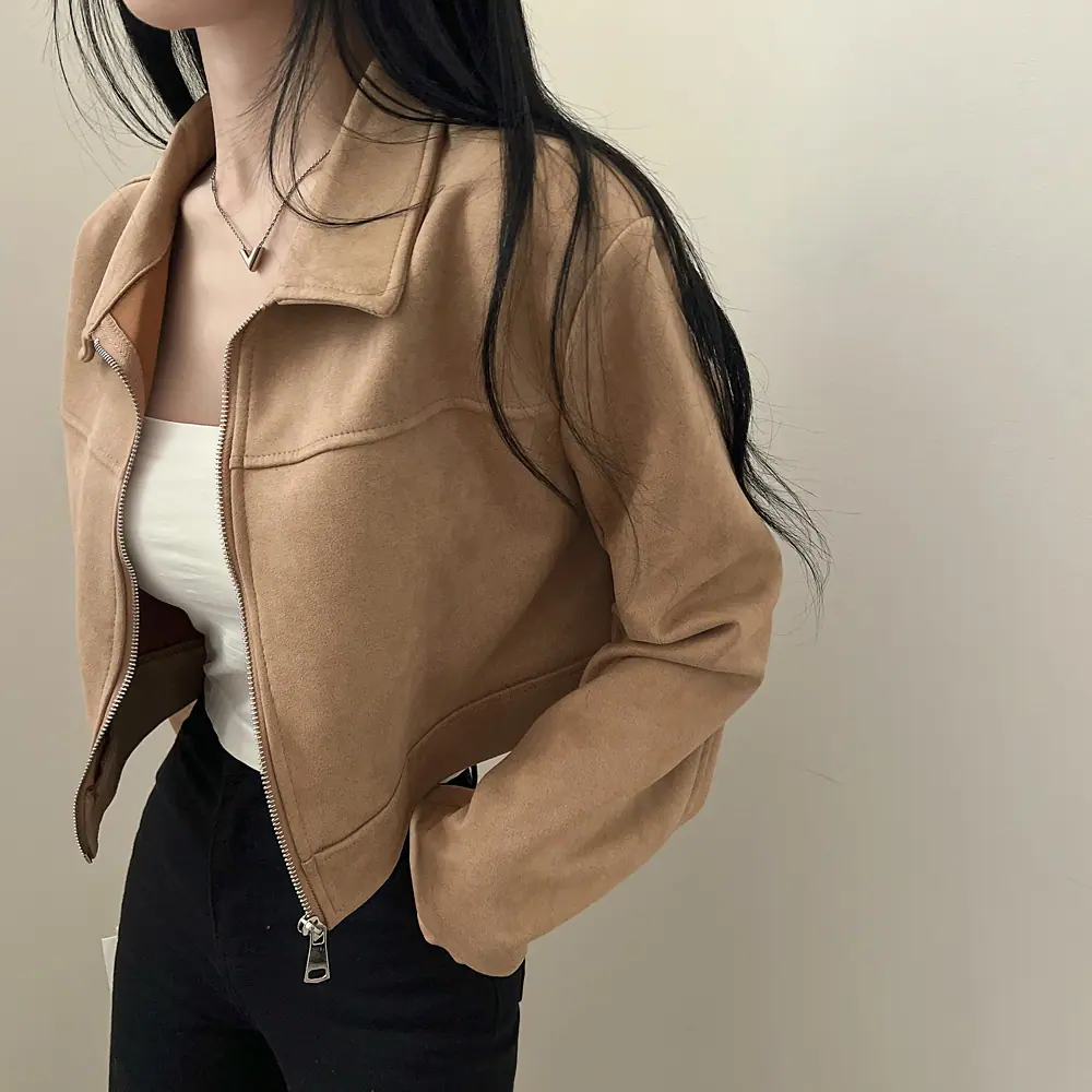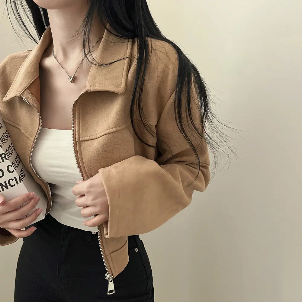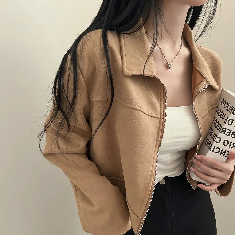 Jaqueta Curta Minimalista Estilo Coreano com Gola Dobrável e Zíper Manga Longa Camurça Sintética Jaqueta Nicho com Senso de Design para Mulher Casaco Curto