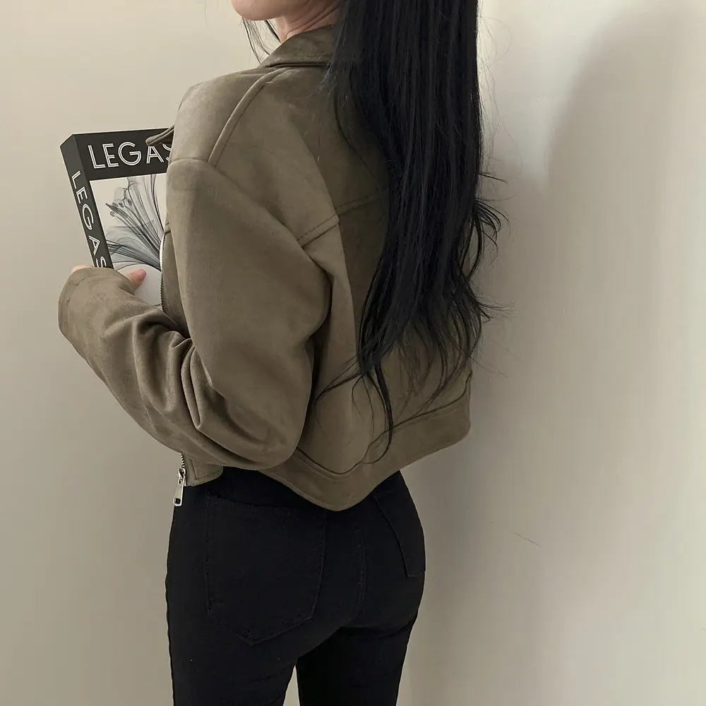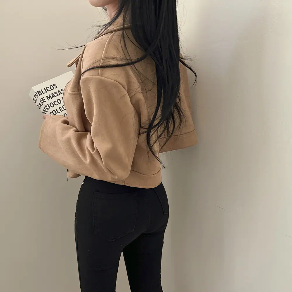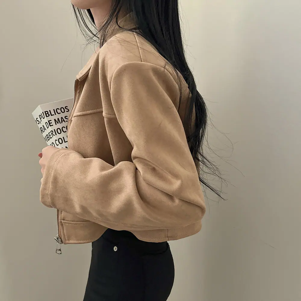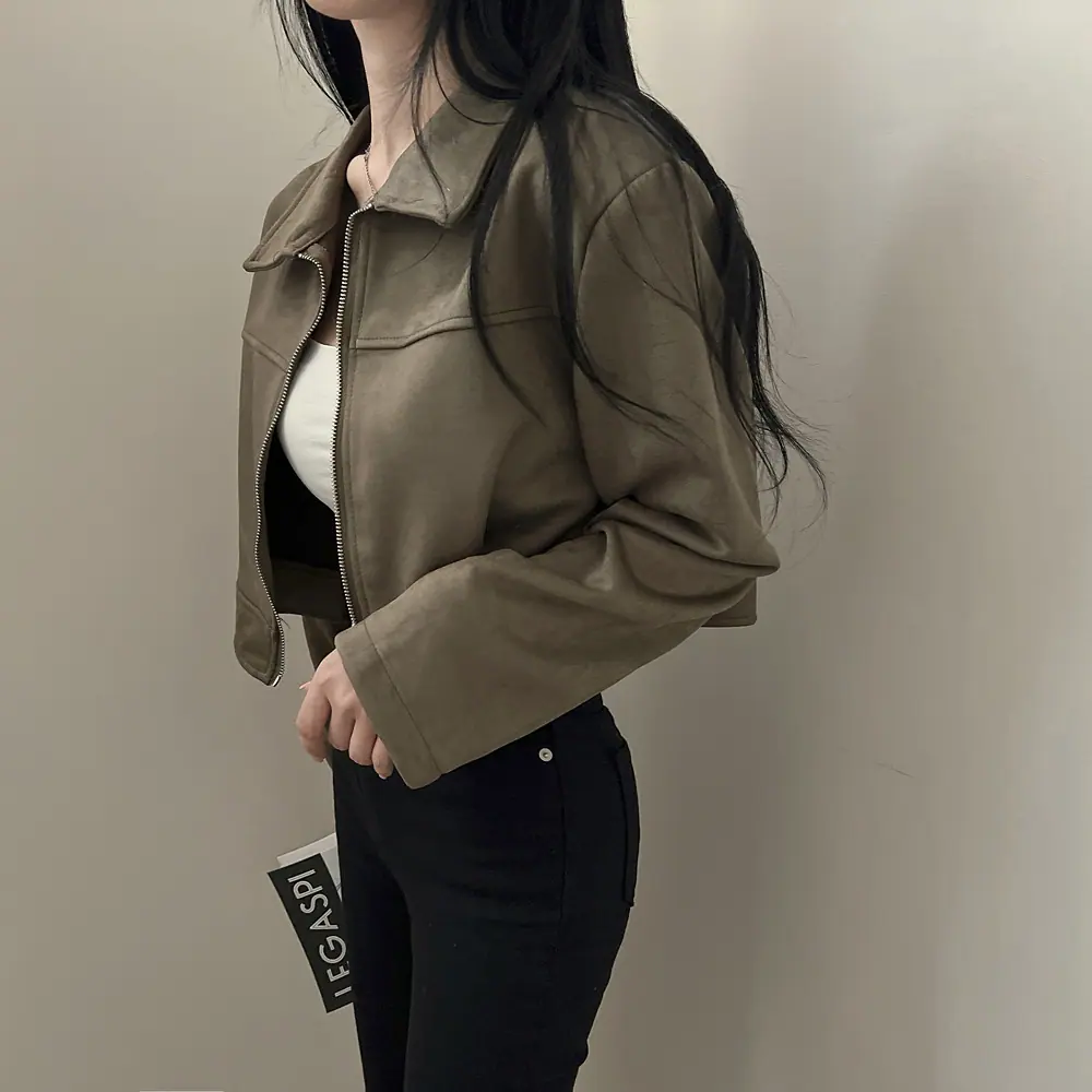Jaqueta Curta Minimalista Estilo Coreano com Gola Dobrável e Zíper Manga Longa Camurça Sintética Jaqueta Nicho com Senso de Design para Mulher Casaco Curto