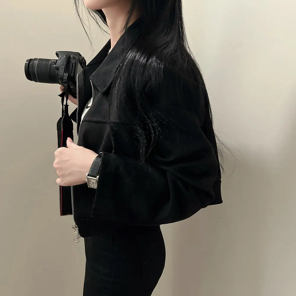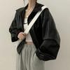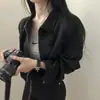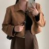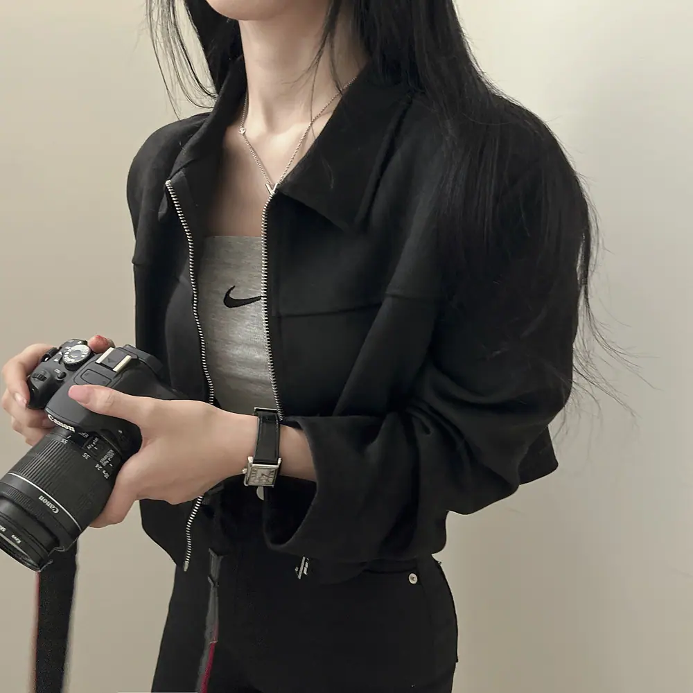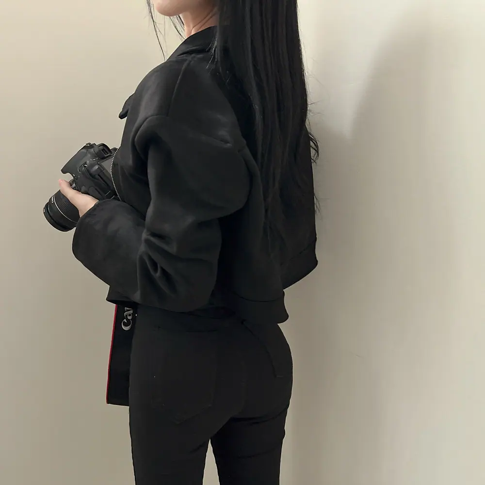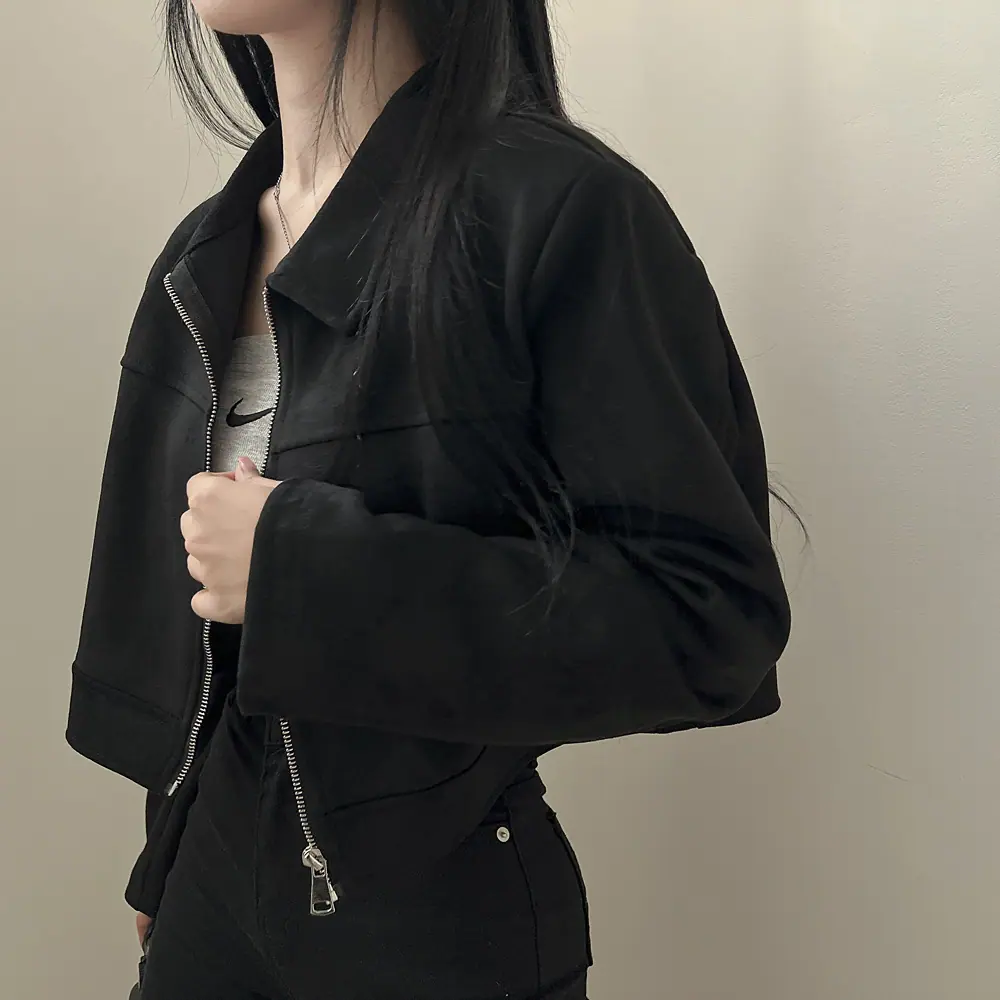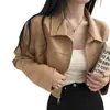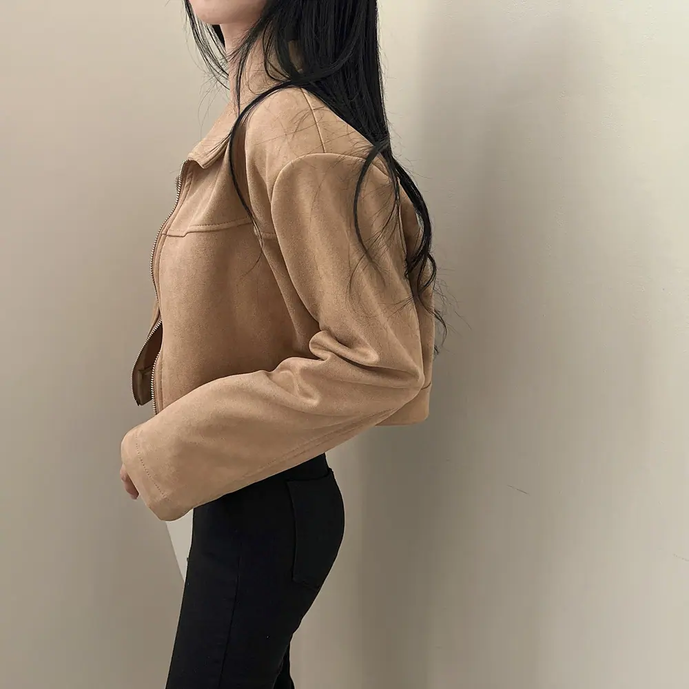 Jaqueta Curta Minimalista Estilo Coreano com Gola Dobrável e Zíper Manga Longa Camurça Sintética Jaqueta Nicho com Senso de Design para Mulher Casaco Curto