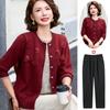 Cardigã de tricô moderno com gola redonda, ideal para mulheres de meia-idade e idosas, estilo outono/inverno. Jaqueta de tricô com efeito de duas peças.
