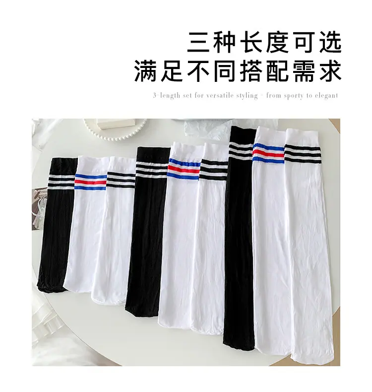 Black mid-length, White with black mid-calf, red and blue striped mid-calf, Black calf, White background black...
