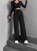 Calças Femininas de Estilo Novo Europeu e Americano 2025 com Cintura Elástica, Listras Finas, Retas e de Perna Larga para Mulheres