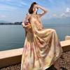 Vestido Longo Estilo Fada Francesa para Férias na Praia com Estampa Amarela Manchas Fluida, Sem Mangas, Decote Halter para Mulheres no Verão