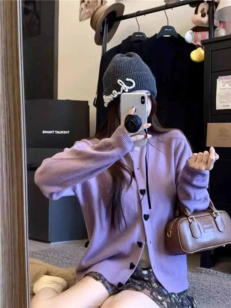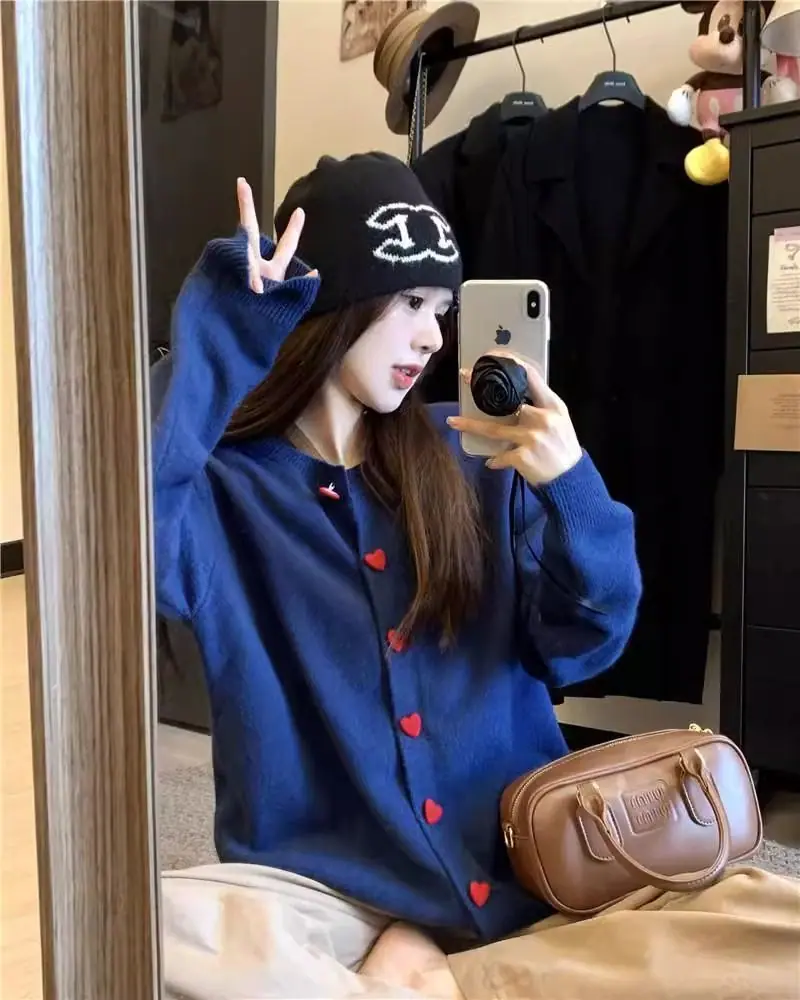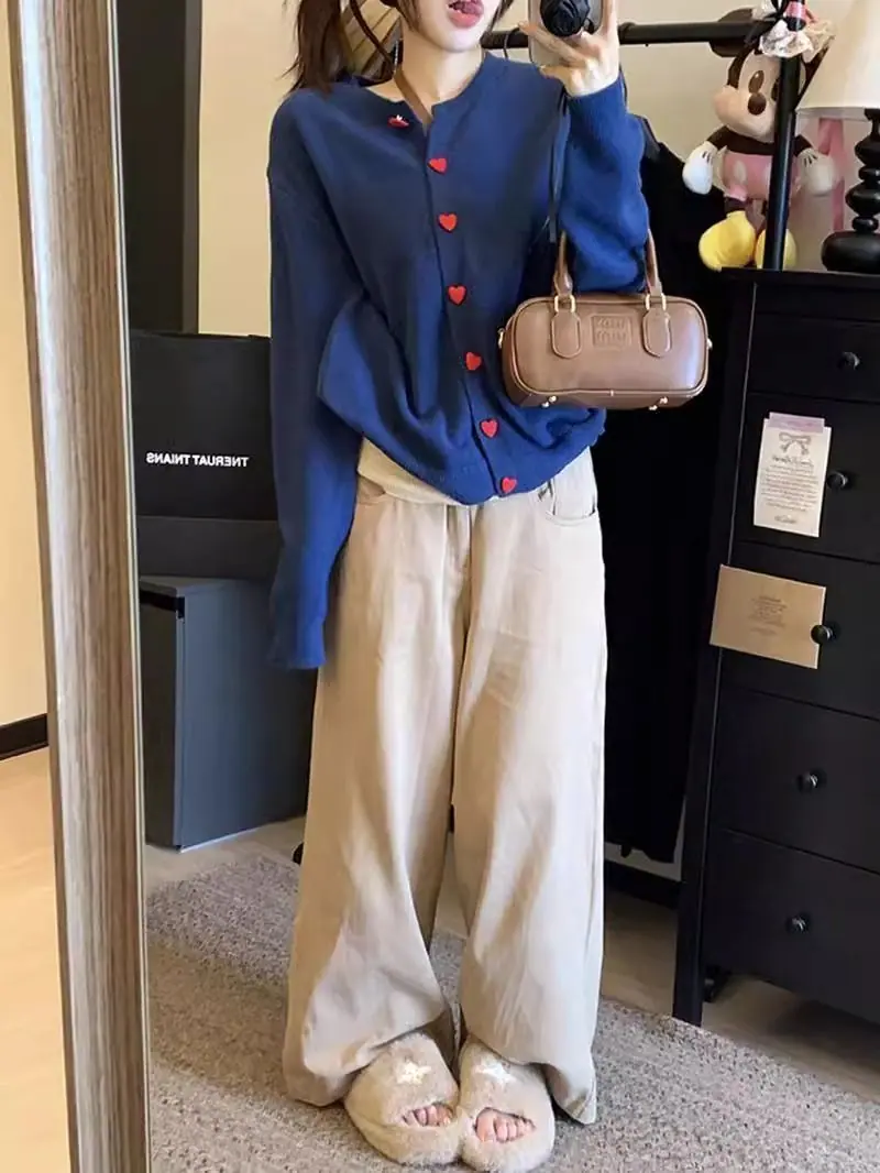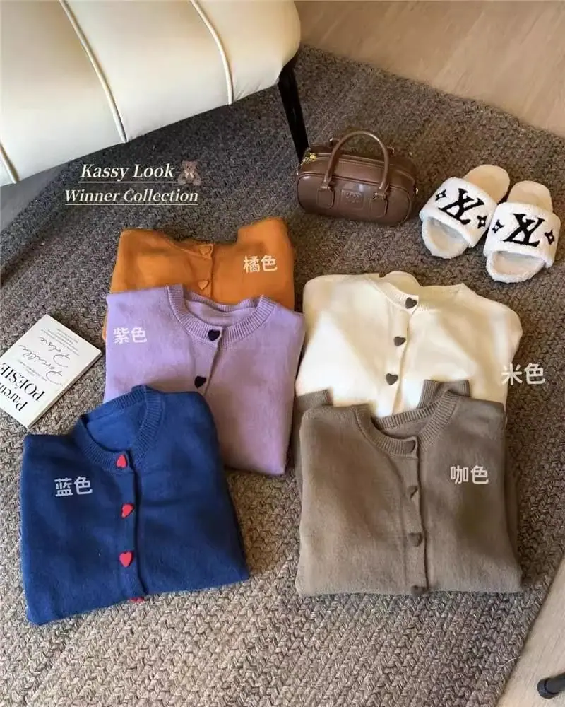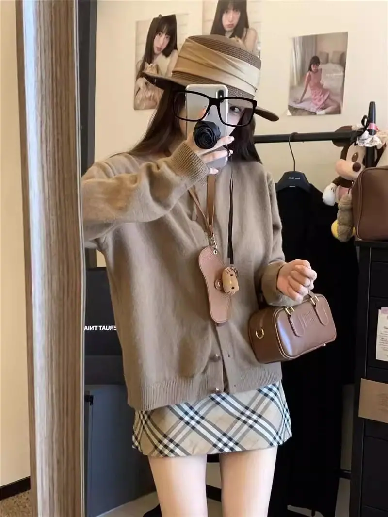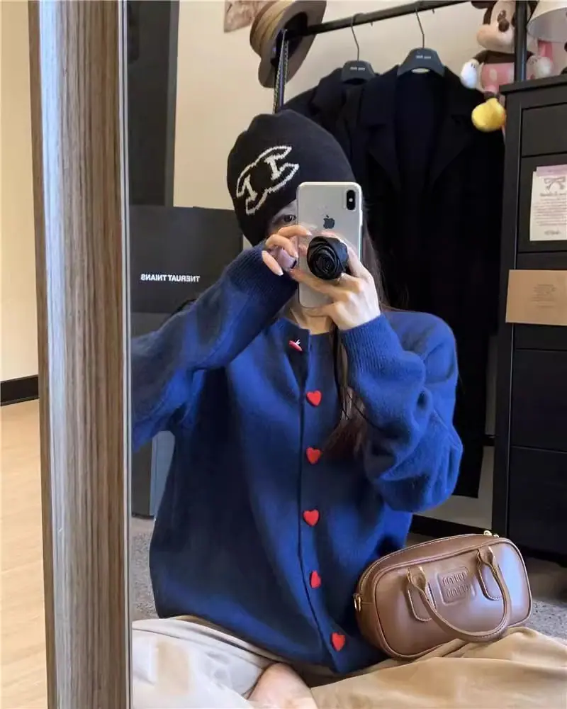 Cardigã de malha de algodão cashmere feminino outono manga longa suéter casaco estilo coreano abotoamento simples gola redonda solto top roupa exterior