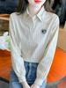 Primavera 2025 Nova Camisa de Algodão Bordada para Mulheres Moda Elegante Feminina Redutora de Idade Camisa Listrada Manga Longa