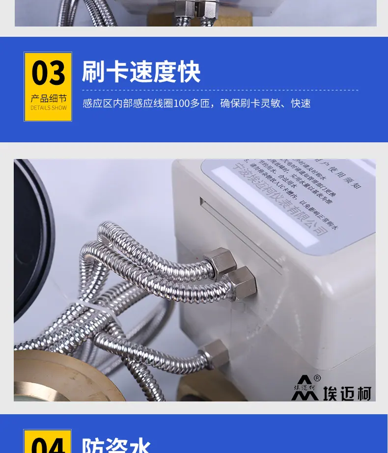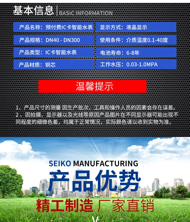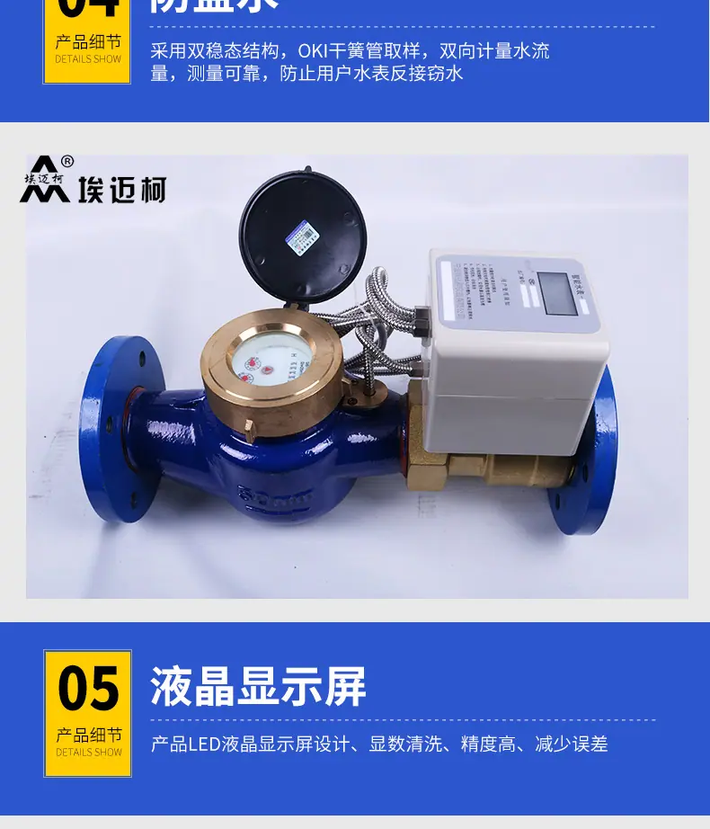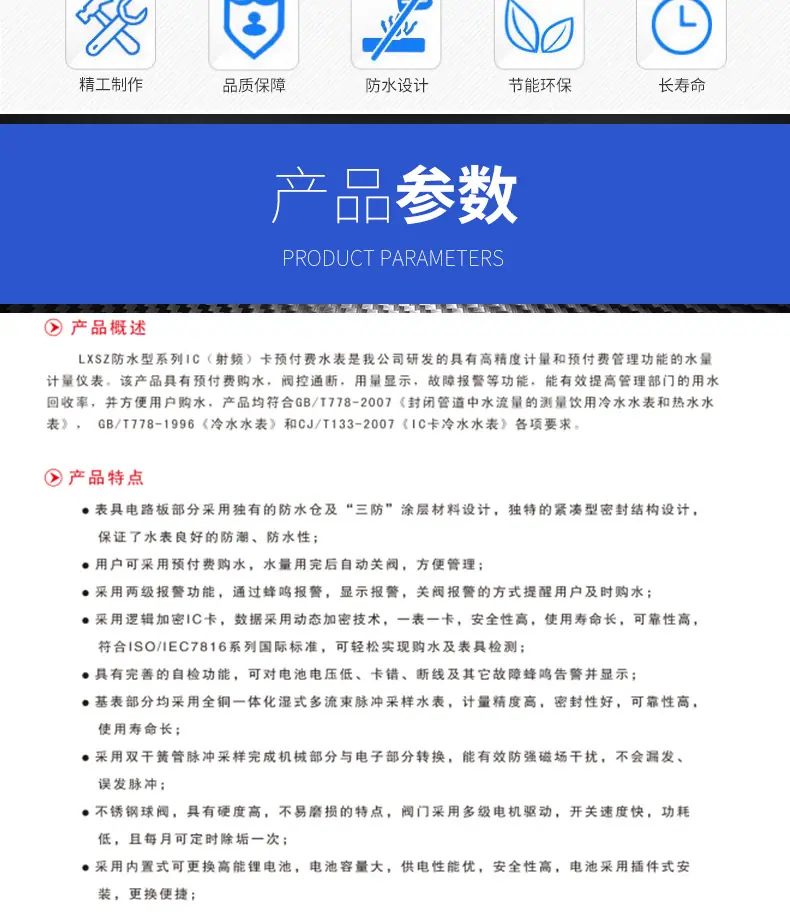 Os produtos da nossa empresa são fabricados de acordo com as disposições relevantes das normas internacionais GB/T778-2007.1-2.3 e regulamentos nacionais de verificação JJB/62-85: Os hidrômetros da marca "Aimaike" produzidos, com sua alta precisão, qualidade confiável, variedade completa, embalagem inovadora e longa vida útil, conquistaram altos elogios da maioria dos usuários: Ao mesmo tempo em que adere ao produto principal hidrômetros comuns, a empresa investiu uma grande quantidade de recursos humanos e materiais para desenvolver novos produtos, como hidrômetros de transmissão remota, hidrômetros antifurto e hidrômetros de alta sensibilidade, e também desenvolveu séries de hidrômetros como hidrômetros de cartão IC e hidrômetros de cartão IC pré-pagos de grande diâmetro com tecnologia avançada.