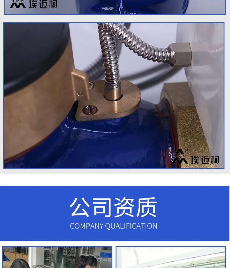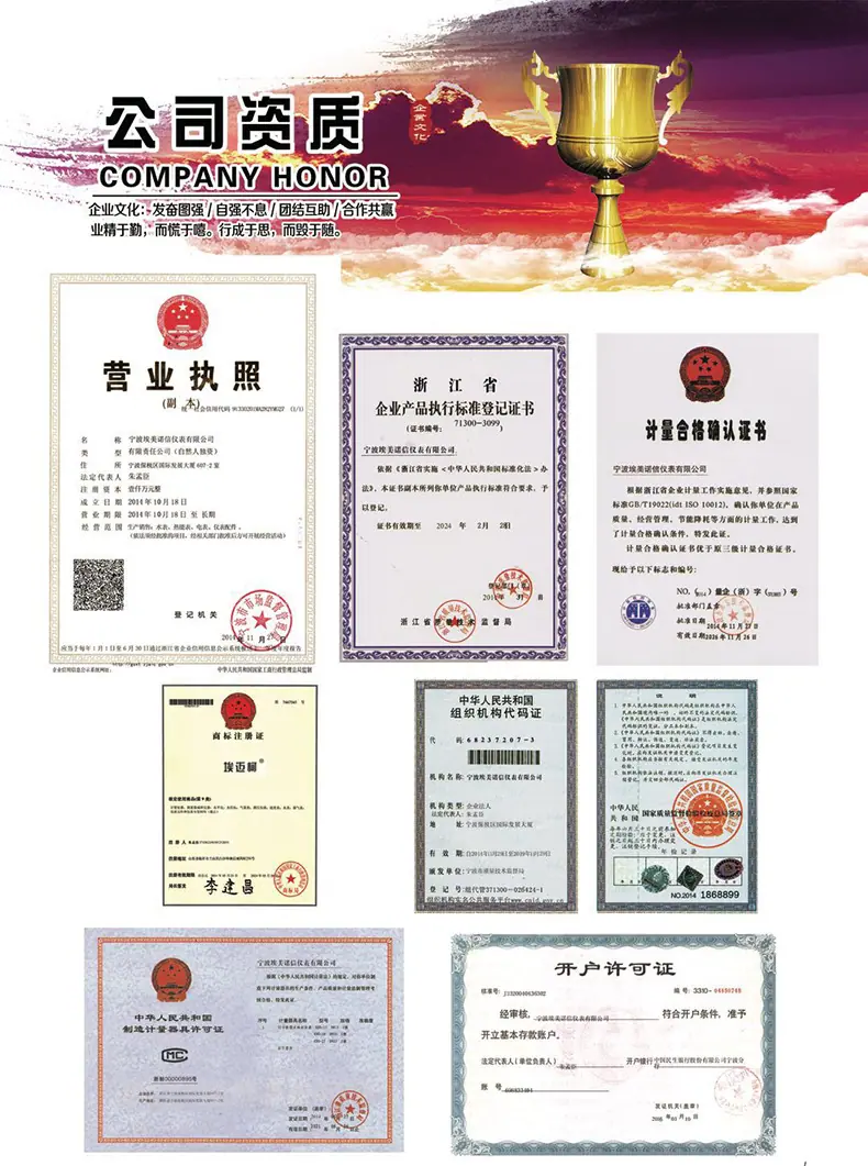 Nossa empresa absorveu e cultivou um grande número de pessoal profissional e técnico de nível médio e superior. Atualmente, a empresa passou com sucesso pela certificação do sistema internacional de qualidade ISO9001, obteve a 《Licença de Higiene para Produtos Envolvendo Higiene e Segurança da Água Potável》 emitida pela Província de Zhejiang e tornou-se uma unidade membro do Comitê de Trabalho de Medidores de Água da Associação de Metrologia da China. Nas inspeções aleatórias especiais de medidores de água organizadas pela Administração Estatal de Regulamentação de Mercado por cinco anos consecutivos, os medidores de água e acessórios da marca "Aimike" foram todos determinados como produtos qualificados.
