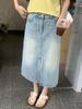 Saia Jeans Slimming Retro Tencel Desbotada com Fenda Frontal para Mulheres, Verão Comprimento Médio Cintura Alta Transfronteiriça Tendência
