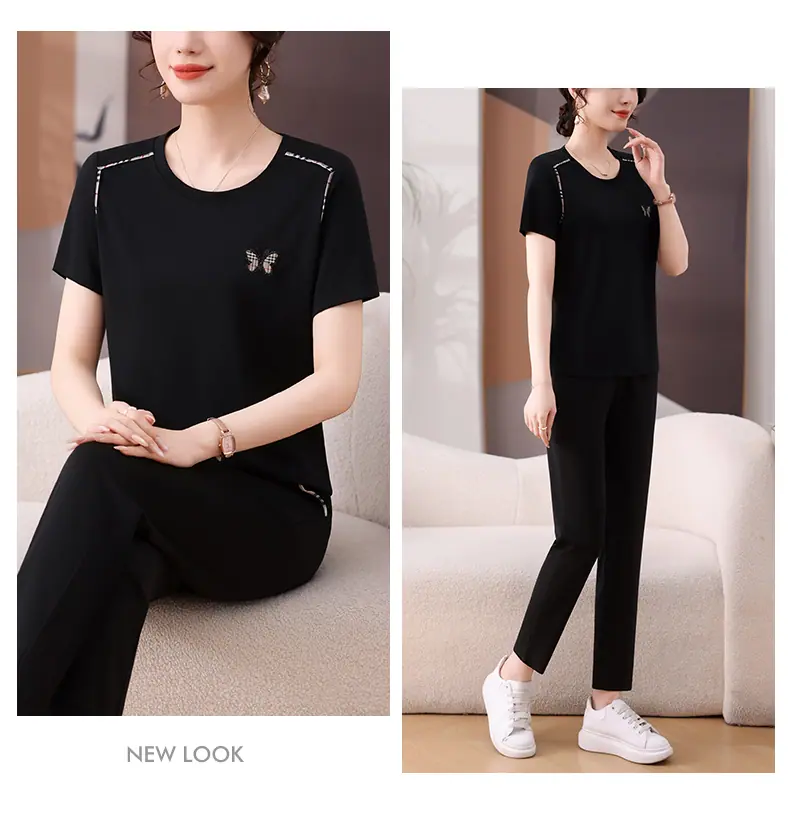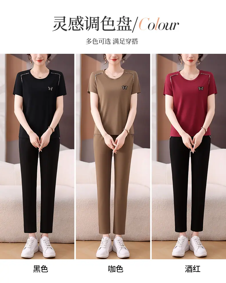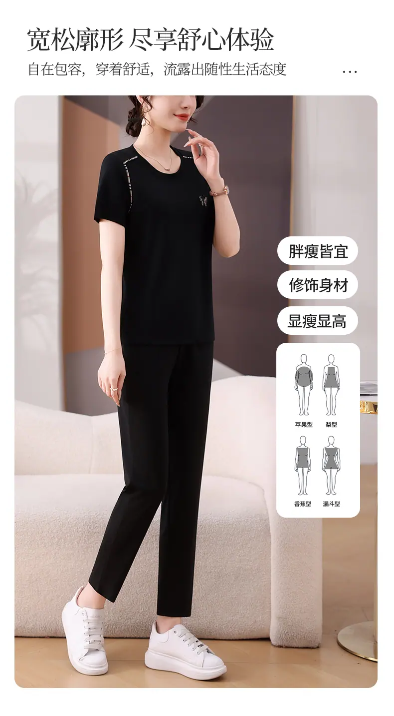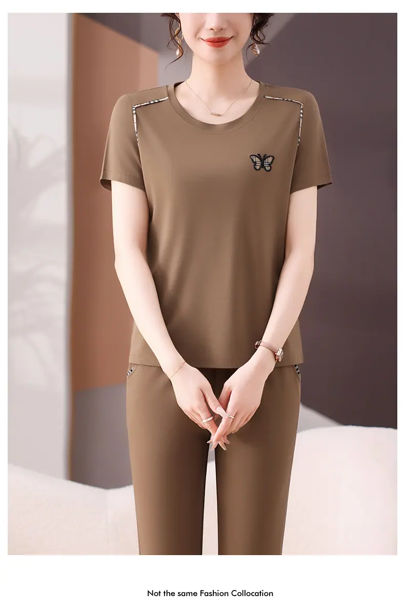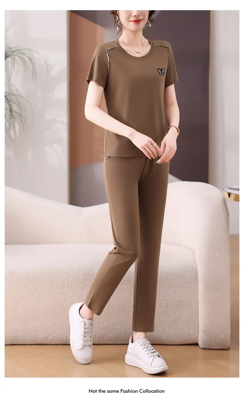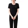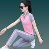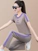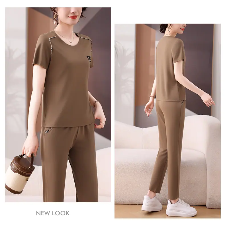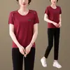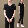 Conjunto Esportivo Casual para Mulheres Verão Moda Novo Gola Redonda Seda Gelo Manga Curta Calças Estilo Ocidental Corrida Conjunto Fino de Duas Peças