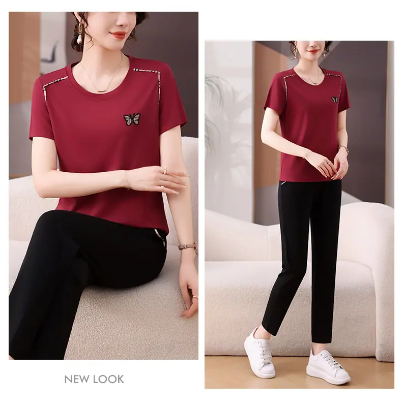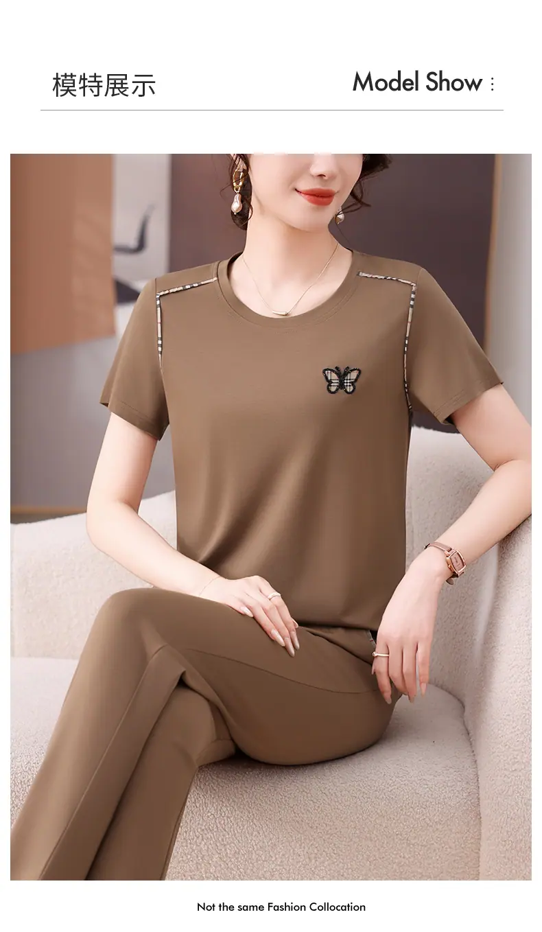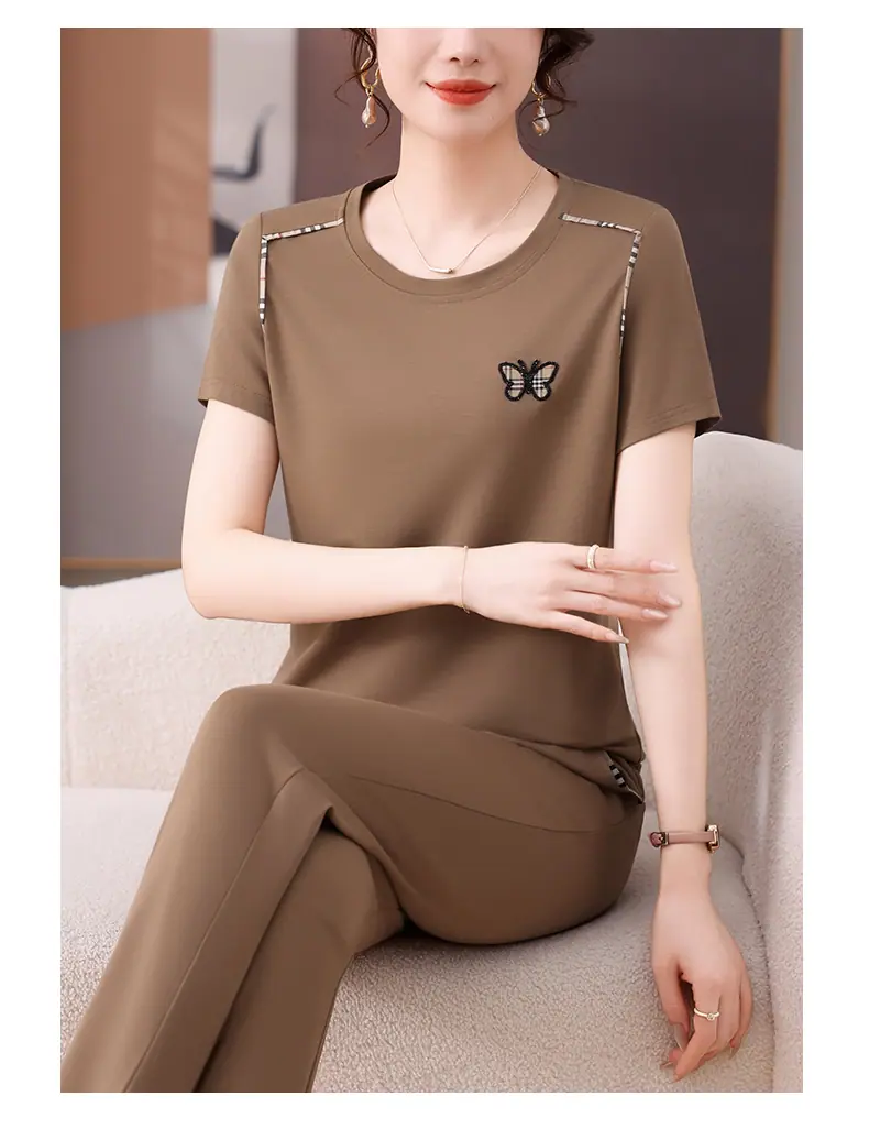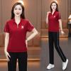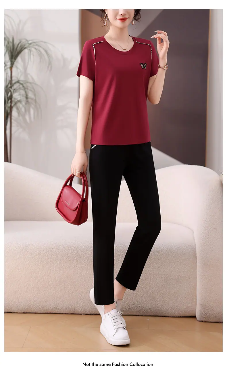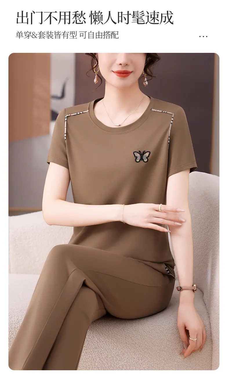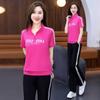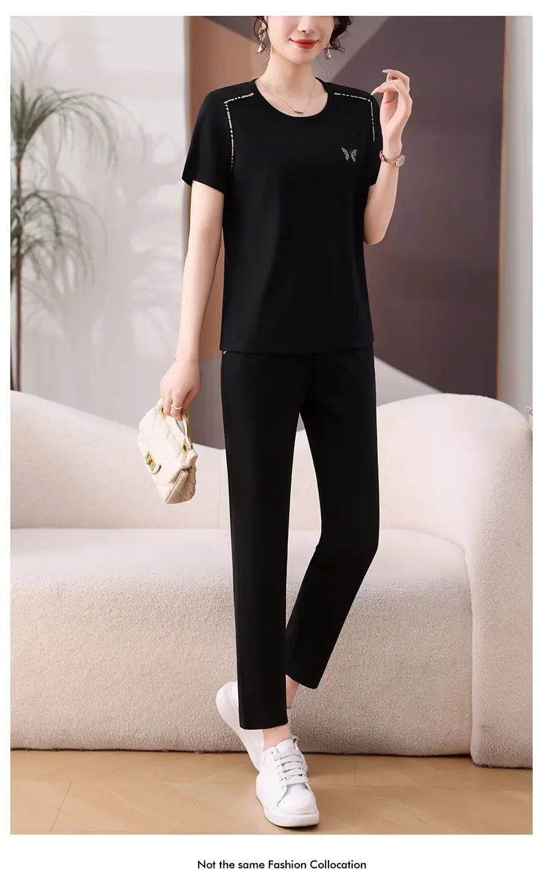 Conjunto Esportivo Casual para Mulheres Verão Moda Novo Gola Redonda Seda Gelo Manga Curta Calças Estilo Ocidental Corrida Conjunto Fino de Duas Peças