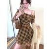 Vestido Xadrez Francês de Ombro Inclinado e Manga Comprida para Mulheres no Novo Estilo de Outono, Lindo Elegante, Visual Emagrecedor na Cintura, Saia Curta com Babados