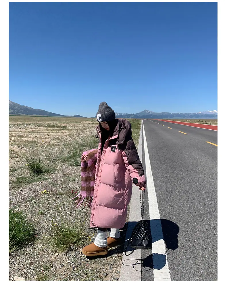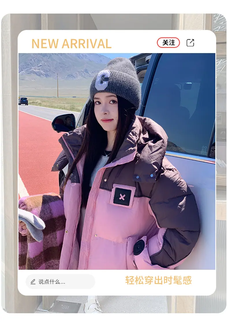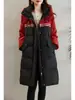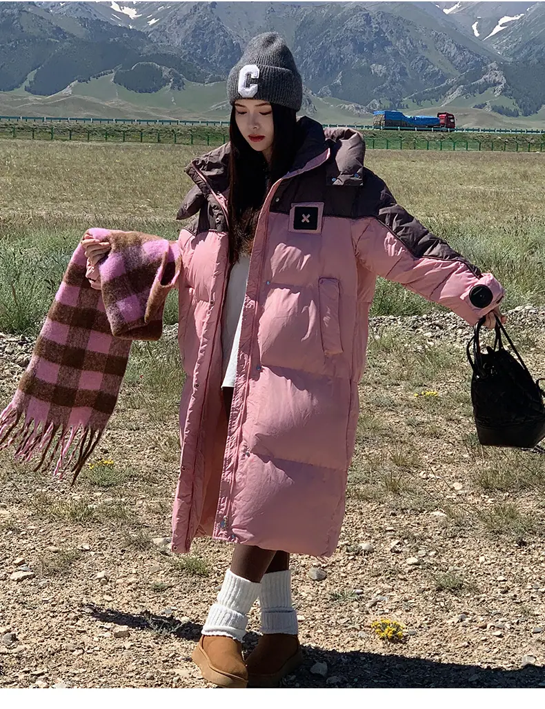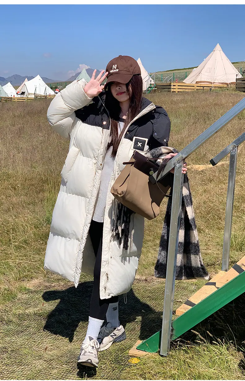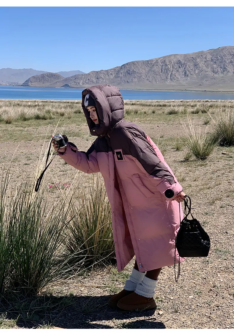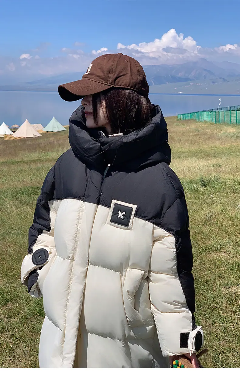 2025 Novo Inverno Feminino Estilo Coreano Grosso Solto Algodão Comprimento Médio Bloco de Cores Moda Patchwork Jaqueta com Capuz Tendência