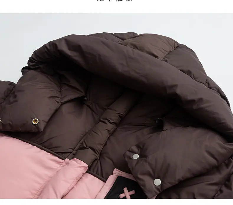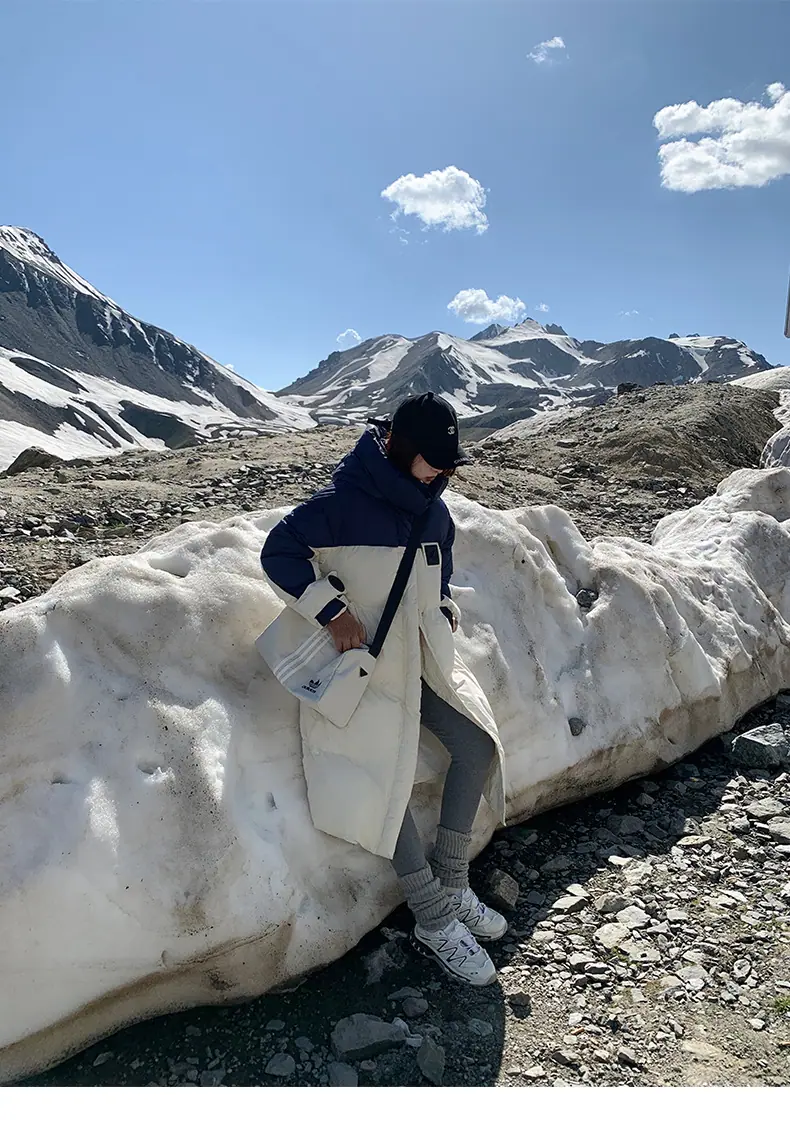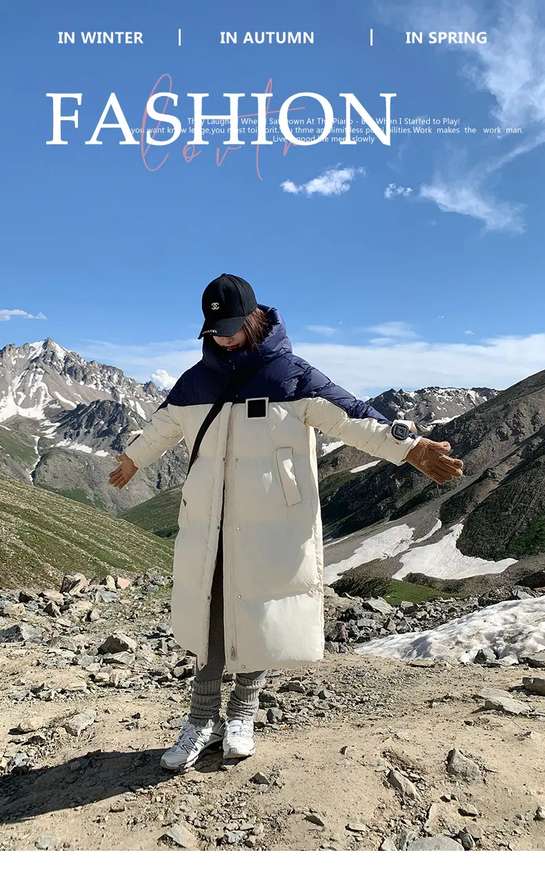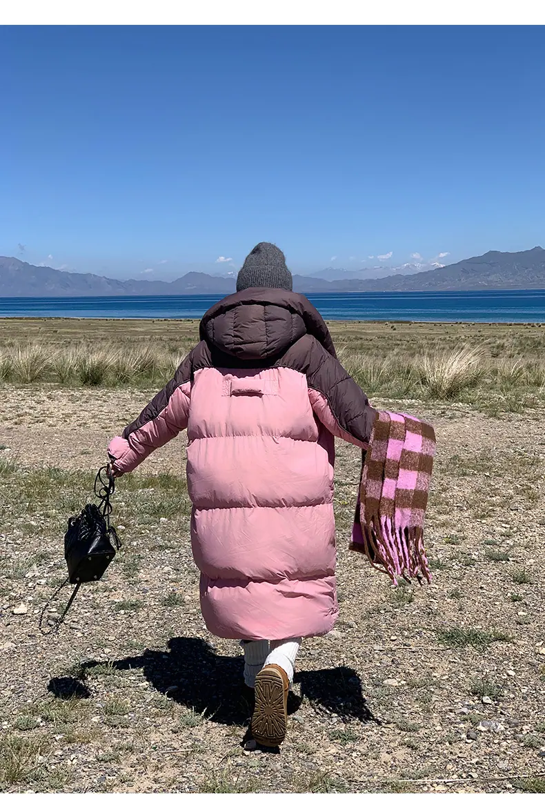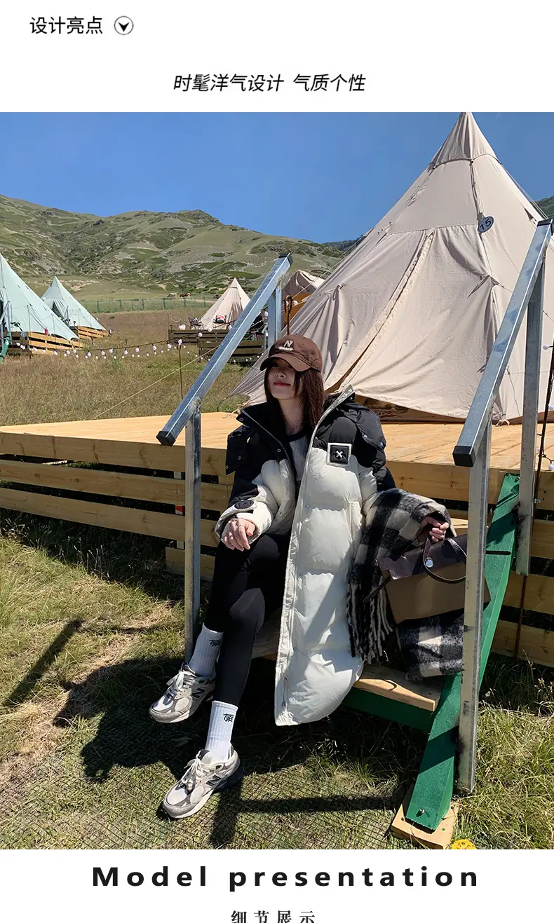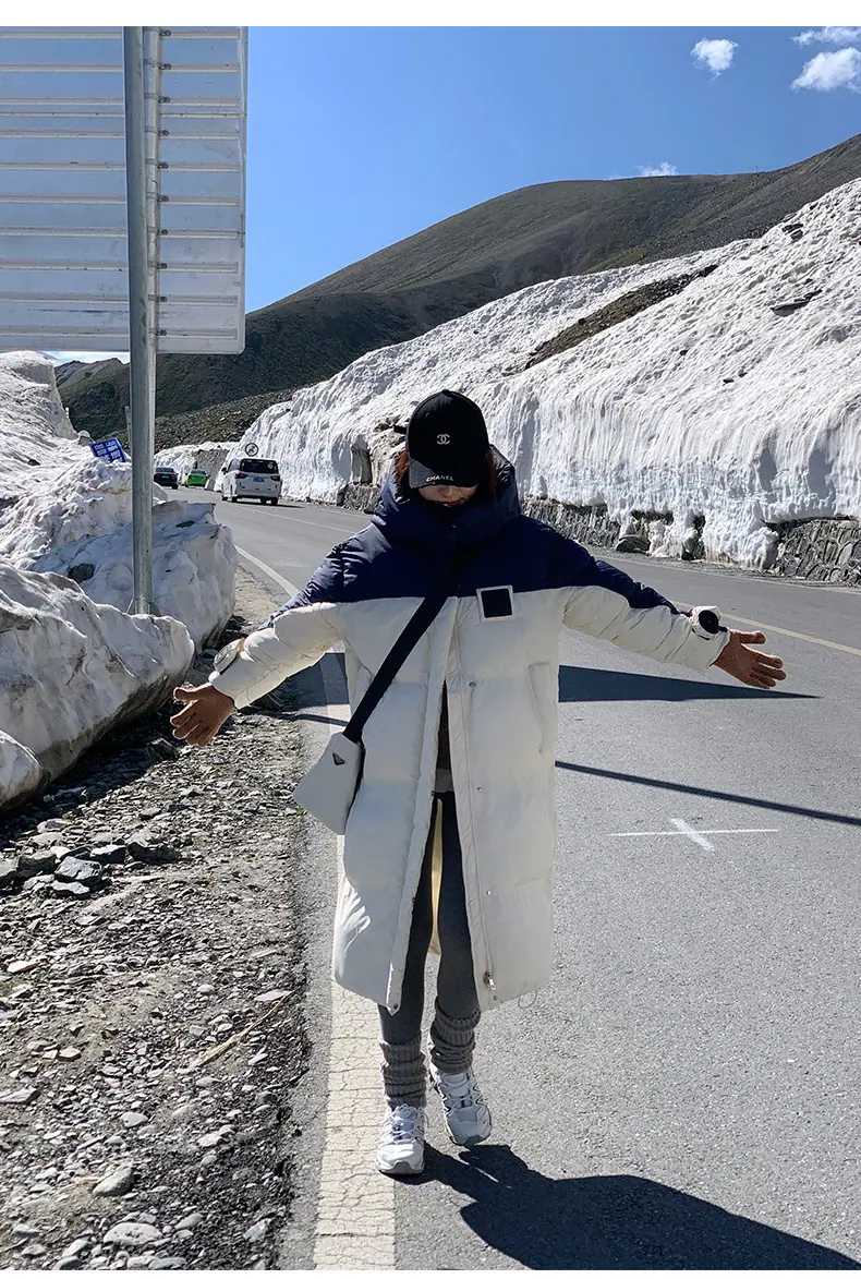2025 Novo Inverno Feminino Estilo Coreano Grosso Solto Algodão Comprimento Médio Bloco de Cores Moda Patchwork Jaqueta com Capuz Tendência