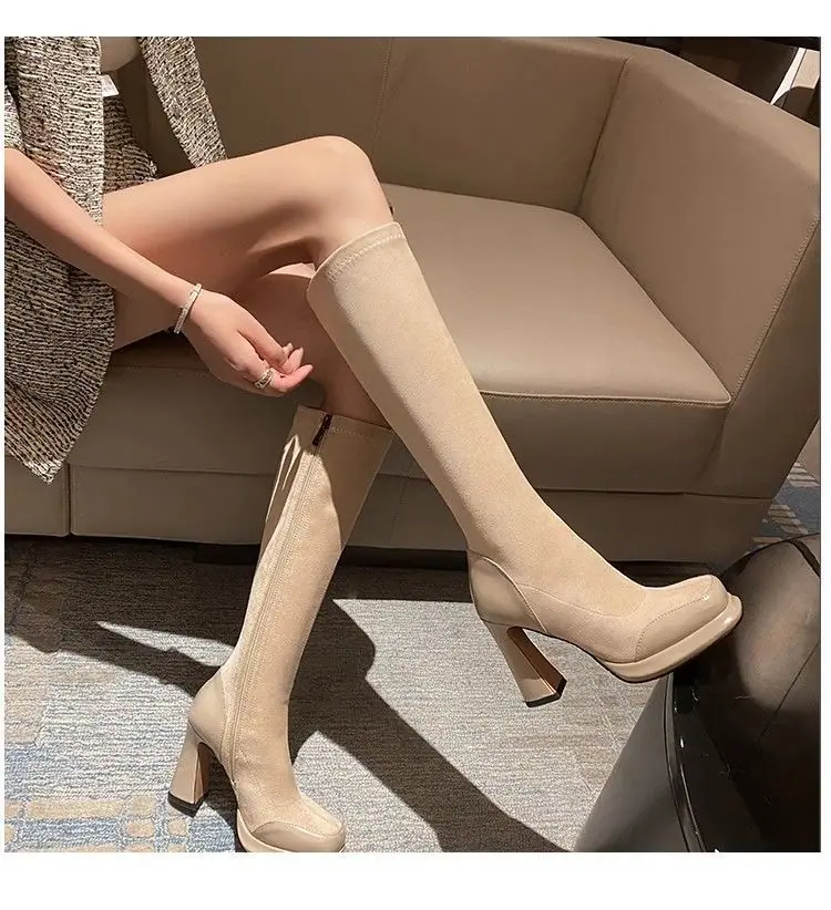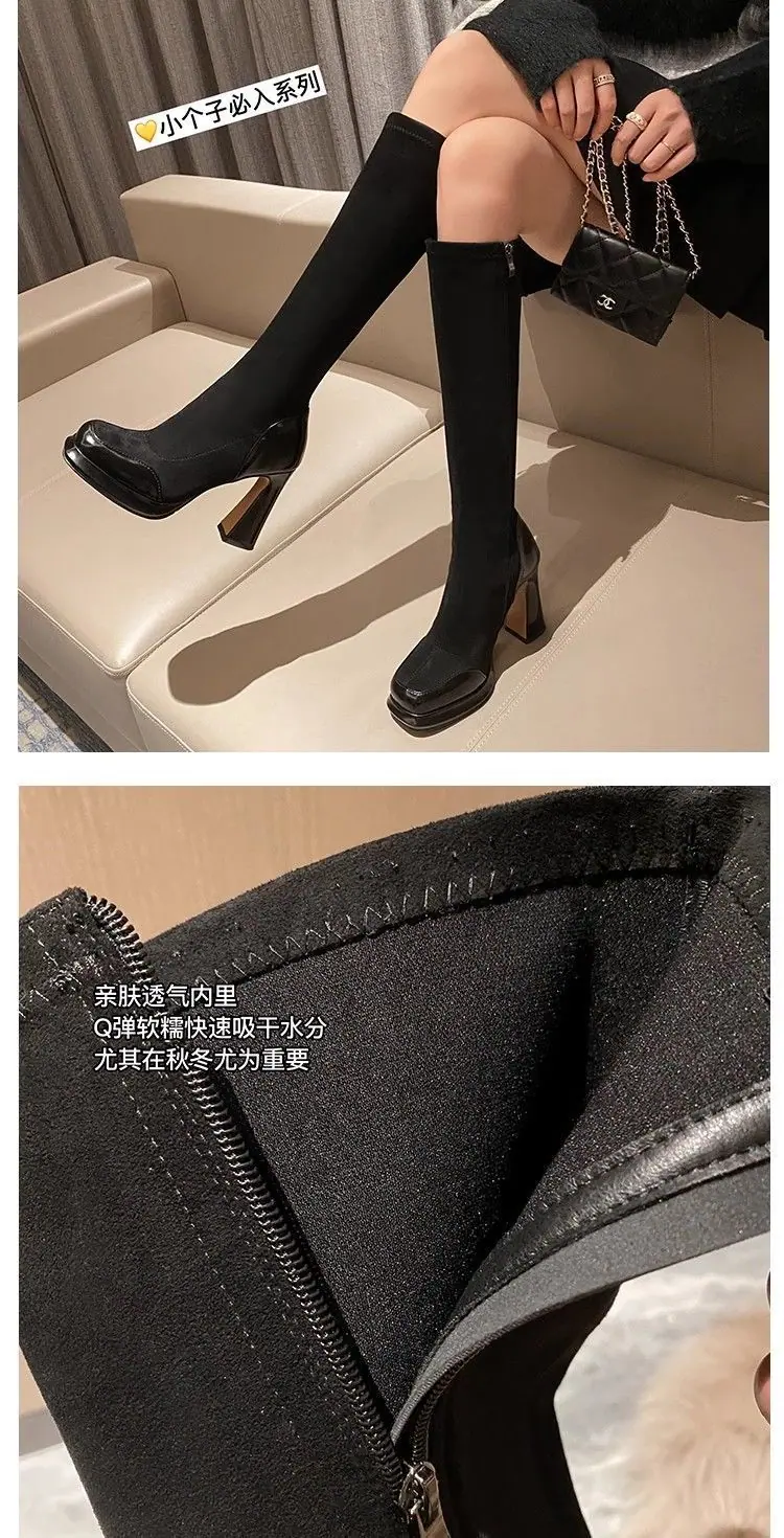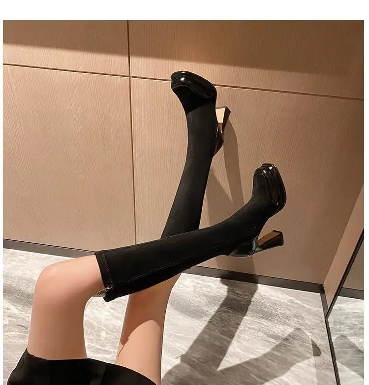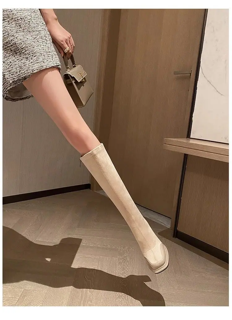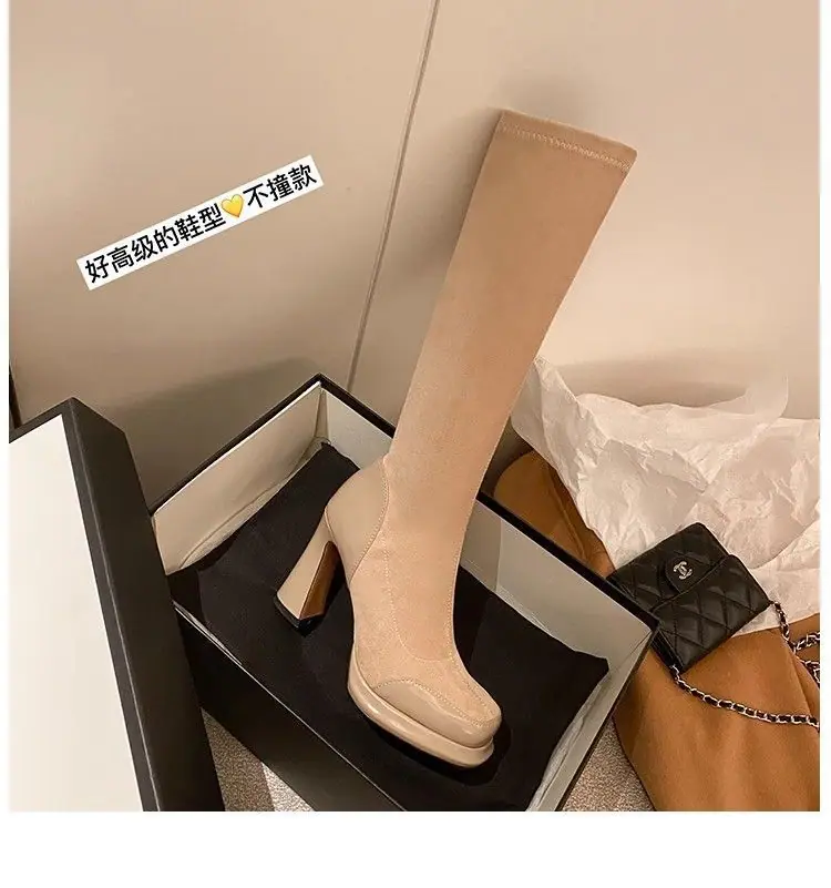 Outono e Inverno Salto Alto Camurça Novo Emagrecimento 2024 Elástico Cano Alto Salto Grosso Bota de Cano Alto até o Joelho Estilo Hepburn Bota Francesa Emagrecedora