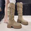 Botas de Cavaleiro com Franjas Estilo Wasteland Retrô para Mulheres 2025 Novas Botas de Cano Alto com Salto Grosso Efeito Emagrecedor Botas Western Altas