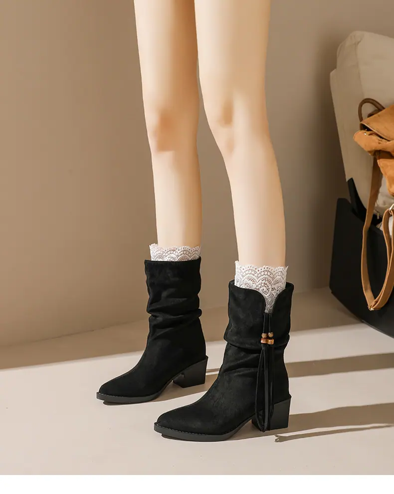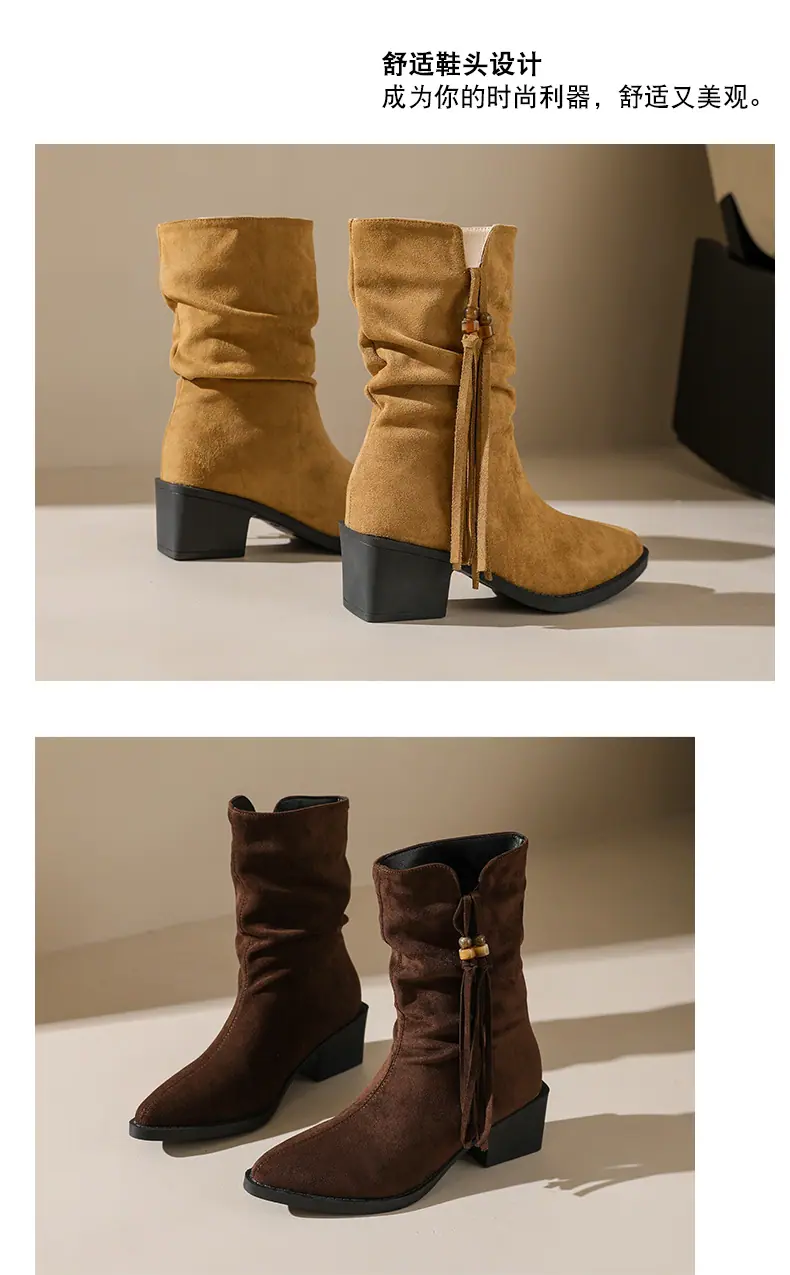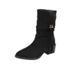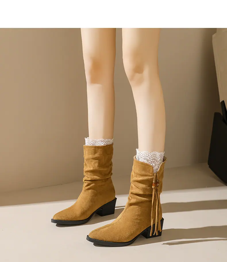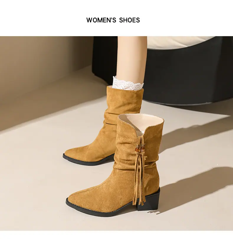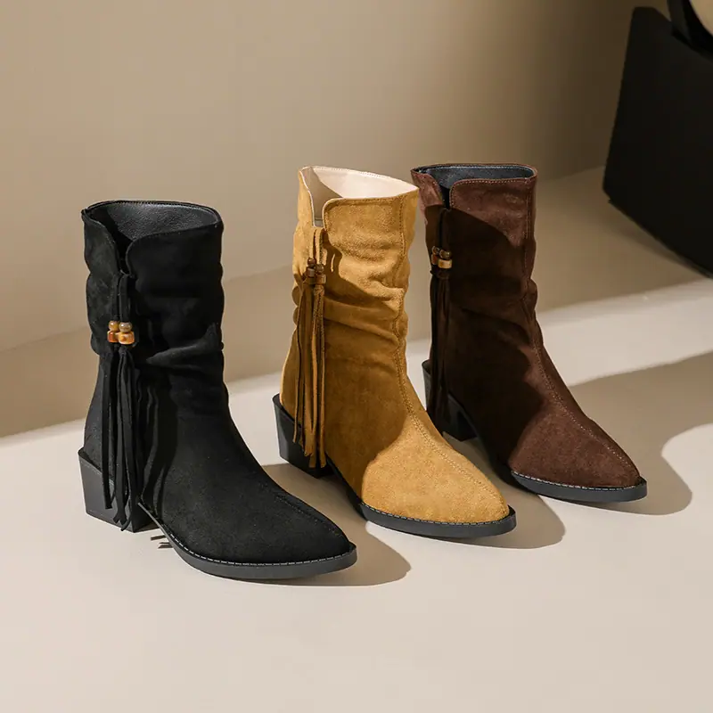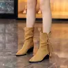Outono/Inverno 2025 Novo Bico Fino Salto Grosso Borla Camurça Botas Cowboy Ocidentais Cano Curto Franzido Empilhadas Femininas