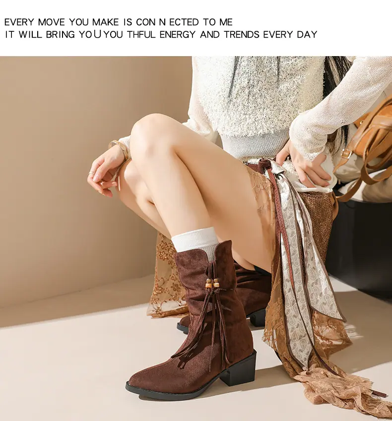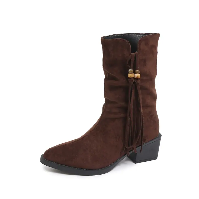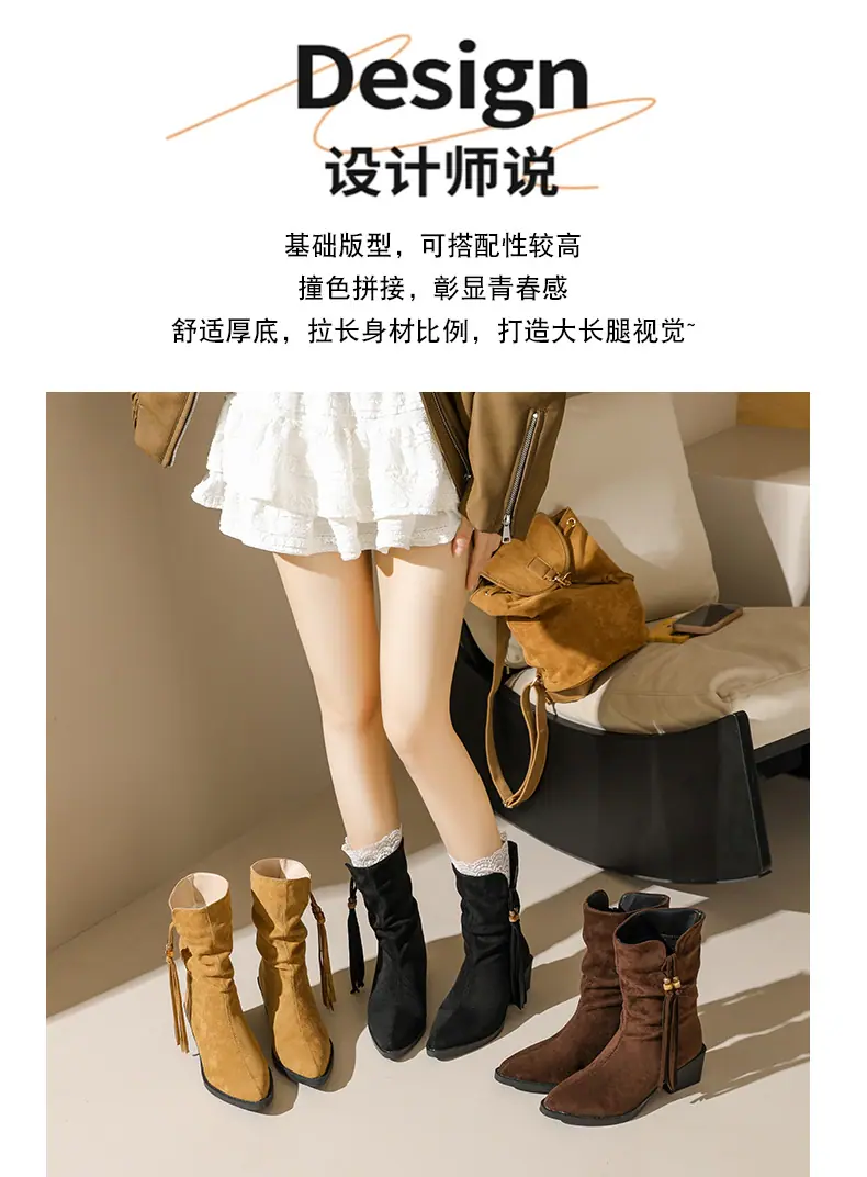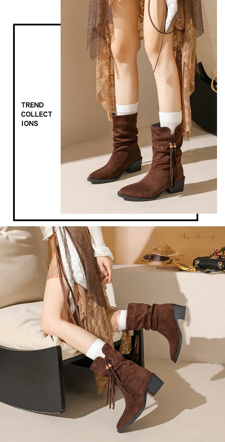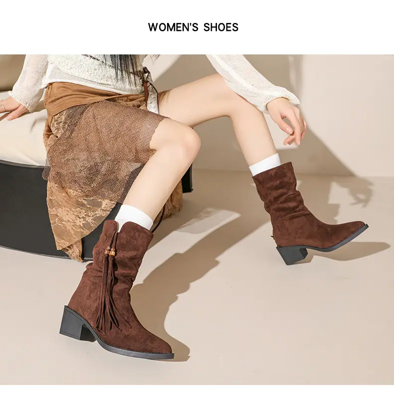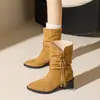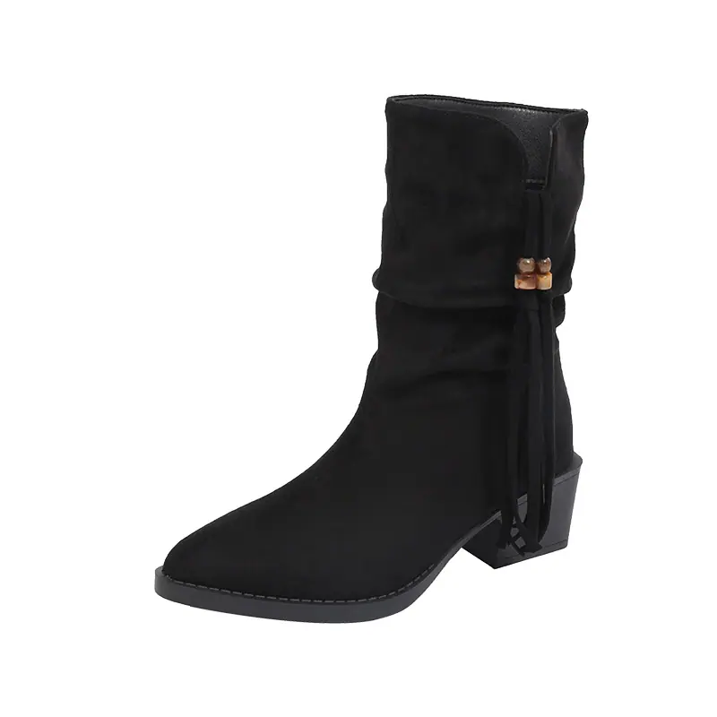 Outono/Inverno 2025 Novo Bico Fino Salto Grosso Borla Camurça Botas Cowboy Ocidentais Cano Curto Franzido Empilhadas Femininas