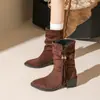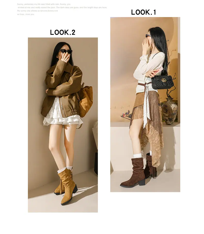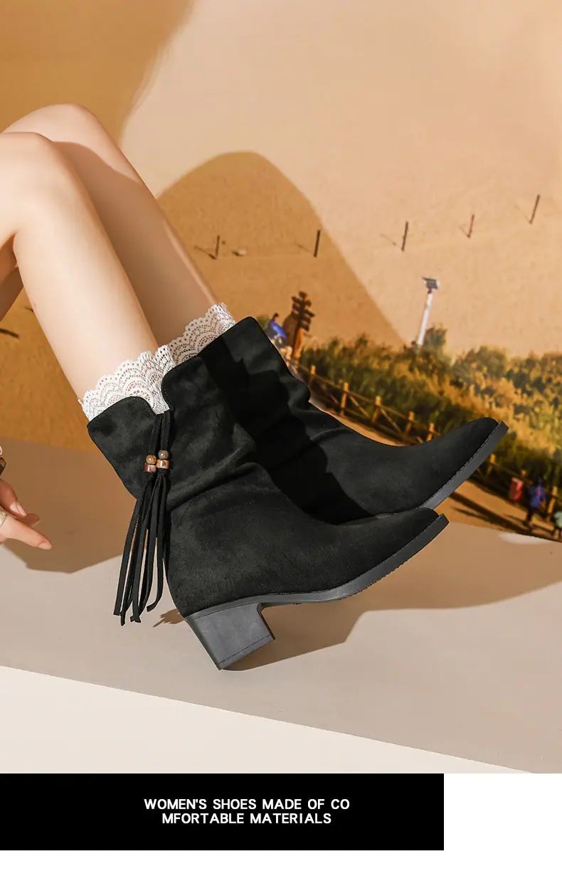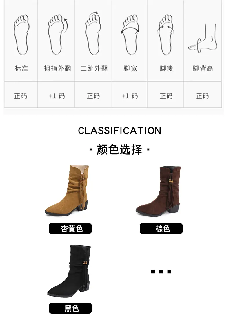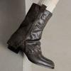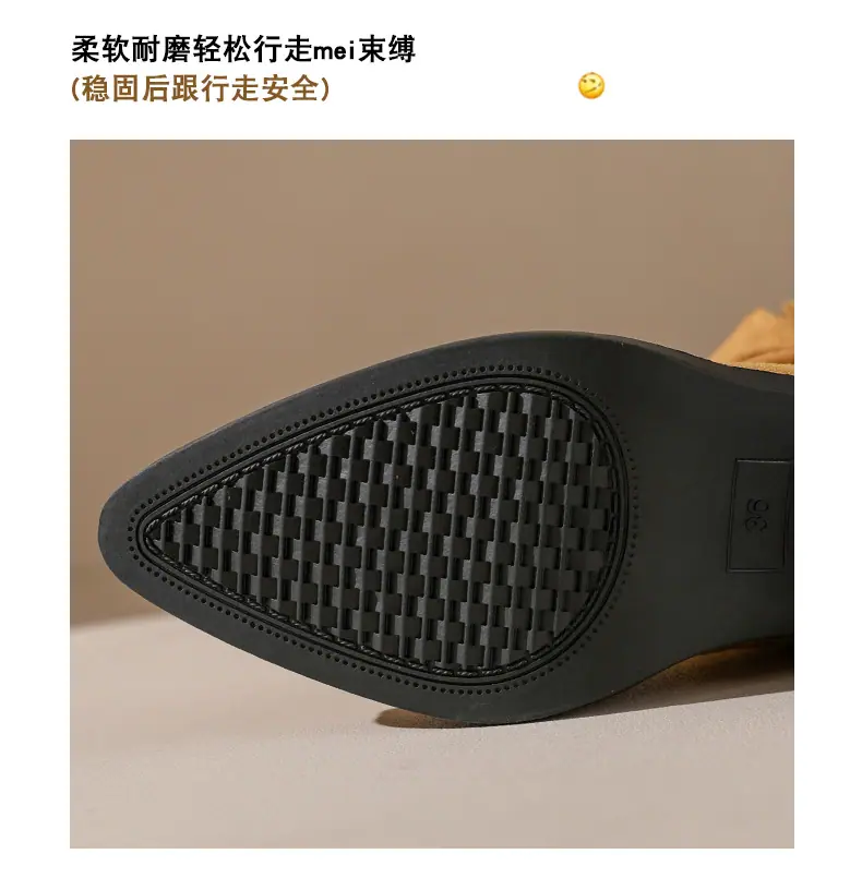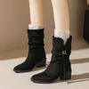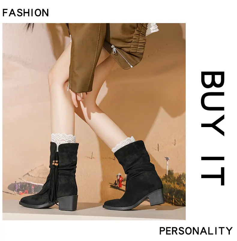 Outono/Inverno 2025 Novo Bico Fino Salto Grosso Borla Camurça Botas Cowboy Ocidentais Cano Curto Franzido Empilhadas Femininas