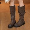 Botas de Montaria Retro de Bico Redondo e Salto Grosso para Mulheres 2025 Novas Botas Versáteis de Cano Médio com Fivela de Cinto Botas Longas Botas Folgadas