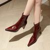 2025 Novo Estilo Botas Curtas Vinho Salto Grosso para Mulheres Bico Fino Botas Nude Couro Brilhante Elegantes da Moda Salto Alto Elásticas Botas Ajustadas