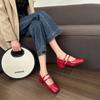 Sapatos Femininos Mary Jane de Bico Quadrado e Decote Baixo Moda 2025 Primavera/Verão Novo Estilo Salto Médio Grosso Tira Única Verniz Sapatos Brilhantes